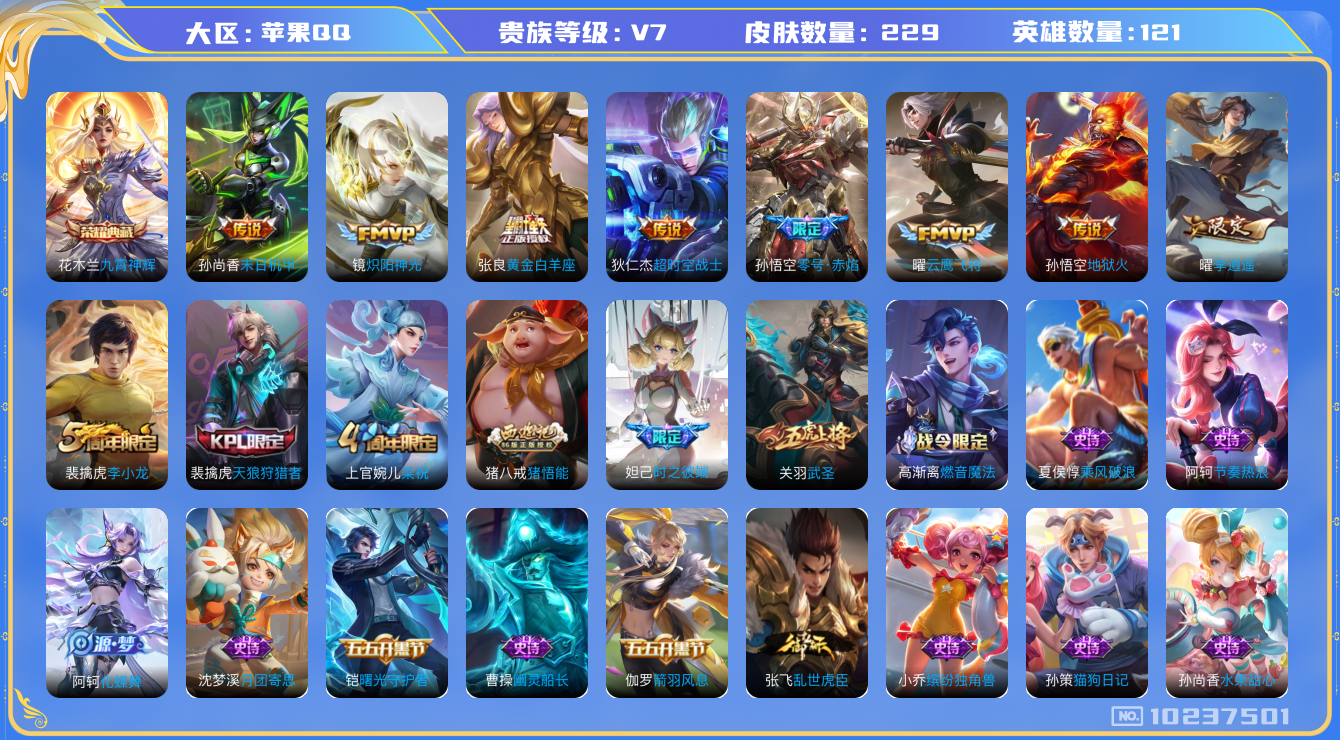 [10237501]v7 1典藏 9传说 121英雄 229皮肤 可修改实名 荣耀水晶:九霄神辉木兰典藏 传说皮:李黄金白羊座零号·赤焰地狱火末日机甲-孙尚香绿蚂蚱云鹰飞将小将军炽阳神光超时空战士-狄仁杰 珍宝阁皮:妄想食味优雅恋人 限定皮:时之彼端武圣梁祝天狼狩猎者李小龙猪悟能 史诗皮:星界战将化蝶舞蔬乡物语鲁班七号黄金分割率特工魅影千年之狐百解令蒙犽高渐离燃音魔法蒙恬荣光圣徽偶像歌手晚萤魅语末日机甲-吕布猫狗日记-孙策乱世虎臣节奏热浪修罗水果甜心天才门将星夜王子暗隐猎兽者幽灵船长鬼剑武藏心灵战警舞动绿茵纤云弄巧繁星吟游呼啦呼啦拒霜思缤纷独角兽乘风破浪月团寄思曙光守护者热力回旋箭羽风息金属风暴原初追逐者圣诞狂欢圣诞恋歌鹰眼统帅魅力维加斯黎明之约