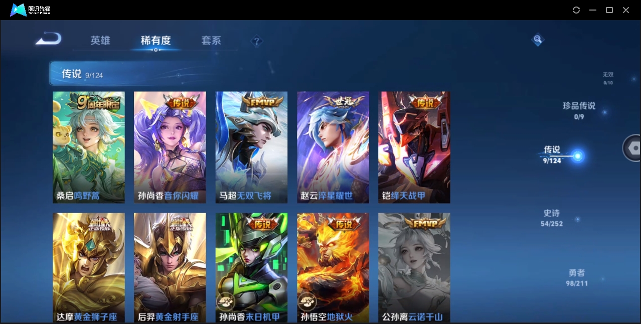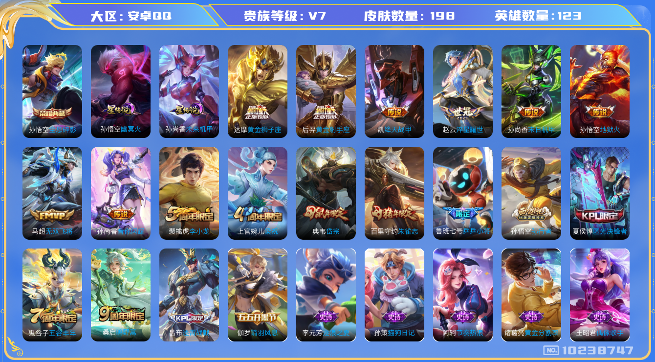 [10238747]【保证金商户】【编号02705 v7】【123英雄198皮肤】【精品爽玩皮肤号】【198皮肤 1典藏9传说 2星传说】未来机甲 幽冥火 全息碎影 黄金狮子座 黄金射手座 绛天战甲 末日机甲-孙尚香 地狱火 淬星耀世 无双飞将 音你闪耀 李小龙 梁祝 岱宗 乒乒小将 朱雀志 孙行者 匿光决锋者 五谷丰年 鸣野蒿 逐霄战戟 末日机甲-吕布 偶像歌手 冰冠公主 猫狗日记-孙策 唤灵魅影 无心 未来纪元-赵云 匿光侦查者 江河有灵 百解令蒙犽 蒙犽顽岩魄