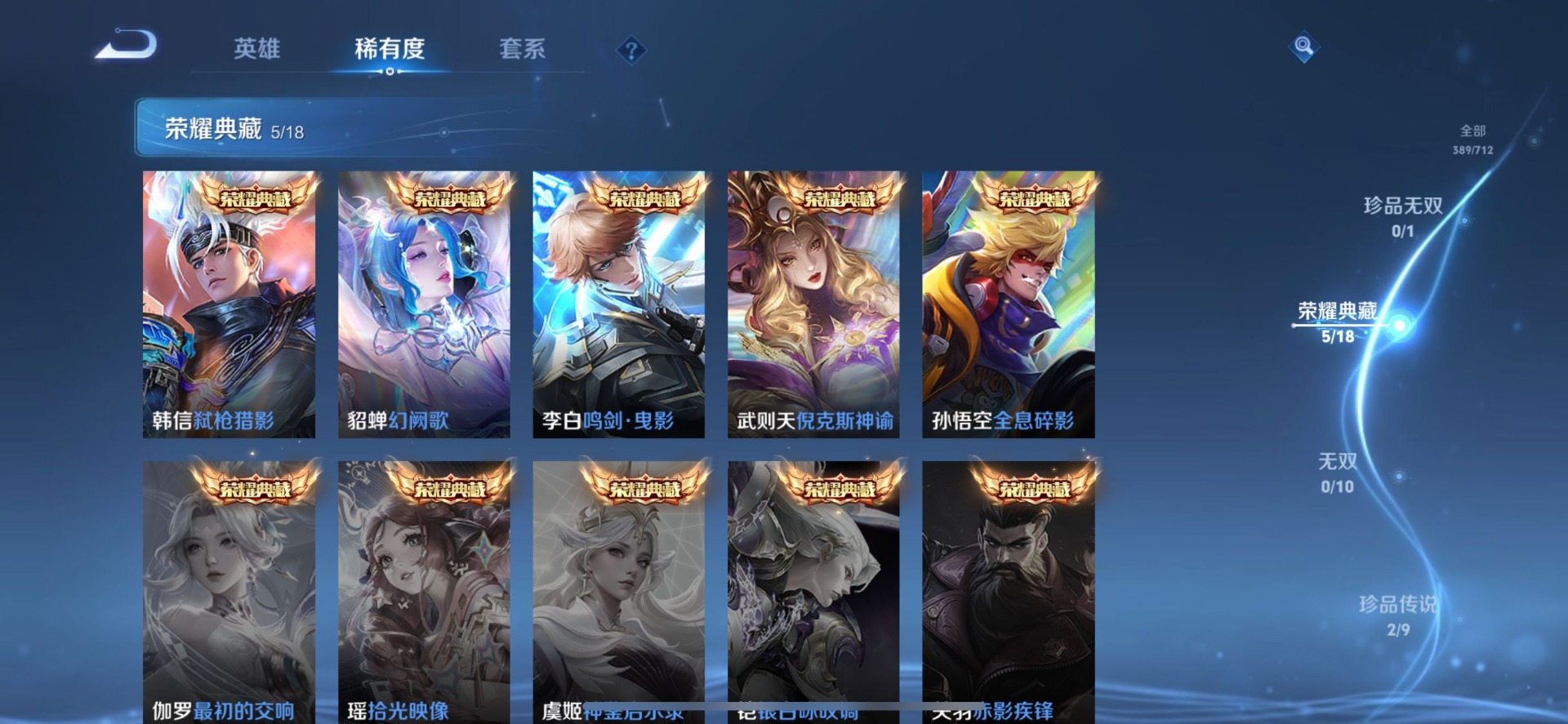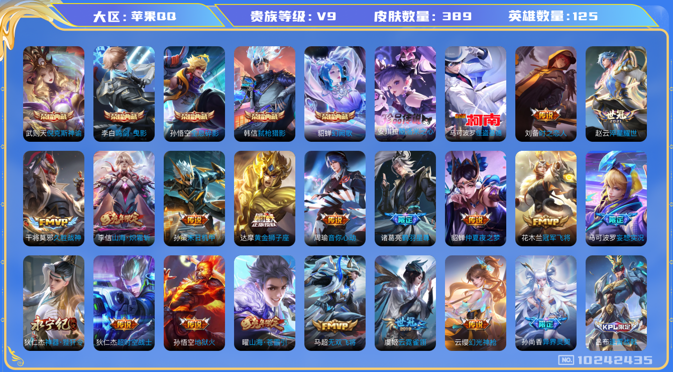[10242435]v9 5典藏 2珍品传说 26传说 125英雄 389皮肤 典藏英雄武则天 可修改实名 荣耀水晶:鸣剑·曳影弑呛猎影韩信典藏幻阙歌貂蝉典藏全息碎影猴子典藏倪克斯神谕宇宙婆娘 珍品传说:怪盗基德酷洛米之心 传说皮:幻光神呛山海·炽霜斩李信年限黄金狮子座地狱火仲夏夜之梦大飞蛾云霓雀翎淬星耀世冠军飞将久胜战神无双飞将音你心动-周瑜时之恋人-刘备电焊工超时空战士-狄仁杰末日机甲-孙策神器·狴犴令山海·苍雷引电光曜子鹤羽星尊妄想实况 珍宝阁皮:万物之道女武神玩趣恶龙 限定皮:愿照·岁时盈虞姬年限逐霄战戟鸣野蒿白虎志电光耗子异界灵契白毛香傲雪梅呛神威电光马子遇见飞天高山流水怒海麟威五谷丰年武圣梁祝御风骁将吕布年限李小龙霸王别姬-虞姬匿光追影者时之祈愿-瑶瑶传限玉兔公主神器·万象笔山海·玄木吟马可年限 史诗皮:百相守梦-百里守约星界战将茶境仙器灵·浮梦炉化蝶舞鸭鸭历险记-刘禅灵蛊蚀心龙之律动怒海争锋蔬乡物语鲁班七号破空之剑乘龙·聚宝船安琪拉年限石田雨龙紫霞仙子苍穹之光电玩小子小书包黄金分割率特工魅影千年之狐永昼电玩·爆裂旋风冰冠公主江河有灵高渐离燃音魔法蒙恬荣光圣徽青蛇偶像歌手晚萤龙骑士小龙虾无限星赏官魅语白蛇暗夜猫娘末日机甲-吕布猫狗日记-孙策猫狗日记-大乔时之恋人-孙尚香乱世虎臣节奏热浪修罗女仆咖啡摇滚巨星水果甜心绅士熊喵天才门将星夜王子心灵骇客时之奇旅-安琪拉功夫厨神德古拉伯爵暗隐猎兽者幽灵船长鬼剑武藏心灵战警乐园奇幻夜天秀·启明舞动绿茵地狱岩魂纤云弄巧拒霜思缤纷独角兽乘风破浪逐浪之夏月团寄思水晶猎龙者曙光守护者箭羽风息金属风暴原初追逐者圣诞狂欢圣诞恋歌鹰眼统帅暗夜贵公子魅力维加斯黎明之约赏金猎手奇遇舞章无心未来纪元-赵云