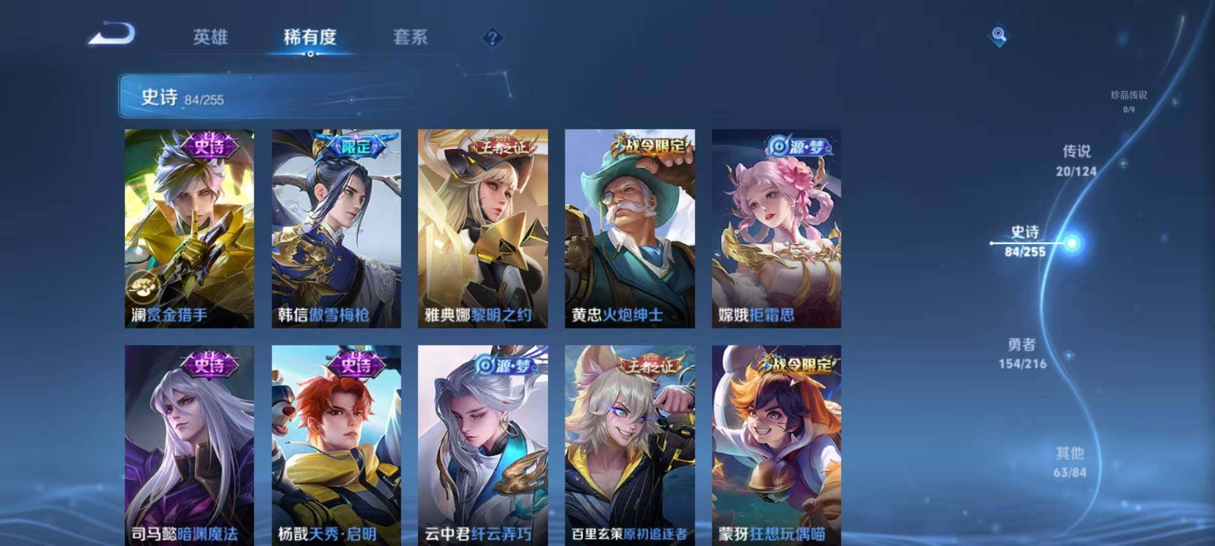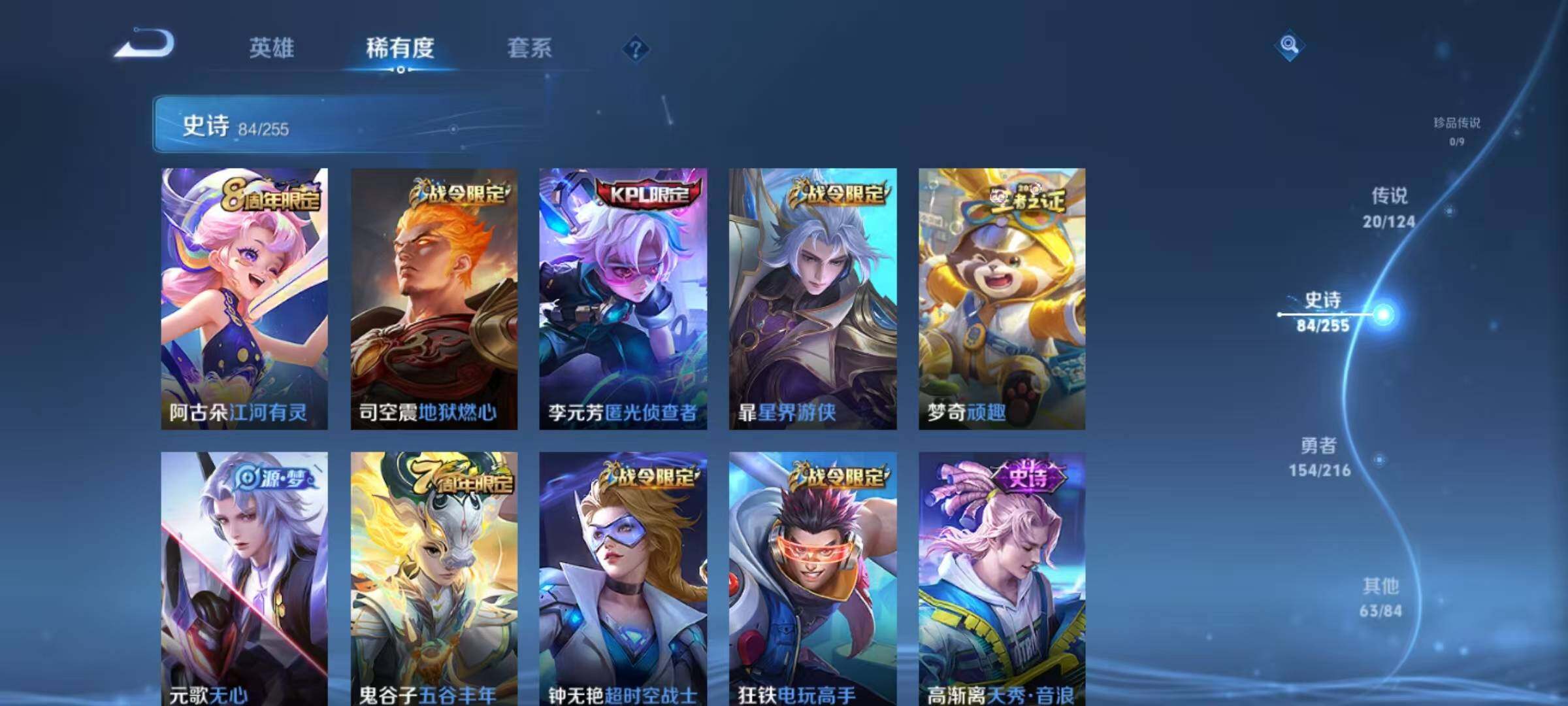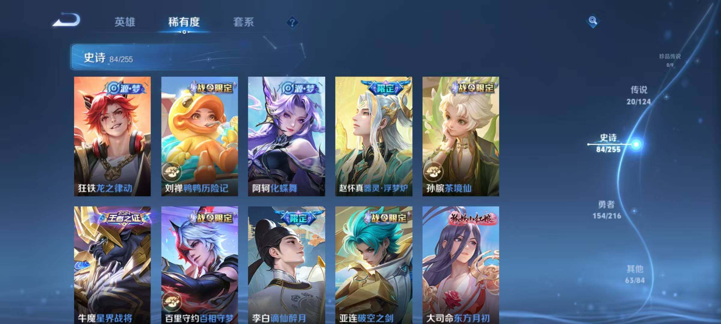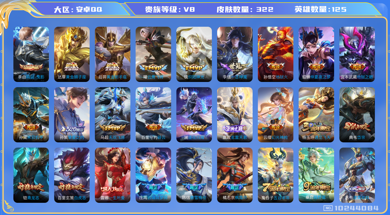 [10244084]【商品标题】:安卓q-v8-至尊星耀i段位-125英雄-322皮肤-1典藏-0珍品无双-0无双-0珍品传说-20传说-84史诗 【荣耀典藏】:李白鸣剑曳影 【内测皮肤】:狂铁特工战影,干将莫邪胡桃夹子 【传说皮肤】:孙悟空地狱火,宫本武藏地狱之眼,貂蝉仲夏夜之梦,后羿黄金射手座,百里玄策白虎志,达摩黄金狮子座,李信一念神魔,曜云鹰飞将,虞姬启明星使,镜炽阳神光,孙策末日机甲,孙策挚爱之约,马超无双飞将,橘右京枫霜尽,百里守约碎云,澜逐花归海,桑启鸣野蒿,嬴政玄雷天君,云缨幻光神呛,澜愿照九州拓 【限定皮肤】:蒙犽顽岩魄,蔡文姬夏日便利店,大乔绒语心约,虞姬夏日便利店,姜子牙天穹之誓,杨戬破阵退雄兵,李白谪仙醉月,狄仁杰阴阳师,赵云皇家上将,庄周云端筑梦师,钟无艳超时空战士,芈月幻夜卜梦,元歌无心,典韦岱宗,狄仁杰魔术师,狄仁杰万华元夜,达摩星际陆战队,达摩沙漠行僧,项羽海滩派对,露娜一生所爱,韩信傲雪梅呛,王昭君午后时光,兰陵王金庭之子,橘右京枫霜尽,李元芳匿光侦查者,李元芳云中旅人,虞姬启明星使,钟馗驱傩正仪,杨玉环遇见飞天,女娲朔望之晖,干将莫邪胡桃夹子,雅典娜黎明之约,鬼谷子五谷丰年,黄忠火炮绅士,铠青龙志,苏烈千军破阵,百里玄策白虎志,百里玄策原初追逐者,梦奇顽趣,沈梦溪大漠名商,裴擒虎擒涛扼浪,狂铁电玩高手,云中君纤云弄巧,孙策挚爱之约,猪八戒西部大镖客,嫦娥拒霜思,嫦娥暖冬兔眠,蒙犽狂想玩偶喵,鲁班大师探海日志,桑启海盐诗旅,暃星界游侠,艾琳流音漫舞,司空震地狱燃心,阿古朵江河有灵,张良古海寻踪,蒙犽百解令,蒙恬荣光圣徽,高渐离燃音魔法,妲己灵卜魔法,鬼谷子天穹祈灯,伽罗琥珀纪元,姬小满妄想食味,沈梦溪龙舞盛年,鲁班七号蔬乡物语,李元芳蔬乡物语,刘邦剑破天穹,程咬金群星魔术团,镜青焰无极,项羽苍威无极,刘备异域游侠,周瑜熔金海岸 【年限皮肤】:百里玄策白虎志,铠青龙志,典韦岱宗 【赛季限定】:狄仁杰万华元夜,达摩沙漠行僧,兰陵王金庭之子,张良古海寻踪,李元芳云中旅人,钟馗驱傩正仪,雅典娜黎明之约,苏烈千军破阵,百里玄策原初追逐者,梦奇顽趣,沈梦溪大漠名商,裴擒虎擒涛扼浪,鲁班大师探海日志,桑启海盐诗旅,鬼谷子天穹祈灯,蒙恬荣光圣徽,刘邦剑破天穹,姜子牙天穹之誓 【战令限定】:蔡文姬夏日便利店,虞姬夏日便利店,钟无艳超时空战士,芈月幻夜卜梦,达摩星际陆战