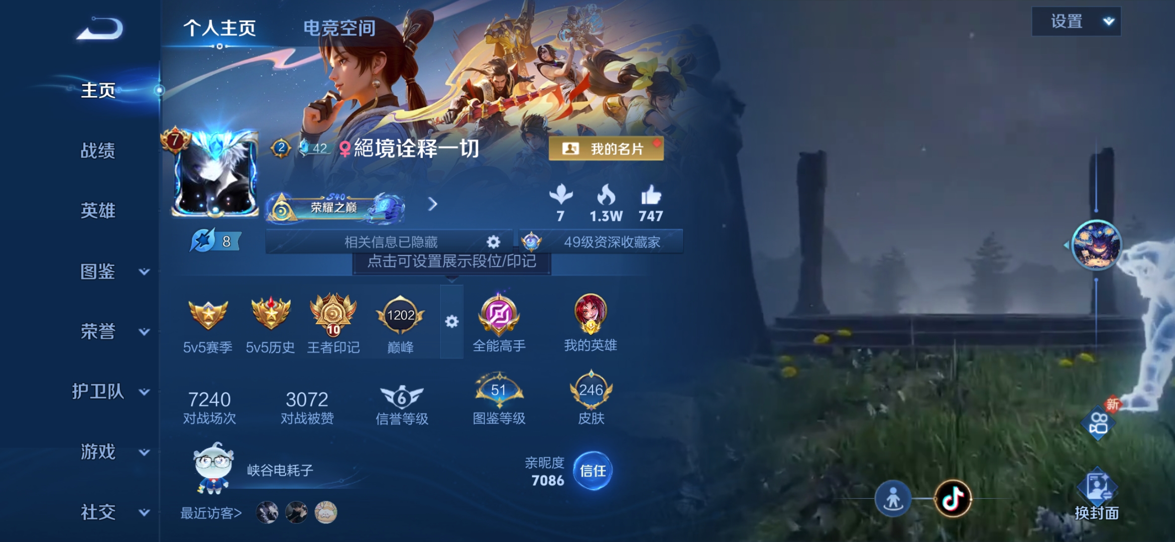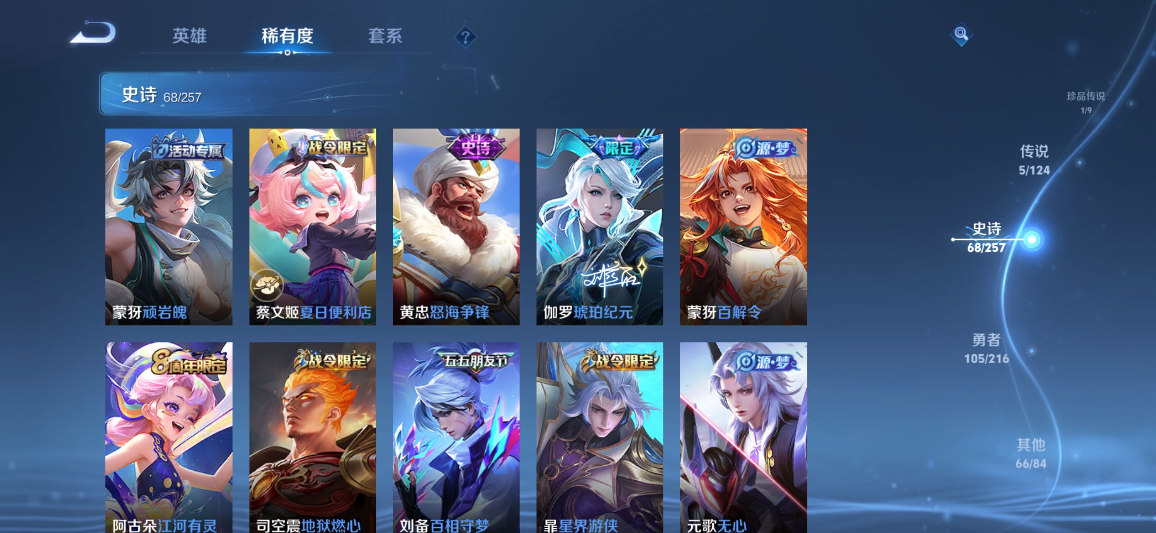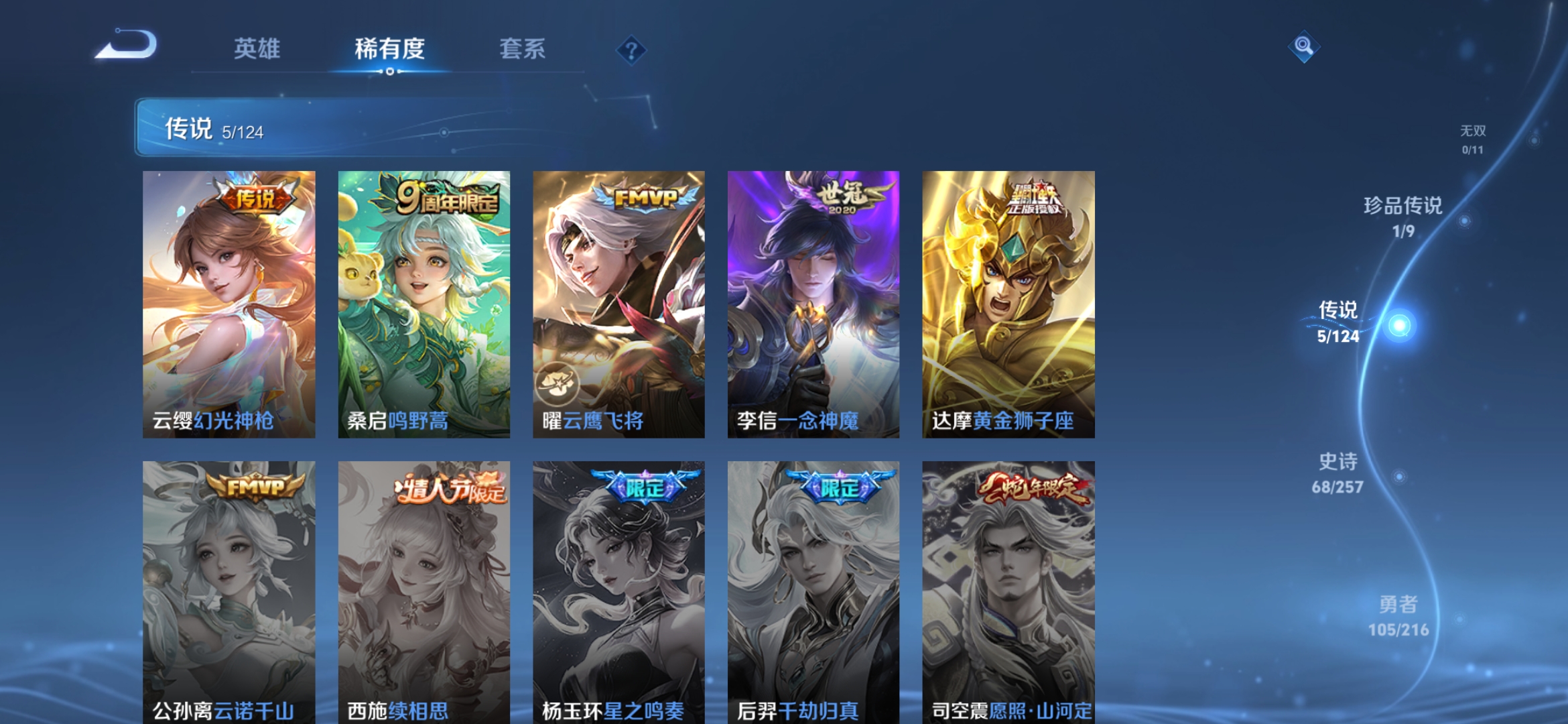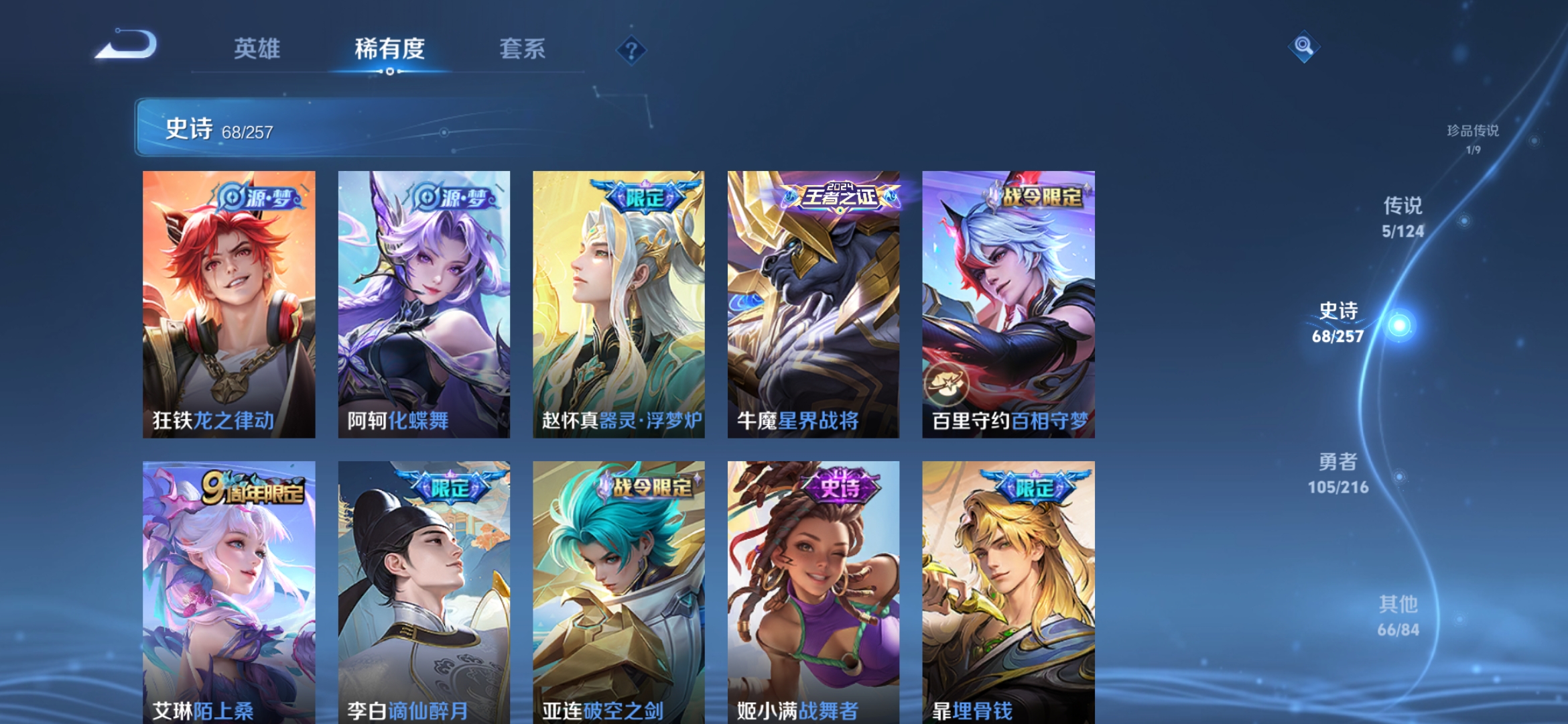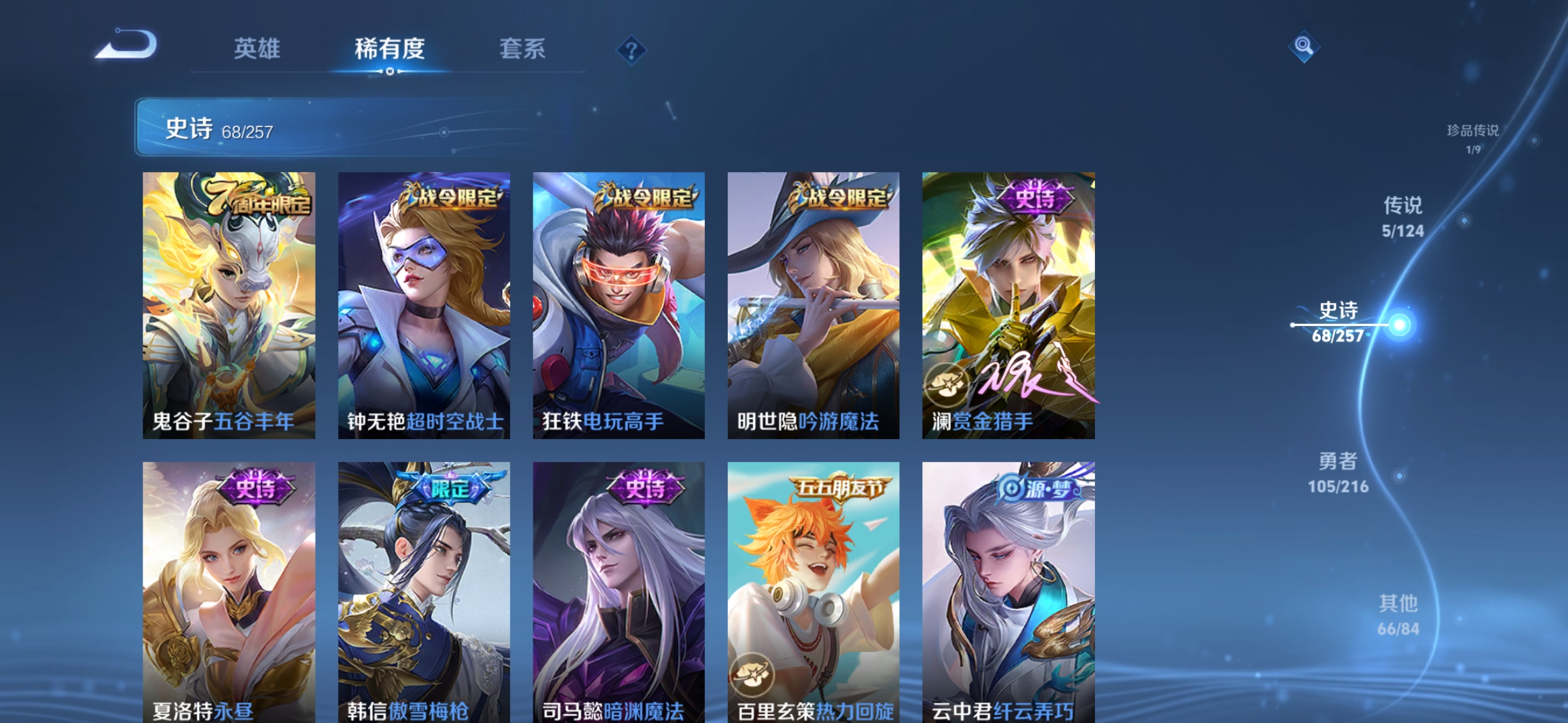 [10371379]实名: 可修改 贵族等级: v7 英雄数: 125 皮肤数: 246 荣耀水晶: 鸣剑·曳影 珍品传说: 怪盗基德 传说皮: 黄金狮子座云鹰飞将一念神魔幻光神呛 限定皮: 李小龙岱宗傲雪梅呛五谷丰年鸣野蒿陌上桑【由于赛季三个月更新一次,段位皆有上号为准,对段位有要求这谨慎下单!!!】