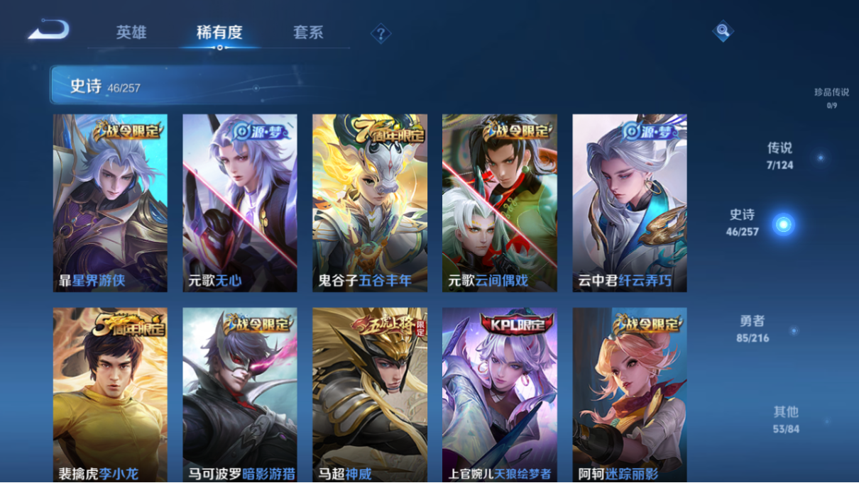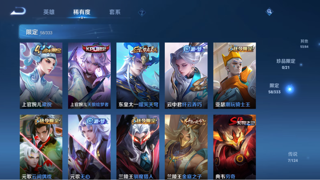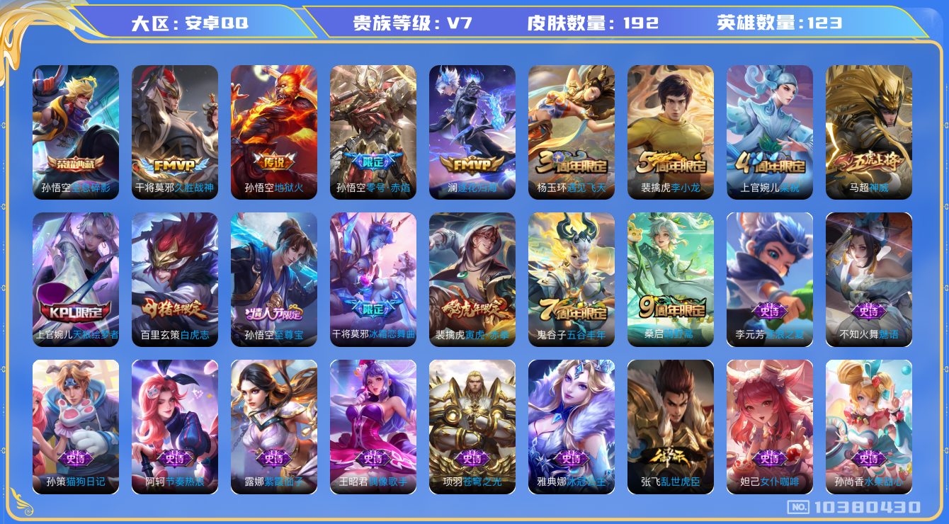 [10380430]实名: 可修改 性别: 男号 贵族等级: v7 英雄数: 123 皮肤数: 192 荣耀水晶: 全息碎影 传说皮: 久胜战神地狱火零号·赤焰澜逐花归海 限定皮: 遇见飞天李小龙梁祝神威冰霜恋舞曲天狼绘梦者白虎志至尊宝寅虎·赤拳五谷丰年鸣野蒿