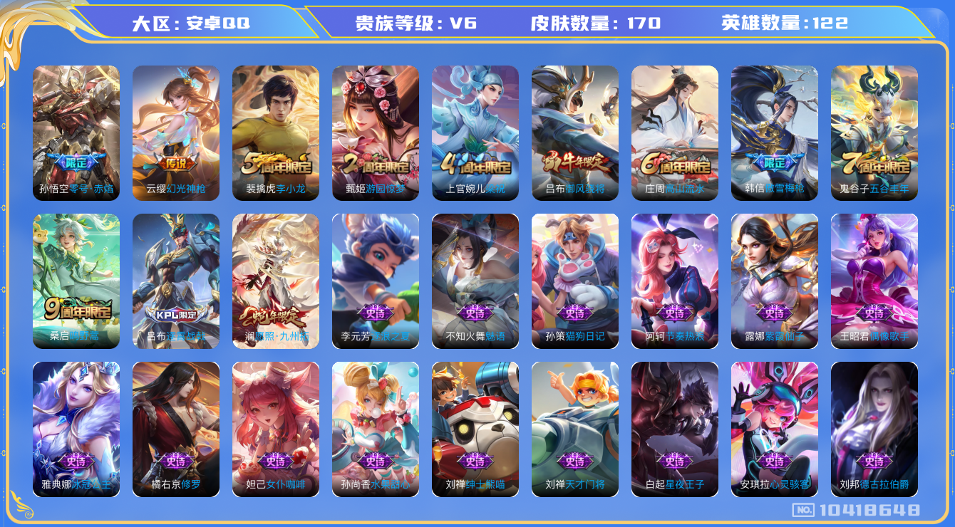 [10418648]v6-170皮肤-4传说-48史诗 tt1101 【内测皮肤】:孙尚香蔷薇恋人,高渐离玩趣恶龙,狂铁特工战影 【传说皮肤】:孙悟空零号赤焰,桑启鸣野蒿,云缨幻光神呛,澜愿照九州拓 【限定皮肤】:狄仁杰阴阳师,赵云皇家上将,孙尚香蔷薇恋人,庄周高山流水,高渐离玩趣恶龙,吕布御风骁将,元歌无心,甄姬游园惊梦,狄仁杰魔术师,狄仁杰万华元夜,达摩沙漠行僧,项羽海滩派对,老夫子醍醐杖,程咬金演武夺筹,韩信傲雪梅呛,兰陵王金庭之子,孙悟空零号赤焰,李元芳云中旅人,钟馗驱傩正仪,雅典娜单词大作战,鬼谷子原初探秘者,鬼谷子五谷丰年,苏烈千军破阵,弈星混沌棋,沈梦溪大漠名商,明世隐疑决卦,裴擒虎李小龙,裴擒虎擒涛扼浪,云中君纤云弄巧,上官婉儿梁祝,嫦娥拒霜思,蒙犽狂想玩偶喵,鲁班大师探海日志,桑启海盐诗旅,阿古朵江河有灵,张良古海寻踪,鬼谷子天穹祈灯,沈梦溪龙舞盛年,刘邦剑破天穹,程咬金群星魔术团 【年限皮肤】:吕布御风骁将 【赛季限定】:狄仁杰万华元夜,达摩沙漠行僧,老夫子醍醐杖,程咬金演武夺筹,兰陵王金庭之子,张良古海寻踪,李元芳云中旅人,钟馗驱傩正仪,鬼谷子原初探秘者,苏烈千军破阵,弈星混沌棋,沈梦溪大漠名商,明世隐疑决卦,裴擒虎擒涛扼浪,鲁班大师探海日志,桑启海盐诗旅,鬼谷子天穹祈灯,刘邦剑破天穹 【战令限定】:雅典娜单词大作战,蒙犽狂想玩偶喵 【史诗皮肤】:露娜紫霞仙子,赵云皇家上将,赵云未来纪元,貂蝉圣诞恋歌,甄姬冰雪圆舞曲,王昭君偶像歌手,狄仁杰魔术师,廉颇地狱岩魂,宫本武藏鬼剑武藏,孙尚香蔷薇恋人,孙尚香水果甜心,妲己魅力维加斯,妲己女仆咖啡,墨子金属风暴,吕布圣诞狂欢,刘禅绅士熊喵,曹操幽灵船长,李白千年之狐,花木兰水晶猎龙者,刘邦德古拉伯爵,夏侯惇乘风破浪,小乔缤纷独角兽,甄姬游园惊梦,亚瑟心灵战警,雅典娜冰冠公主,安琪拉心灵骇客,百里守约特工魅影,蔡文姬舞动绿茵,刘禅天才门将,李元芳逐浪之夏,白起星夜王子,阿轲节奏热浪,孙策猫狗日记,狄仁杰鹰眼统帅,上官婉儿梁祝,不知火舞魅语,橘右京修罗,蒙犽狂想玩偶喵,裴擒虎李小龙,云中君纤云弄巧,吕布御风骁将,庄周高山流水,嫦娥拒霜思,韩信傲雪梅呛,鬼谷子五谷丰年,元歌无心,刘禅电玩爆裂旋风,阿古朵江河有灵 【其他皮肤】:项羽海滩派对,韩信教廷特使,韩信街头霸王,露娜哥特玫瑰,达摩大发明家,赵云忍炎影,芈月红桃皇后,白起