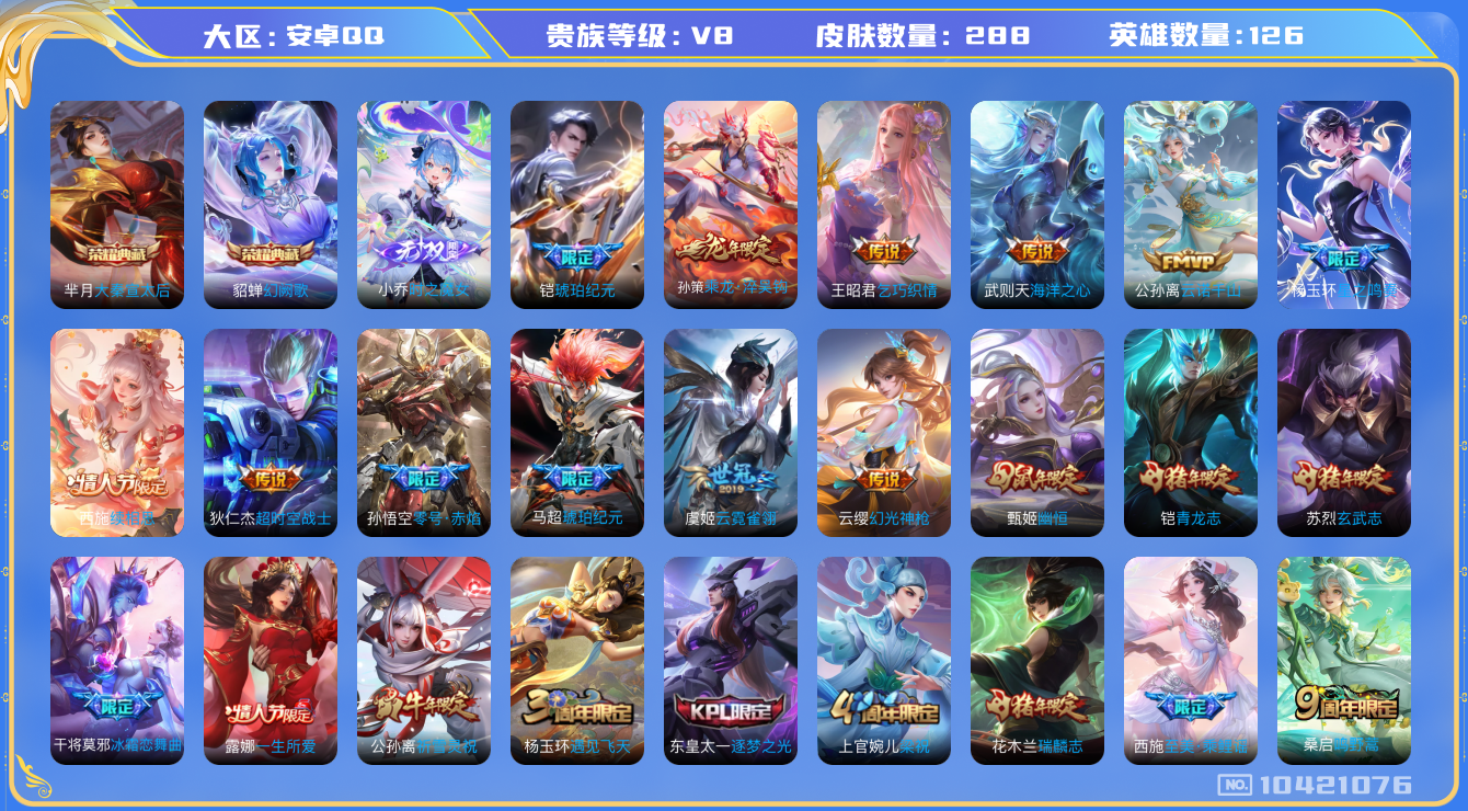 [10421076]v8 2典藏 1无双 17传说 126英雄 288皮肤 典藏英雄武则天 可修改实名 女号 荣耀水晶:幻阙歌貂蝉典藏大秦宣太后 无双皮:小乔时之魔女小乔无双 传说皮:云诺千山琥珀纪元铠琥珀纪元马超乘龙·淬吴钩孙策年限续相思星之鸣奏幻光神呛零号·赤焰海洋之心云霓雀翎乞巧织情超时空战士-狄仁杰 珍宝阁皮:妄想食味万物之道 限定皮:愿照·众生和妲己年限鸣野蒿白虎志电光耗子时之彼端飞衡韩信年限瑞麟志木兰年限至美·乘鲤谣遇见飞天青龙志铠年限幽恒沐浴露梁祝祈雪灵祝雪兔子逐梦之光玄武志苏烈年限朱雀志守约年限一生所爱大圣娶亲引擎之心冰霜恋舞曲 史诗皮:茶境仙战舞者化蝶舞鸭鸭历险记-刘禅龙之律动藏狐·褐绒石田雨龙蒙犽顽岩魄蔬乡物语鲁班七号琥珀纪元伽罗破空之剑紫霞仙子电玩小子小书包白龙吟黄金分割率特工魅影千年之狐电玩·爆裂旋风百相守梦刘备冰冠公主高渐离燃音魔法蒙恬荣光圣徽偶像歌手青蛇暗夜猫娘龙骑士小龙虾末日机甲-吕布猫狗日记-孙策猫狗日记-大乔乱世虎臣女仆咖啡摇滚巨星水果甜心绅士熊喵天才门将星夜王子功夫厨神德古拉伯爵暗隐猎兽者幽灵船长鬼剑武藏心灵战警舞动绿茵纤云弄巧缤纷独角兽乘风破浪逐浪之夏水晶猎龙者曙光守护者金属风暴圣诞恋歌鹰眼统帅暗夜贵公子魅力维加斯
