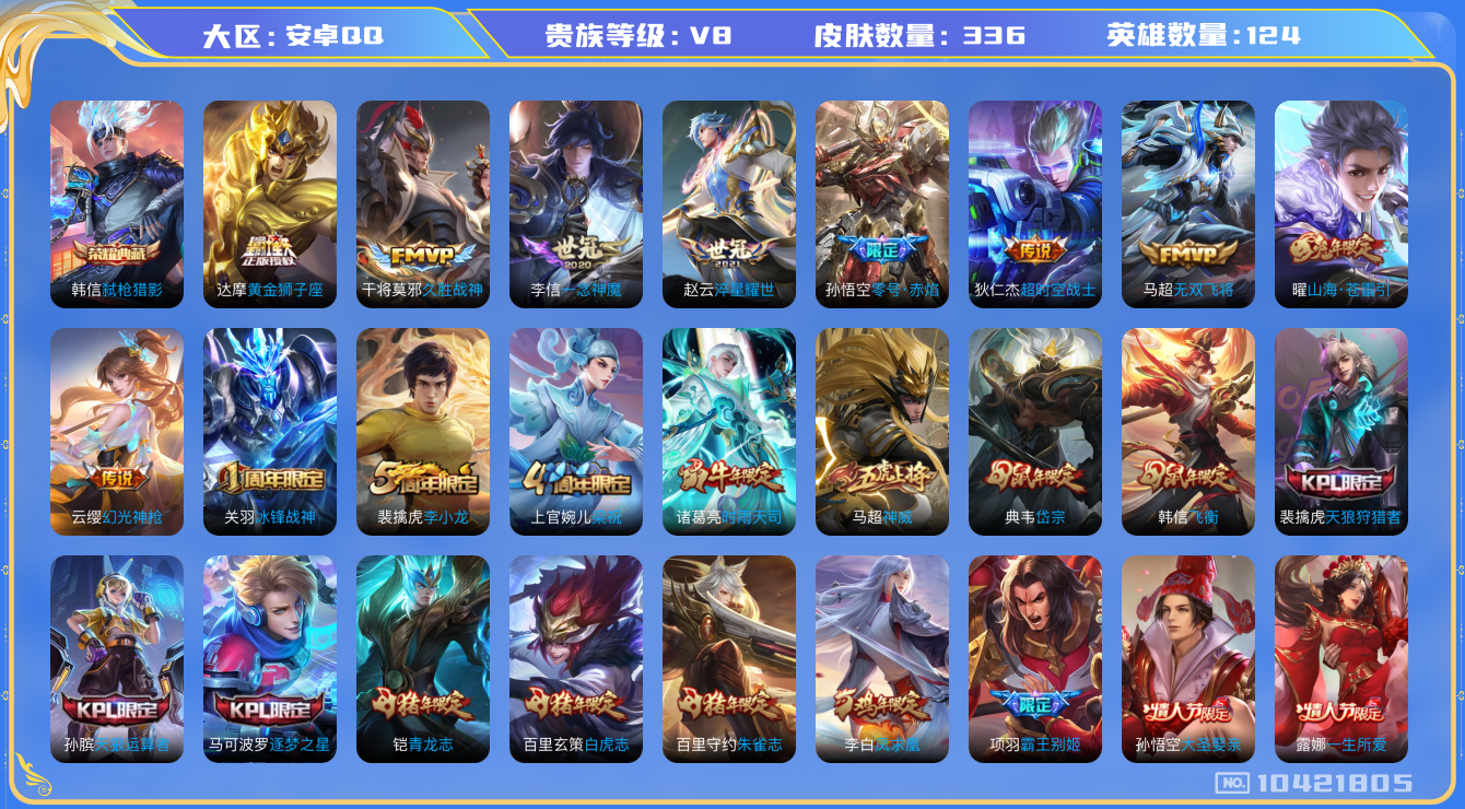 [10421805]v8-336皮肤-1典藏-16传说-90史诗 sa1035 【荣耀典藏】:韩信弑呛猎影 【内测皮肤】:艾琳女武神,狂铁特工战影 【传说皮肤】:狄仁杰超时空战士,吕布天魔缭乱,李白凤求凰,百里玄策白虎志,达摩黄金狮子座,干将莫邪久胜战神,李信一念神魔,孙悟空零号赤焰,虞姬启明星使,诸葛亮时雨天司,赵云淬星耀世,马超无双飞将,不知火舞绯月行,曜山海苍雷引,兰陵王影龙天霄,云缨幻光神呛 【限定皮肤】:白起狰,姜子牙天穹之誓,狄仁杰阴阳师,虞姬凯尔特女王,赵云皇家上将,嬴政白昼王子,鲁班七号狮舞东方,庄周蜃楼王,高渐离死亡摇滚,阿轲迷踪丽影,钟无艳超时空战士,孙膑妖精王,孙膑天狼运算者,扁鹊炼金王,白起夜都怪侠,芈月重明,芈月白晶晶,芈月幻夜卜梦,吕布天魔缭乱,吕布猎兽之王,周瑜赤莲之焰,元歌云间偶戏,元歌无心,夏侯惇朔风刀,甄姬落雪兰心,曹操烛龙,典韦穷奇,典韦蓝屏警告,典韦岱宗,马可波罗逐梦之星,马可波罗暗影游猎,狄仁杰魔术师,狄仁杰万华元夜,达摩沙漠行僧,项羽海滩派对,项羽霸王别姬,老夫子醍醐杖,关羽冰锋战神,程咬金演武夺筹,露娜一生所爱,刘邦夺宝奇兵,韩信飞衡,王昭君午后时光,兰陵王影龙天霄,兰陵王驯魔猎人,兰陵王金庭之子,花木兰青春决赛季,花木兰默契交锋,不知火舞绯月行,亚瑟潮玩骑士王,孙悟空至尊宝,孙悟空大圣娶亲,孙悟空零号赤焰,牛魔御旌,李元芳银河之约,李元芳云中旅人,虞姬启明星使,钟馗神迹守卫,钟馗驱傩正仪,女娲朔望之晖,雅典娜单词大作战,雅典娜黎明之约,蔡文姬繁星吟游,太乙真人饕餮,太乙真人华丽摇滚,鬼谷子原初探秘者,鬼谷子五谷丰年,诸葛亮时雨天司,黄忠火炮绅士,铠青龙志,苏烈千军破阵,百里玄策白虎志,百里玄策原初追逐者,百里守约朱雀志,弈星混沌棋,梦奇顽趣,沈梦溪星空之诺,沈梦溪大漠名商,明世隐疑决卦,明世隐吟游魔法,裴擒虎天狼狩猎者,裴擒虎李小龙,裴擒虎擒涛扼浪,狂铁御狮,狂铁电玩高手,米莱狄御霄,云中君纤云弄巧,盾山御銮,猪八戒西部大镖客,上官婉儿梁祝,嫦娥拒霜思,嫦娥暖冬兔眠,曜山海苍雷引,蒙犽狂想玩偶喵,鲁班大师探海日志,桑启海盐诗旅,暃星界游侠,艾琳女武神,阿古朵江河有灵,张良古海寻踪,蒙恬荣光圣徽,高渐离燃音魔法,妲己灵卜魔法,鬼谷子天穹祈灯,伽罗琥珀纪元,姬小满妄想食味,刘邦剑破天穹,周瑜熔金海岸 【年限皮肤】:百里玄策白虎志,百里守