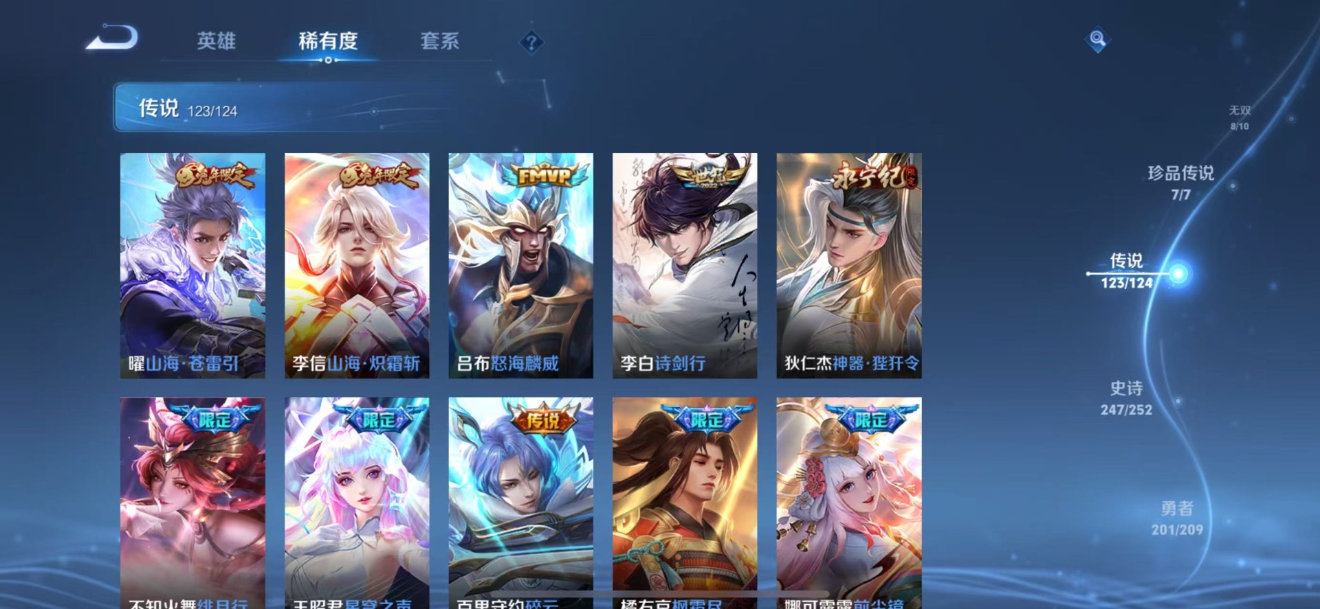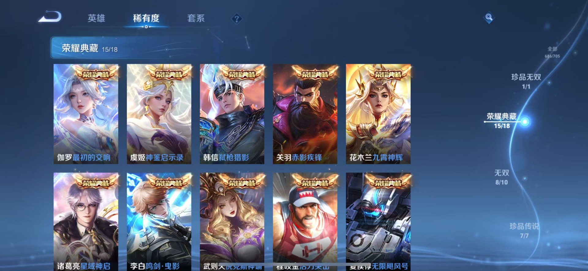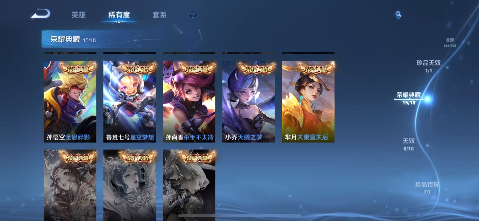无双贵族 15典藏 1珍品无双 8无双 7珍品传说 123传说 125英雄 686皮肤 典藏英雄武则天 可修改实名 鲁班小国标 荣耀水晶:最初的交响伽罗典藏神鉴启示录鸣剑·曳影九霄神辉木兰典藏弑呛猎影韩信典藏赤影疾锋全息碎影猴子典藏杀手不太冷天鹅之梦小乔典藏无限