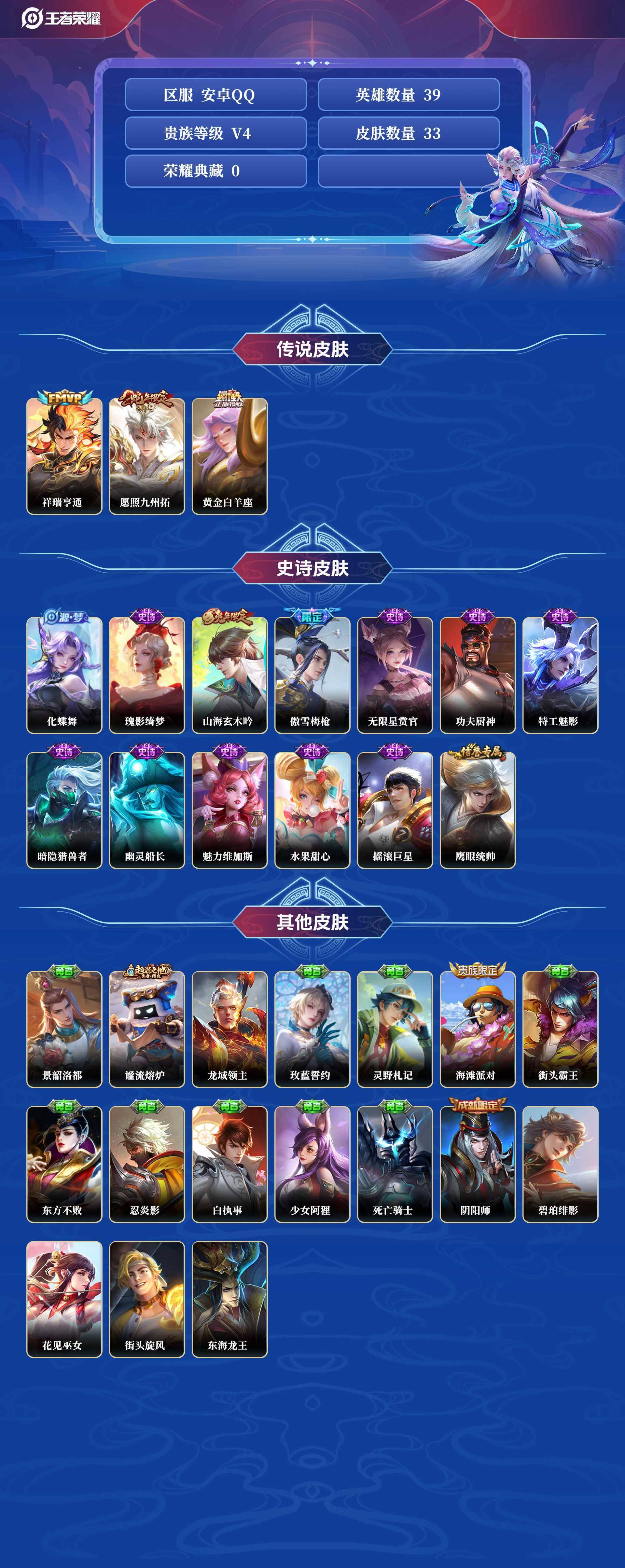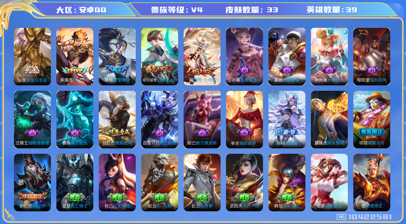 [10422581]0aas6s可二次"传说3优质限定4 无设备脸 钱包已注销 信用分正常 新传说限定:祥瑞亨通愿照·九州拓 传说皮肤:黄金白羊座 史诗限定:傲雪梅呛山海·玄木吟 新史诗皮肤:瑰影绮梦 史诗皮肤:幽灵船长功夫厨神暗隐猎兽者魅力维加斯摇滚巨星水果甜心鹰眼统帅特工魅影无限星赏官 "