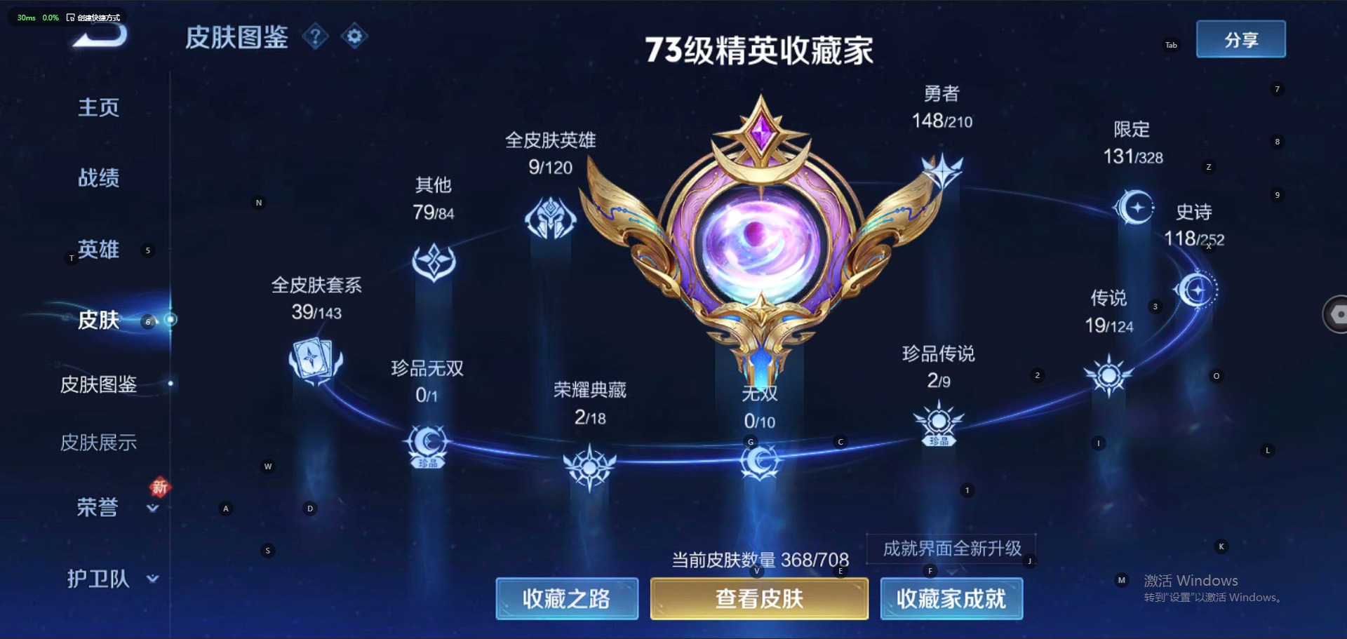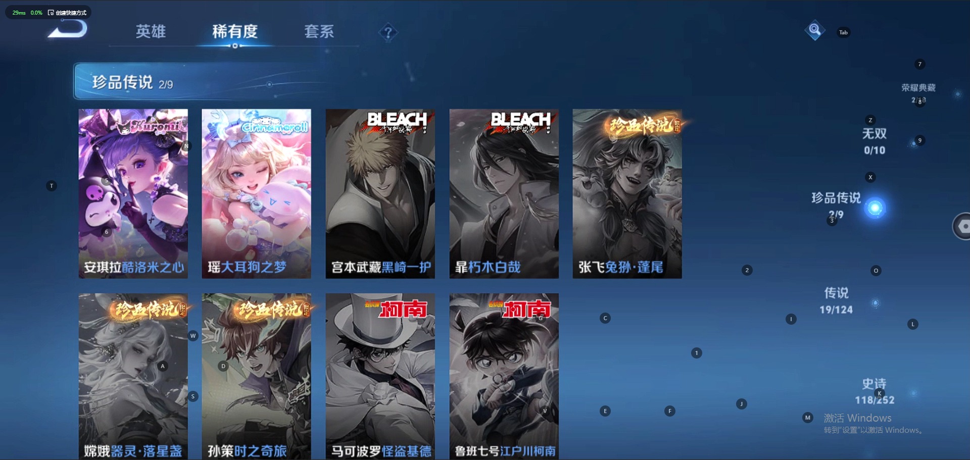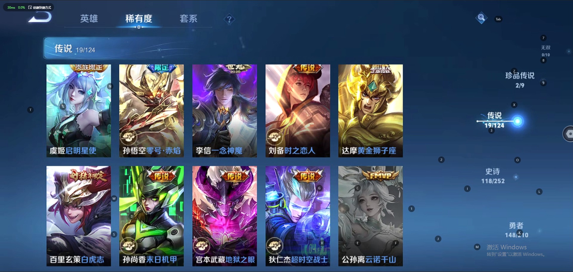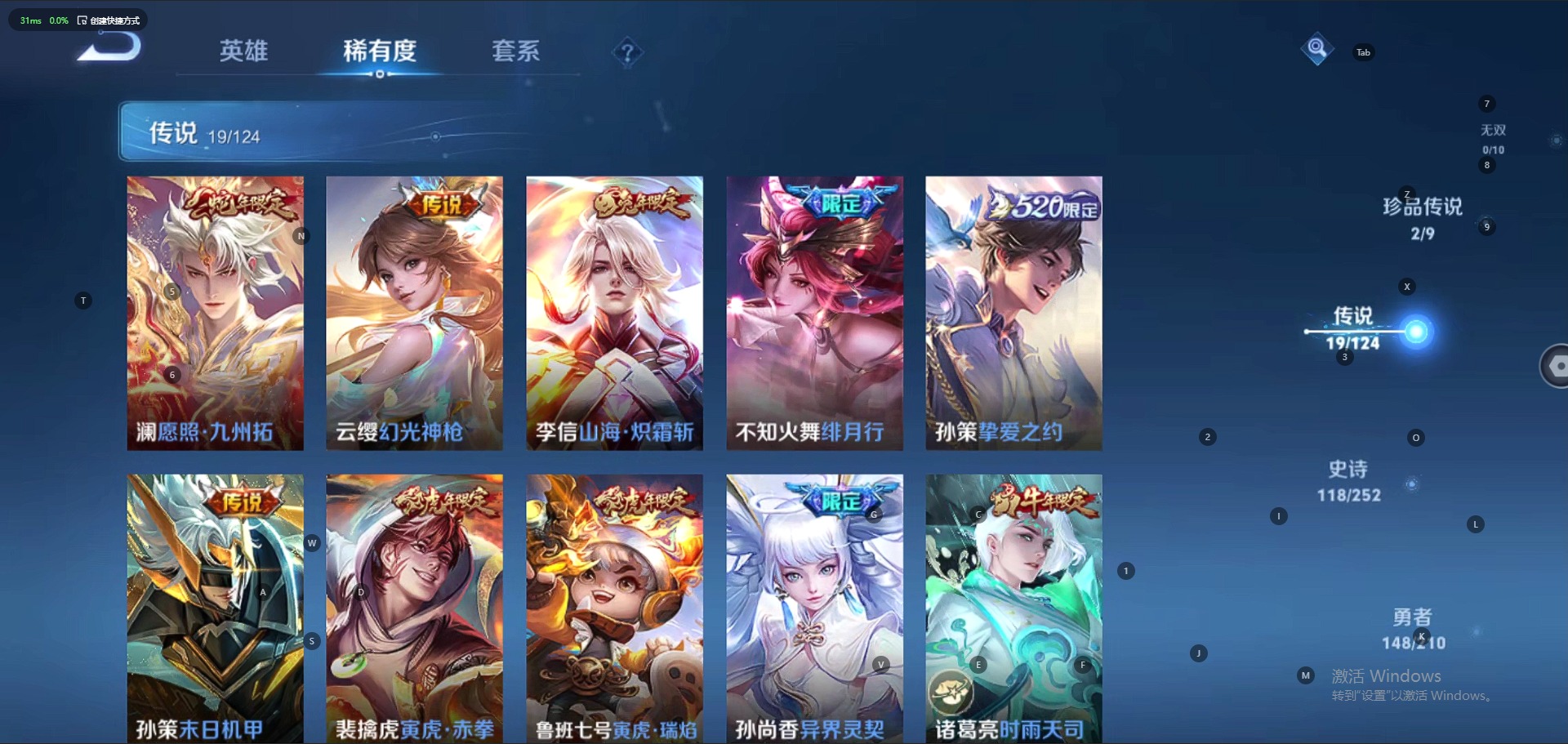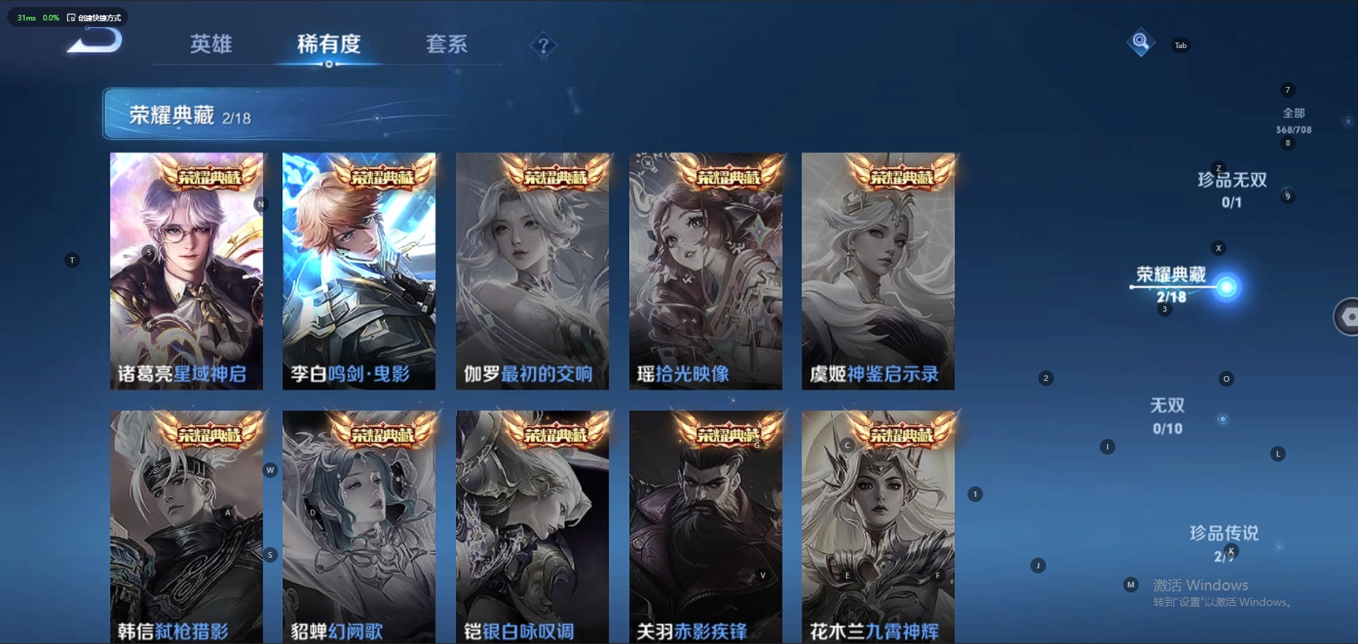 v9 2典藏 2珍品传说 19传说 123英雄 368皮肤 可修改实名 荣耀水晶:鸣剑·曳影星域神启倪克斯贼亮 珍品传说:酷洛米之心大耳狗之梦 传说皮:幻光神呛山海·炽霜斩李信年限黄金狮子座零号·赤焰地狱之眼末日机甲-孙尚香绿蚂蚱一念神魔时之恋人-刘备电焊工超时空