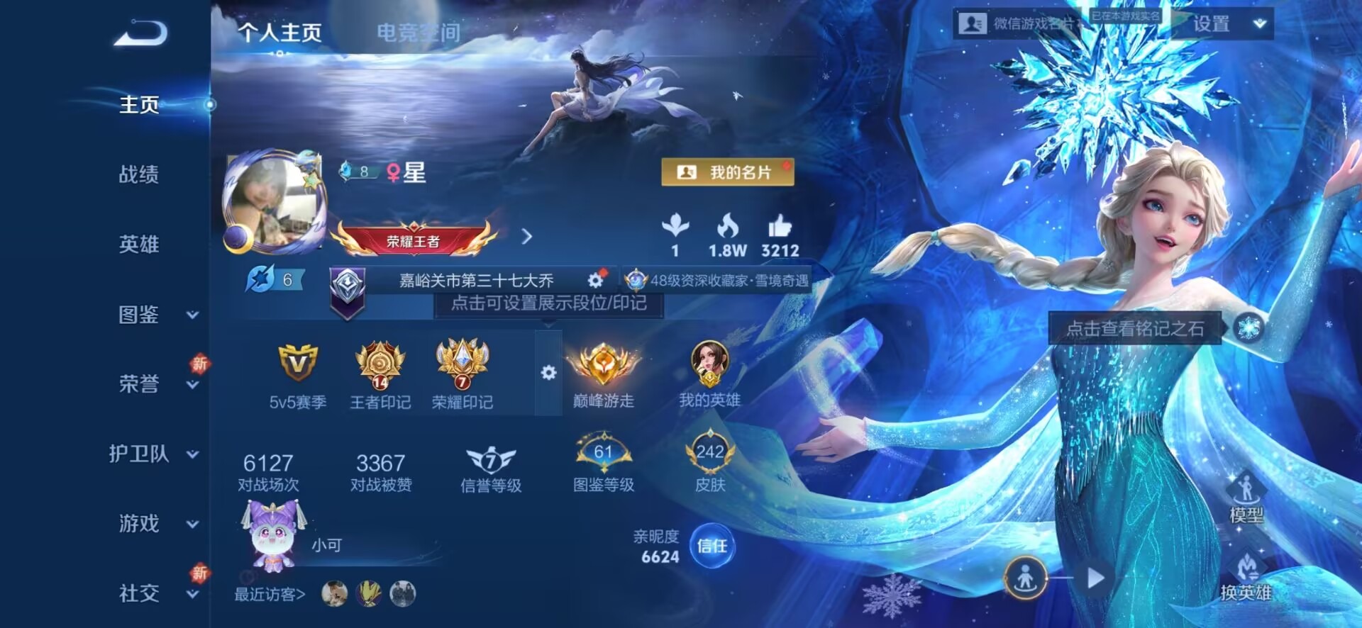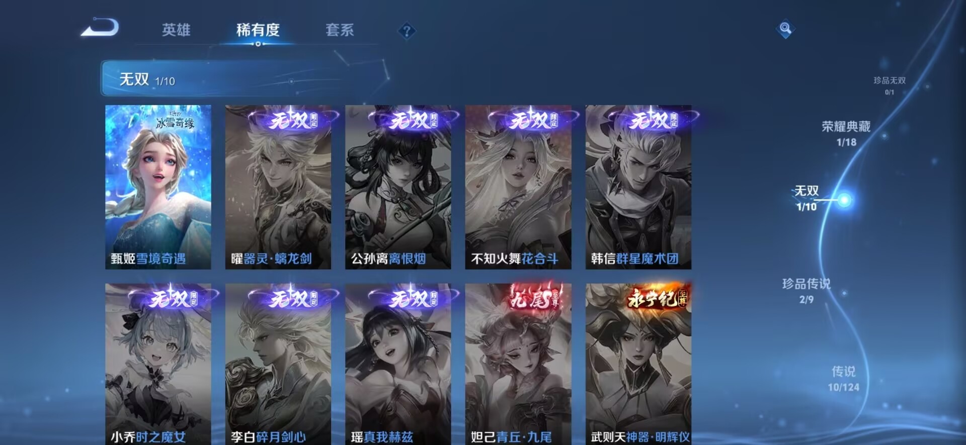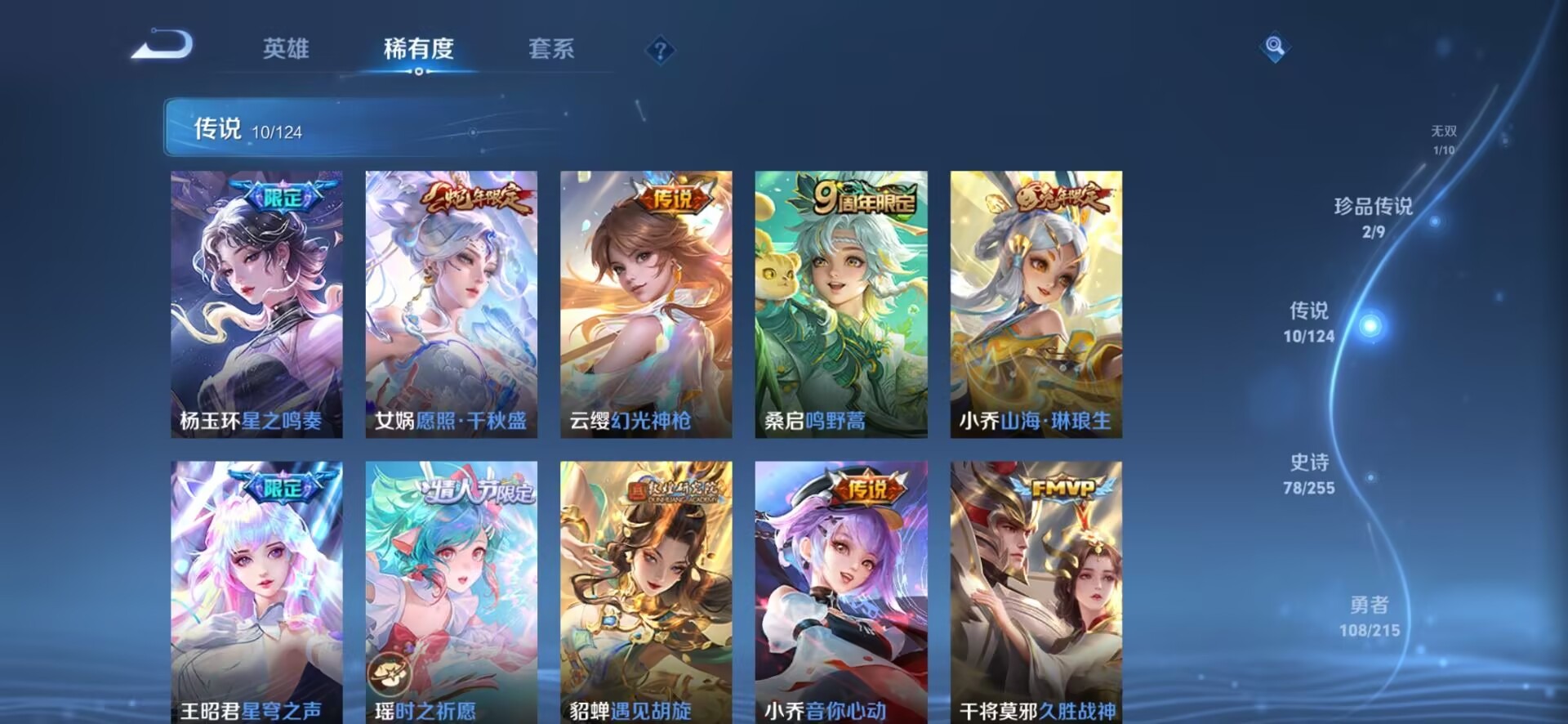 v7 1典藏 1无双 2珍品传说 10传说 124英雄 242皮肤 可修改实名 安全保护中 荣耀水晶:拾光映像瑶典藏 无双皮:雪境奇遇-甄姬 珍品传说:怪盗基德兔狲·蓬尾 传说皮:星之鸣奏幻光神呛遇见胡旋山海·琳琅生小乔年限久胜战神音你心动-小乔 珍宝阁皮:玩趣恶龙 限定皮:愿照