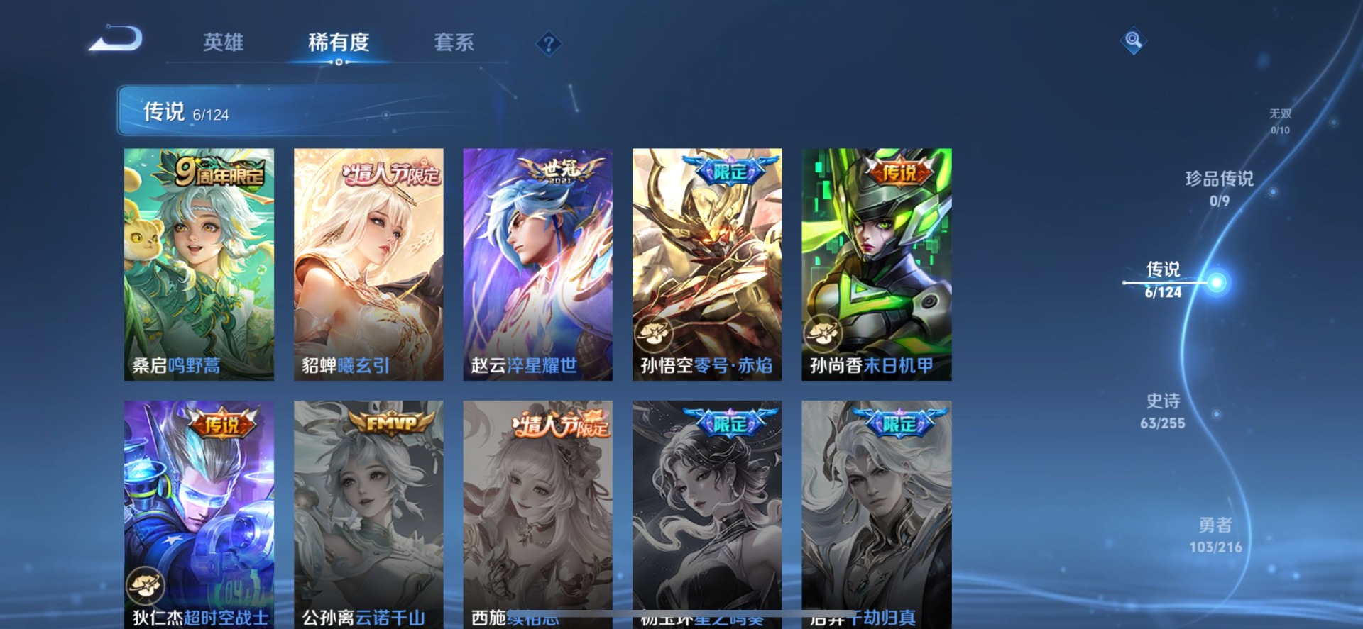 v7 1典藏 6传说 123英雄 225皮肤 可修改实名 荣耀水晶:无限飓风号高达 传说皮:貂蝉曦玄引零号·赤焰末日机甲-孙尚香绿蚂蚱淬星耀世超时空战士-狄仁杰 珍宝阁皮:优雅恋人蔷薇恋人 限定皮:鸣野蒿至尊宝傲雪梅呛遇见飞天高山流水五谷丰年梁祝李小龙逐梦之影猪悟