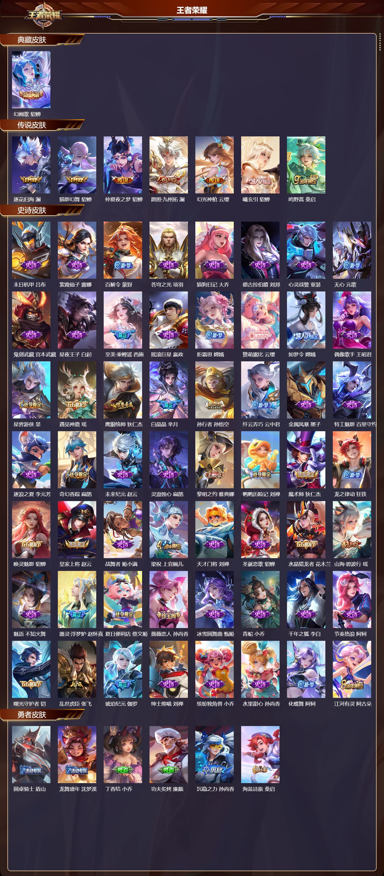 [10428018]安卓微信/v7/至尊星耀/203皮肤/124英雄/1典藏/0珍品无双/0无双/0珍品传说/7传说/56史诗/8稀有英雄 【1 典藏皮肤】幻阙歌 貂蝉 【7 传说皮肤】逐花归海 澜猫影幻舞 貂蝉仲夏夜之梦 貂蝉愿照·九州拓 澜幻光神呛 云缨曦玄引 貂蝉鸣野蒿 桑启 【56 史诗皮肤】末日机甲 吕布紫霞仙子 露娜百解令 蒙犽苍穹之光 项羽猫狗日记 大乔德古拉伯爵 刘邦心灵战警 亚瑟无心 元歌鬼剑武藏 宫本武藏星夜王子 白起至美·乘鲤谣 西施摇滚巨星 嬴政拒霜思 嫦娥赞萌露比 云缨如梦令 嫦娥偶像歌手 王昭君星界游侠 暃遇见神鹿 瑶鹰眼统帅 狄仁杰白晶晶 芈月孙行者 孙悟空纤云弄巧 云中君金属风暴 墨子特工魅影 百里守约逐浪之夏 李元芳奇幻香踪 扁鹊未来纪元 赵云灵蛊蚀心 扁鹊黎明之约 雅典娜鸭鸭历险记 刘禅魔术师 狄仁杰龙之律动 狂铁唤灵魅影 貂蝉皇家上将 赵云战舞者 姬小满梁祝 上官婉儿天才门将 刘禅圣诞恋歌 貂蝉水晶猎龙者 花木兰山海·碧波行 瑶魅语 不知火舞器灵·浮梦炉 赵怀真夏日便利店 蔡文姬蔷薇恋人 孙尚香冰雪圆舞曲 甄姬青蛇 小乔千年之狐 李白节奏热浪 阿轲曙光守护者 铠乱世虎臣 张飞琥珀纪元 伽罗绅士熊喵 刘禅缤纷独角兽 小乔水果甜心 孙尚香化蝶舞 阿轲江河有灵 阿古朵 【95 勇者皮肤】圆桌骑士 盾山龙舞盛年 沈梦溪丁香结 小乔功夫炙烤 廉颇沉稳之力