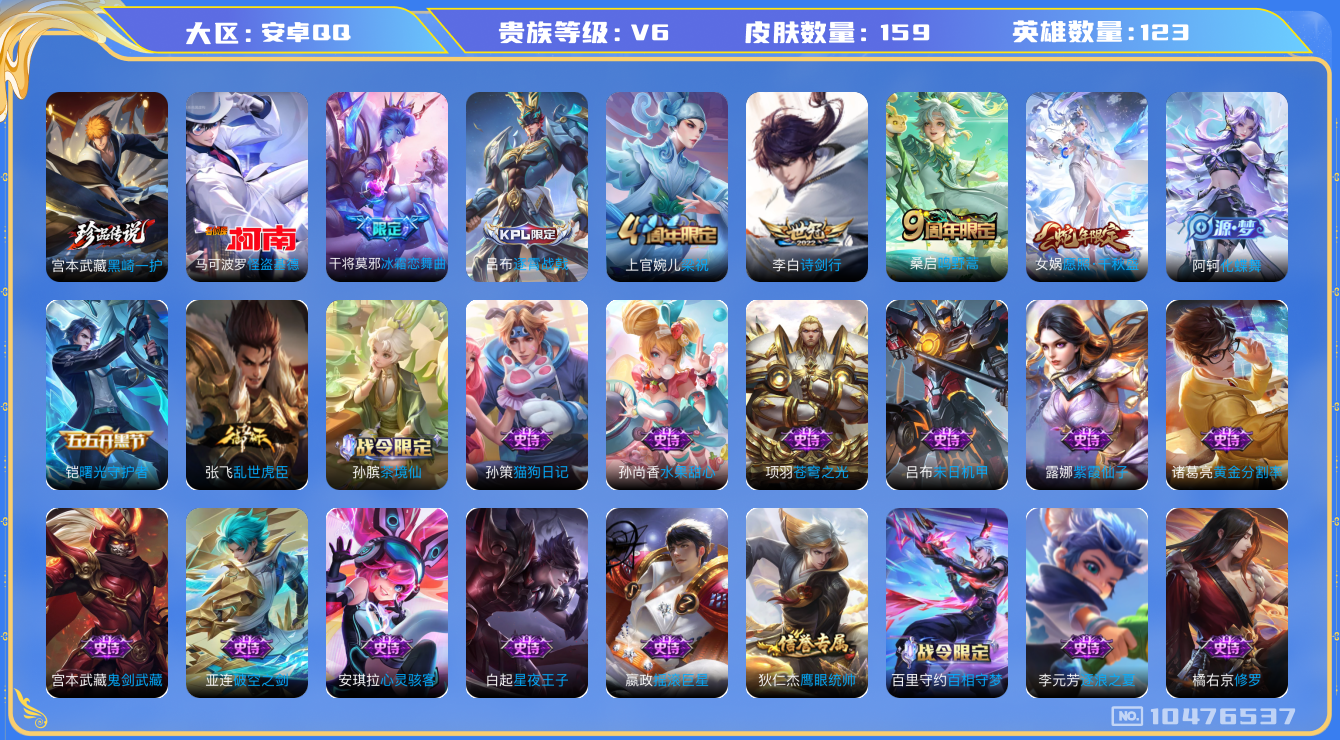 [10476537]v6 2珍品传说 3传说 123英雄 159皮肤 可修改实名 珍品传说:怪盗基德黑崎一护 珍宝阁皮:女武神 限定皮:愿照·千秋盛女娲年限逐霄战戟鸣野蒿诗剑行梁祝冰霜恋舞曲 史诗皮:百相守梦-百里守约茶境仙化蝶舞龙之律动破空之剑紫霞仙子苍穹之光黄金分割率末日机甲-吕布猫狗日记-孙策乱世虎臣修罗摇滚巨星水果甜心星夜王子心灵骇客鬼剑武藏逐浪之夏曙光守护者鹰眼统帅