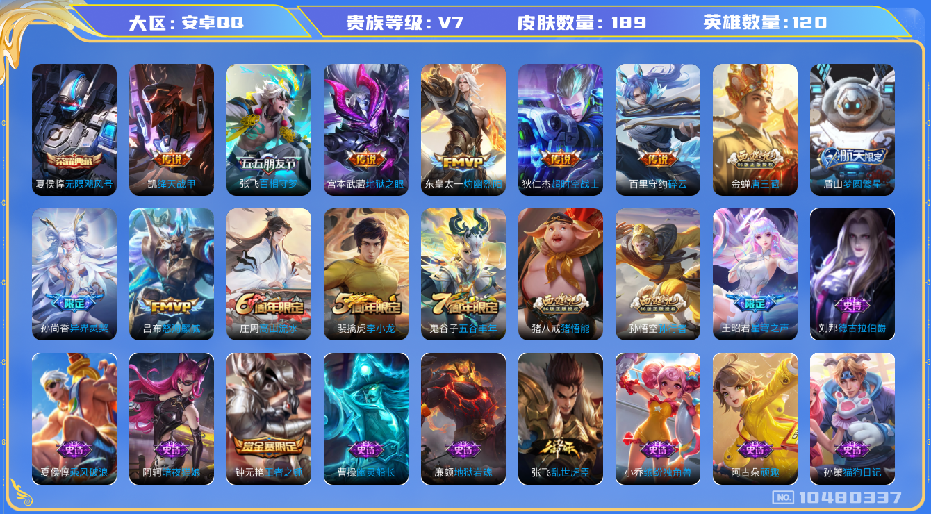 [10480337]v7 1典藏 9传说 120英雄 189皮肤 可修改实名 荣耀水晶:无限飓风号高达 传说皮:地狱之眼绛天战甲鸡嘴战神超时空战士-狄仁杰碎云百相守梦张飞灼幽烈阳 珍宝阁皮:优雅恋人蔷薇恋人 限定皮:异界灵契白毛香星穹之声高山流水怒海麟威五谷丰年李小龙孙行者猪悟能唐三藏梦圆繁星 史诗皮:苍穹之光电玩·爆裂旋风末日机甲-莱西奥冰冠公主江河有灵百解令蒙犽偶像歌手暗夜猫娘末日机甲-吕布猫狗日记-孙策乱世虎臣摇滚巨星水果甜心天才门将心灵骇客功夫厨神德古拉伯爵幽灵船长鬼剑武藏暗渊魔法心灵战警乐园奇幻夜地狱岩魂纤云弄巧拒霜思缤纷独角兽乘风破浪逐浪之夏金属风暴圣诞狂欢鹰眼统帅王者之锤魅力维加斯赏金猎手顽趣-阿古朵无心未来纪元-赵云