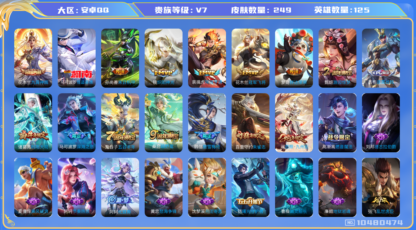 [10480474]v7 1典藏 1珍品传说 9传说 125英雄 249皮肤 可修改实名 荣耀水晶:九霄神辉木兰典藏 珍品传说:怪盗基德 传说皮:祥瑞亨通末日机甲-孙尚香绿蚂蚱冠军飞将炽阳神光胖达荣荣 珍宝阁皮:万物之道女武神 限定皮:愿照·九州拓澜年限逐霄战戟鸣野蒿傲雪梅呛时雨天司水龙头五谷丰年游园惊梦朱雀志守约年限深海之息深海大菠萝 史诗皮:星界战将茶境仙器灵·浮梦炉化蝶舞鸭鸭历险记-刘禅龙之律动雪豹·霜爪怒海争锋蔬乡物语鲁班七号破空之剑绮世丹青遇见神鹿紫霞仙子电玩小子小书包黄金分割率特工魅影千年之狐电玩·爆裂旋风冰冠公主江河有灵百解令蒙犽高渐离燃音魔法蒙恬荣光圣徽青蛇偶像歌手晚萤末日机甲-吕布猫狗日记-孙策乱世虎臣节奏热浪修罗女仆咖啡水果甜心天才门将心灵骇客功夫厨神德古拉伯爵暗隐猎兽者幽灵船长鬼剑武藏心灵战警地狱岩魂纤云弄巧缤纷独角兽乘风破浪月团寄思水晶猎龙者曙光守护者金属风暴原初追逐者圣诞恋歌鹰眼统帅魅力维加斯黎明之约无心未来纪元-赵云