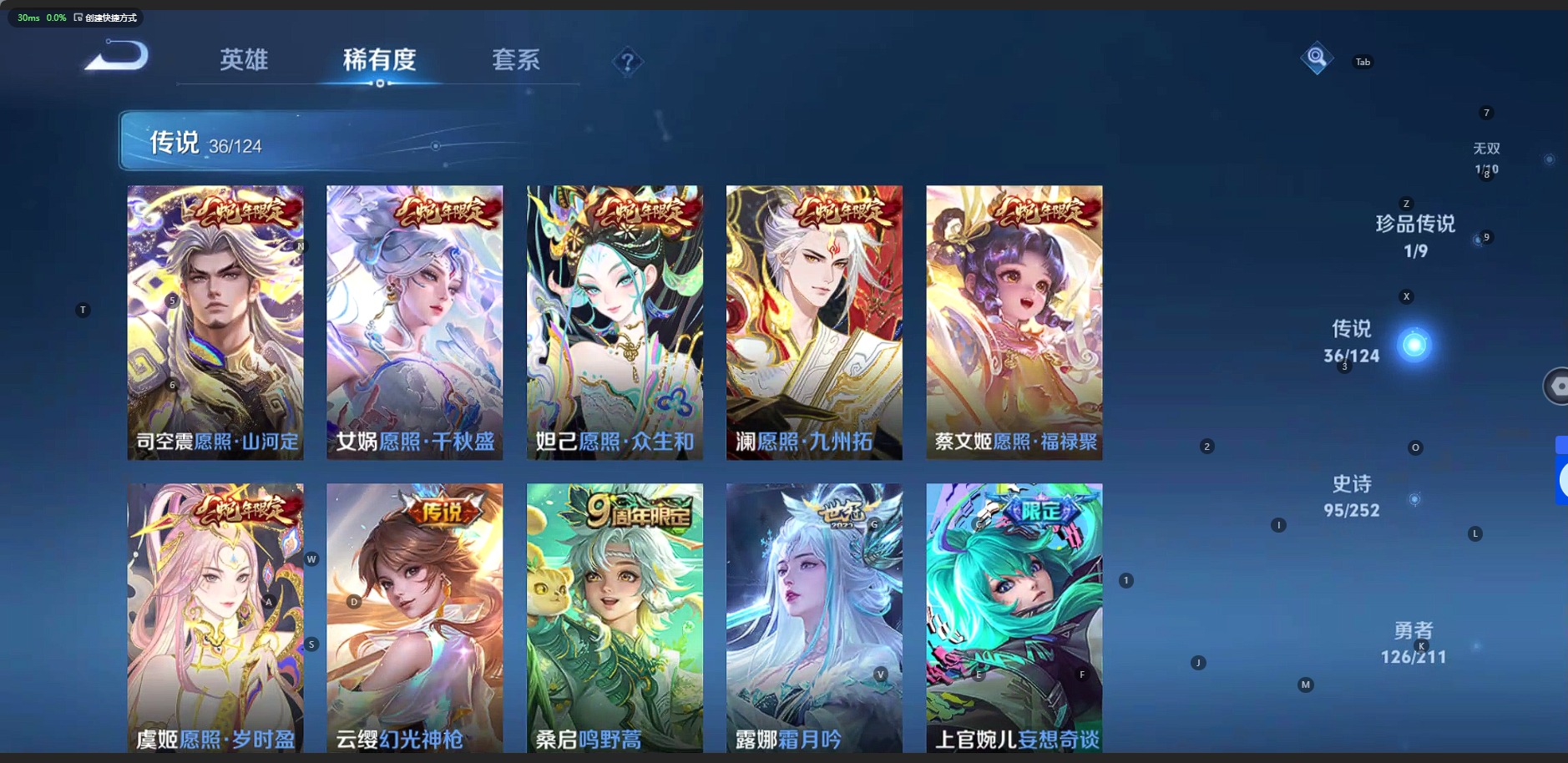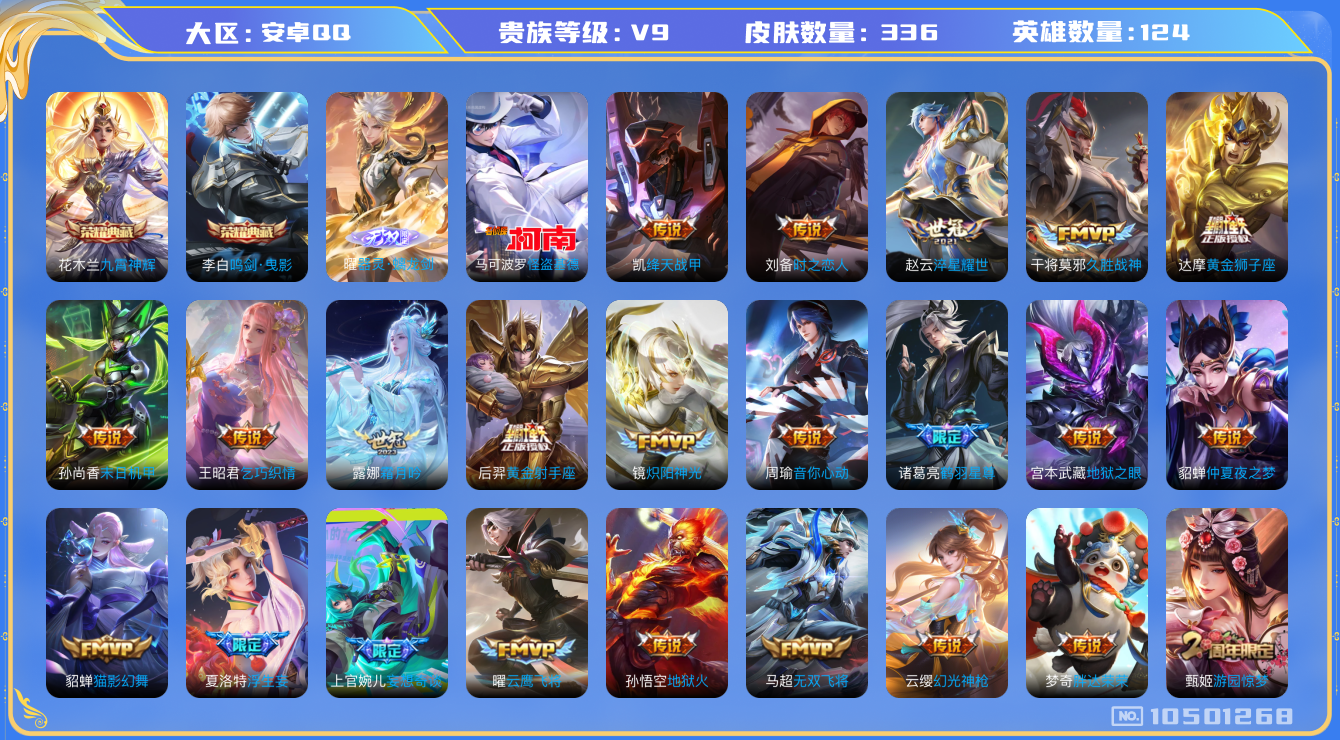 [10501268]v9 2典藏 1无双 1珍品传说 36传说 124英雄 336皮肤 可修改实名 荣耀水晶:鸣剑·曳影九霄神辉木兰典藏 无双皮:器灵·螭龙剑 珍品传说:怪盗基德 传说皮:幻光神呛黄金狮子座黄金射手座地狱火仲夏夜之梦大飞蛾地狱之眼末日机甲-孙尚香绿蚂蚱淬星耀世久胜战神猫影幻舞云鹰飞将小将军炽阳神光无双飞将音你心动-周瑜胖达荣荣乞巧织情时之恋人-刘备电焊工绛天战甲鸡嘴战神浮生妄鹤羽星尊妄想奇谈霜月吟 珍宝阁皮:妄想食味女武神玩趣恶龙 限定皮:愿照·九州拓澜年限愿照·福禄聚蔡文姬年限愿照·岁时盈虞姬年限愿照·山河定司空震年限愿照·众生和妲己年限愿照·千秋盛女娲年限逐霄战戟鸣野蒿至尊宝凤求凰白切鸡凤凰于飞太华伽罗年限绯月行神威电光马子飞衡韩信年限高山流水诗剑行五谷丰年游园惊梦梁祝御风骁将吕布年限天狼狩猎者岱宗典韦年限天狼溯光者天狼征服者祈雪灵祝雪兔子李小龙玄武志苏烈年限朱雀志守约年限永曜之星一生所爱冰霜恋舞曲蜜橘之夏 史诗皮:石田雨龙谪仙醉月百相守梦-百里守约茶境仙绮世丹青化蝶舞紫霞仙子苍穹之光电玩小子小书包白龙吟黄金分割率特工魅影千年之狐青蛇冰冠公主江河有灵高渐离燃音魔法蒙恬荣光圣徽偶像歌手晚萤龙骑士小龙虾魅语暗夜猫娘猫狗日记-孙策猫狗日记-大乔时之恋人-孙尚香乱世虎臣节奏热浪女仆咖啡摇滚巨星水果甜心绅士熊喵天才门将星夜王子心灵骇客功夫厨神德古拉伯爵暗隐猎兽者幽灵船长鬼剑武藏暗渊魔法心灵战警舞动绿茵地狱岩魂纤云弄巧繁星吟游呼啦呼啦缤纷独角兽乘风破浪逐浪之夏水晶猎龙者曙光守护者金属风暴原初追逐者圣诞狂欢圣诞恋歌鹰眼统帅王者之锤黎明之约无心未来纪元-赵云
