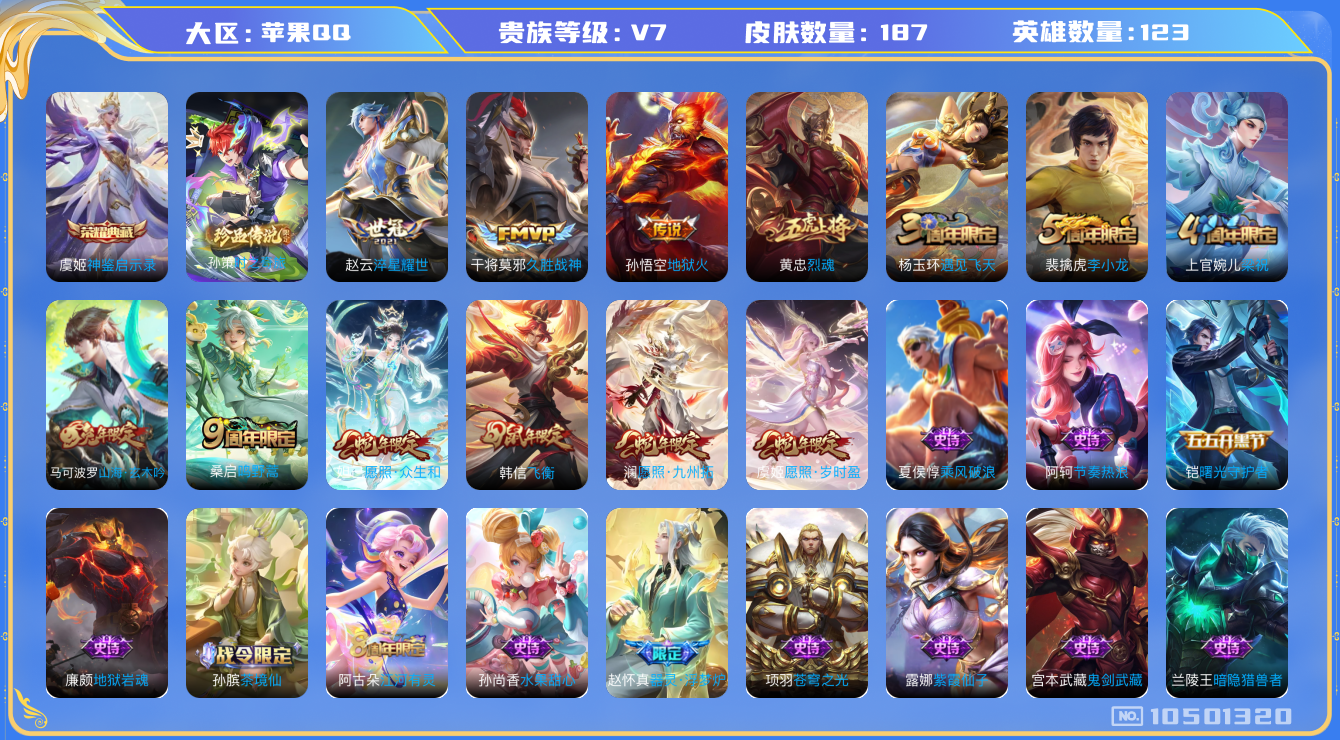 [10501320]v7 1典藏 1珍品传说 7传说 123英雄 187皮肤 可修改实名 荣耀水晶:神鉴启示录 珍品传说:时之奇旅-孙策 传说皮:地狱火淬星耀世久胜战神 珍宝阁皮:玩趣恶龙 限定皮:愿照·九州拓澜年限愿照·岁时盈虞姬年限愿照·众生和妲己年限鸣野蒿飞衡韩信年限遇见飞天梁祝烈魂李小龙山海·玄木吟马可年限 史诗皮:茶境仙器灵·浮梦炉芈月浮光幕影决胜骁骑上官婉儿群星魔术团破空之剑紫霞仙子苍穹之光特工魅影千年之狐江河有灵百解令蒙犽偶像歌手龙骑士小龙虾节奏热浪女仆咖啡摇滚巨星水果甜心心灵骇客暗隐猎兽者鬼剑武藏心灵战警舞动绿茵地狱岩魂纤云弄巧繁星吟游呼啦呼啦拒霜思乘风破浪水晶猎龙者曙光守护者圣诞恋歌鹰眼统帅未来纪元-赵云