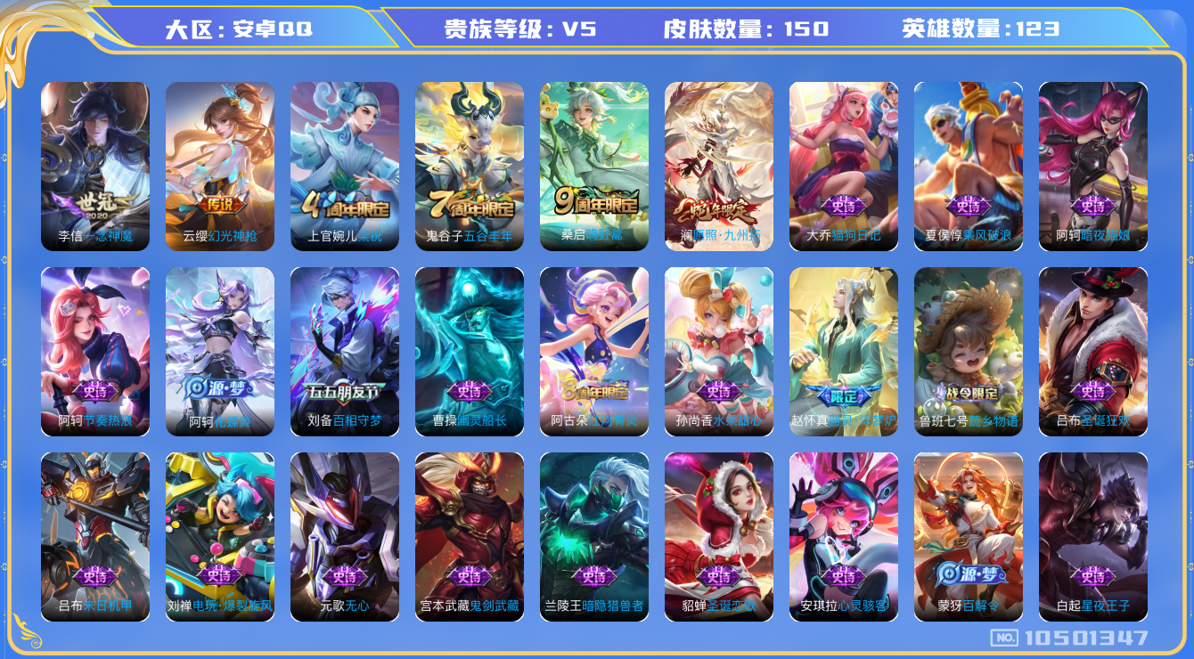[10501347]v5 4传说 123英雄 150皮肤 可修改实名 传说皮:幻光神呛一念神魔 珍宝阁皮:蔷薇恋人 限定皮:愿照·九州拓澜年限鸣野蒿五谷丰年梁祝 史诗皮:器灵·浮梦炉蔬乡物语鲁班七号化蝶舞江河有灵百解令蒙犽冰冠公主偶像歌手电玩·爆裂旋风百相守梦刘备暗夜猫娘龙骑士小龙虾末日机甲-吕布猫狗日记-大乔节奏热浪女仆咖啡摇滚巨星水果甜心星夜王子心灵骇客功夫厨神暗隐猎兽者幽灵船长鬼剑武藏纤云弄巧乘风破浪金属风暴圣诞狂欢圣诞恋歌鹰眼统帅魅力维加斯无心