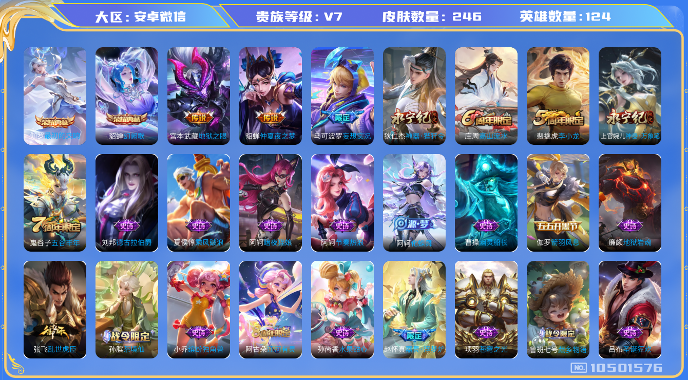 [10501576]v7 2典藏 4传说 124英雄 246皮肤 可修改实名 安全保护中 荣耀水晶:最初的交响伽罗典藏幻阙歌貂蝉典藏 传说皮:仲夏夜之梦大飞蛾地狱之眼神器·狴犴令妄想实况 珍宝阁皮:优雅恋人玩趣恶龙 限定皮:高山流水五谷丰年李小龙神器·万象笔 史诗皮:茶境仙器灵·浮梦炉化蝶舞蔬乡物语鲁班七号紫霞仙子苍穹之光特工魅影千年之狐永昼电玩·爆裂旋风电玩·兔顽号冰冠公主江河有灵蒙恬荣光圣徽偶像歌手暗夜猫娘龙骑士小龙虾乱世虎臣节奏热浪修罗女仆咖啡摇滚巨星水果甜心绅士熊喵天才门将星夜王子功夫厨神德古拉伯爵暗隐猎兽者幽灵船长鬼剑武藏舞动绿茵地狱岩魂缤纷独角兽乘风破浪逐浪之夏水晶猎龙者箭羽风息唤灵魅影金属风暴原初追逐者圣诞狂欢圣诞恋歌鹰眼统帅魅力维加斯黎明之约赏金猎手奇遇舞章无心未来纪元-赵云