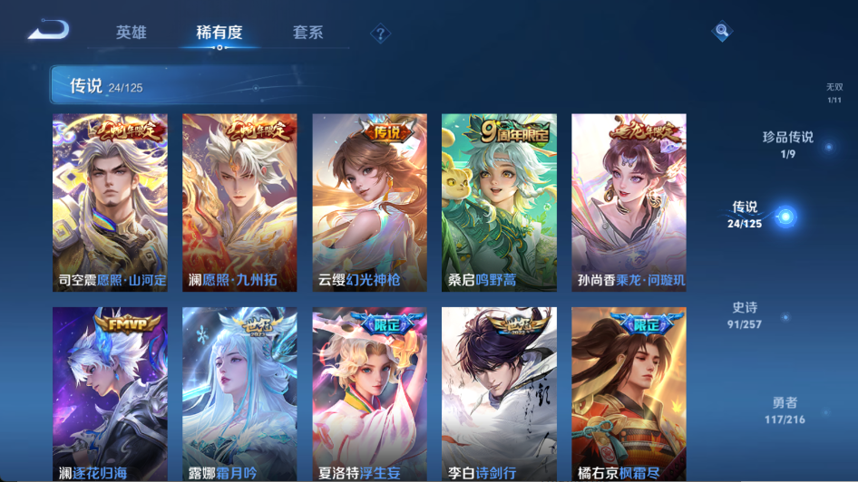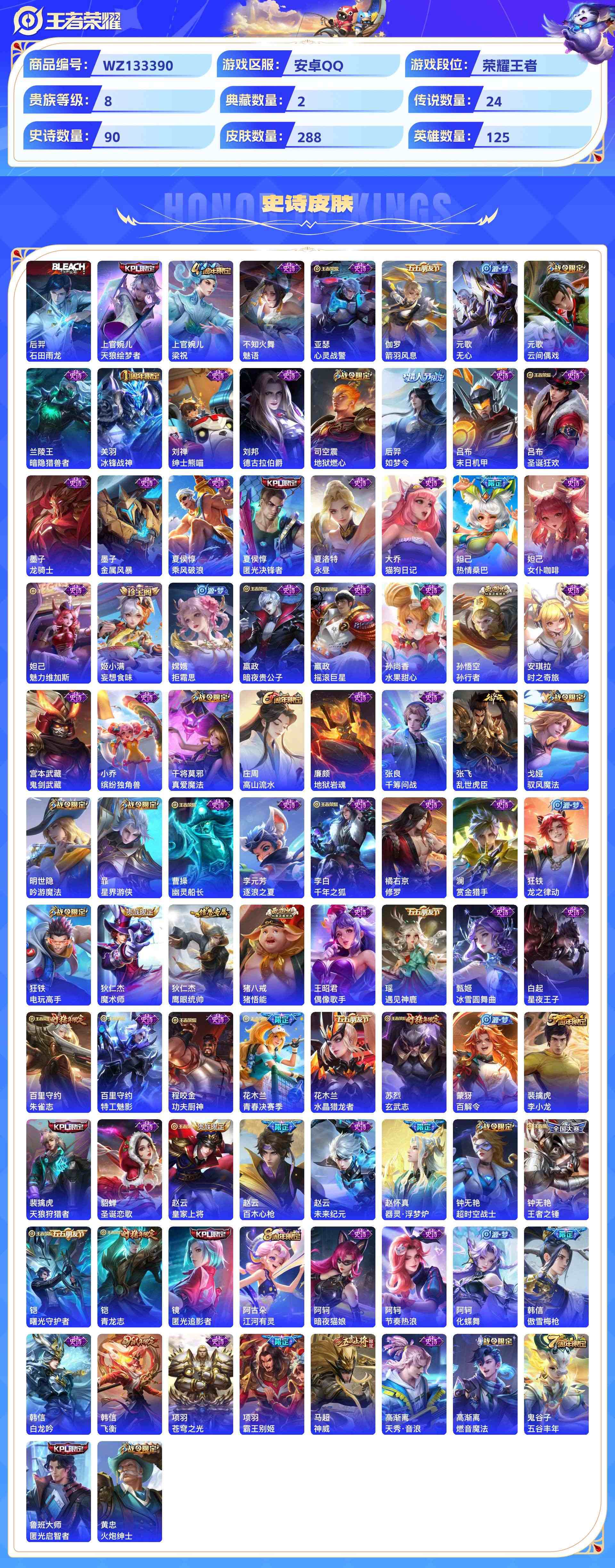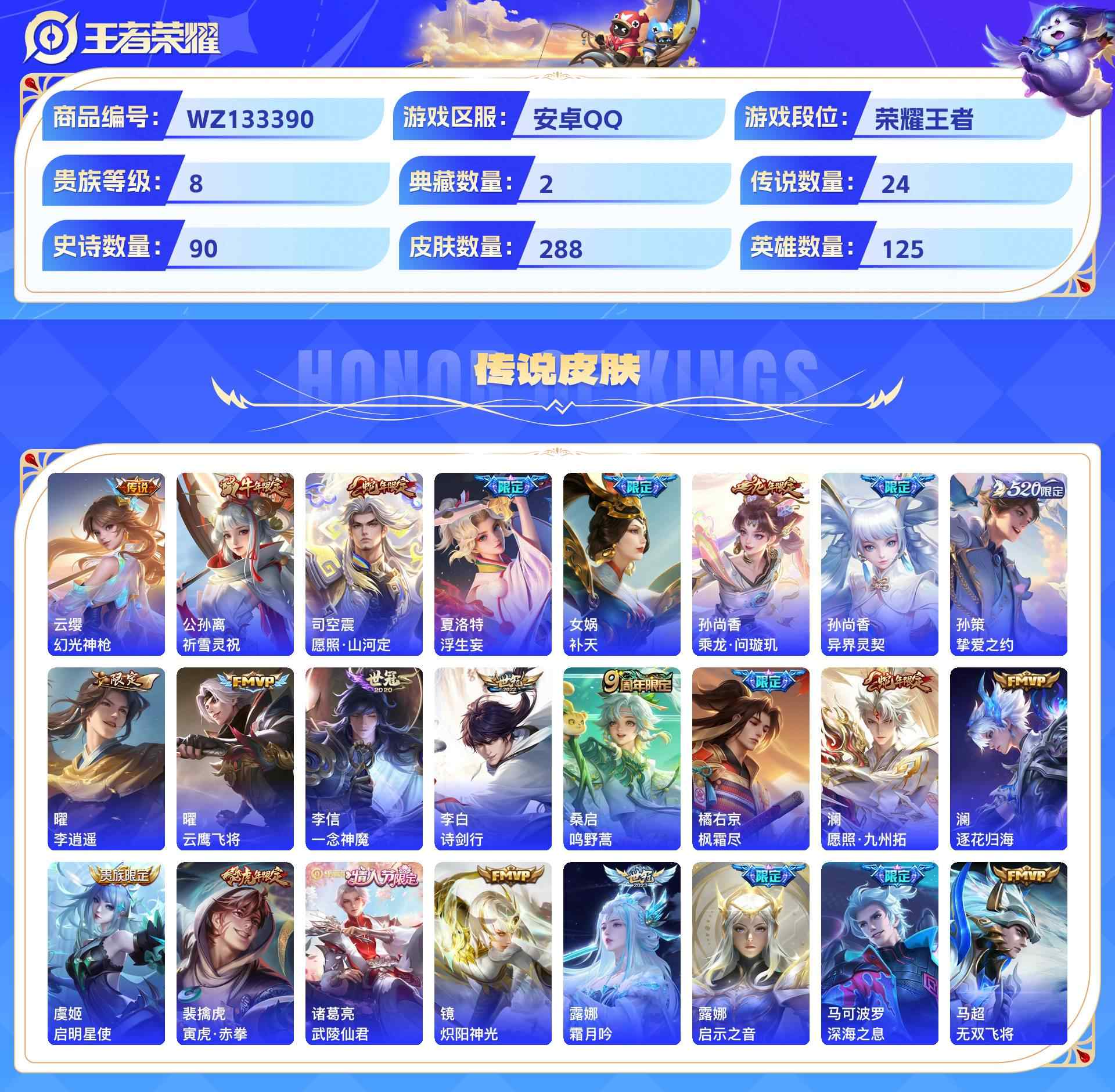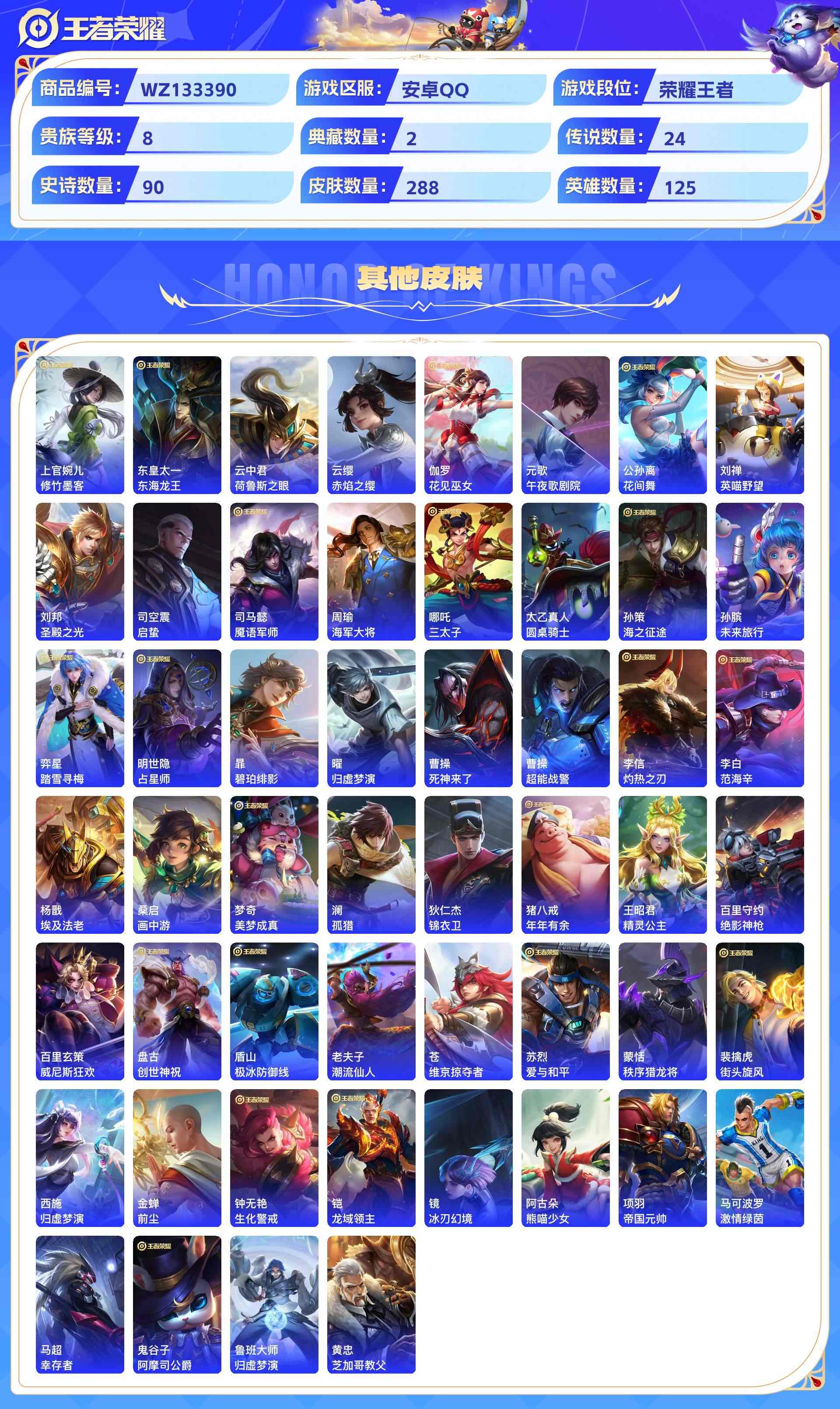 wz133390|可二次 安卓qq 288皮 贵族8级 2典藏 1珍品传说 1无双 24传说 90史诗 10个性按键 4个性签名 2个性天幕【荣耀典藏】鸣剑·曳影弑呛猎影【珍品传说】时之奇旅【无双限定】器灵·螭龙剑