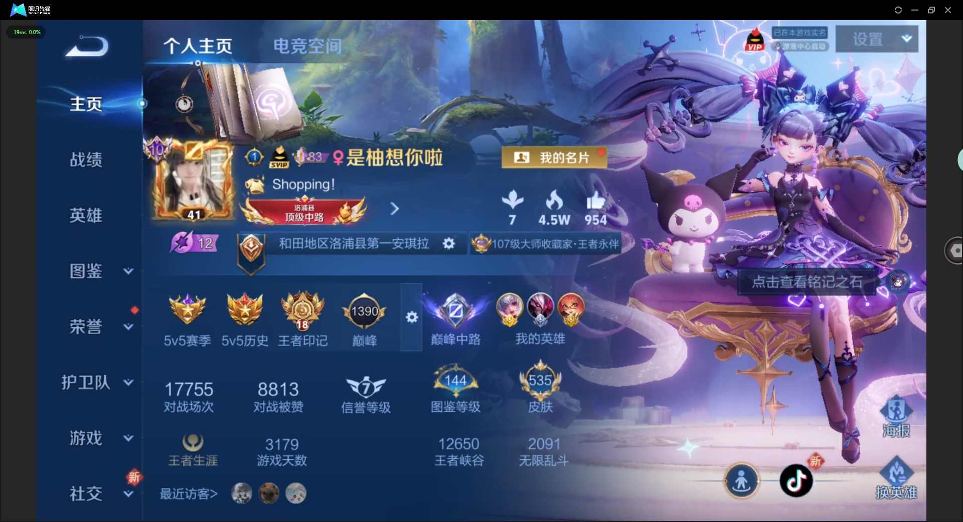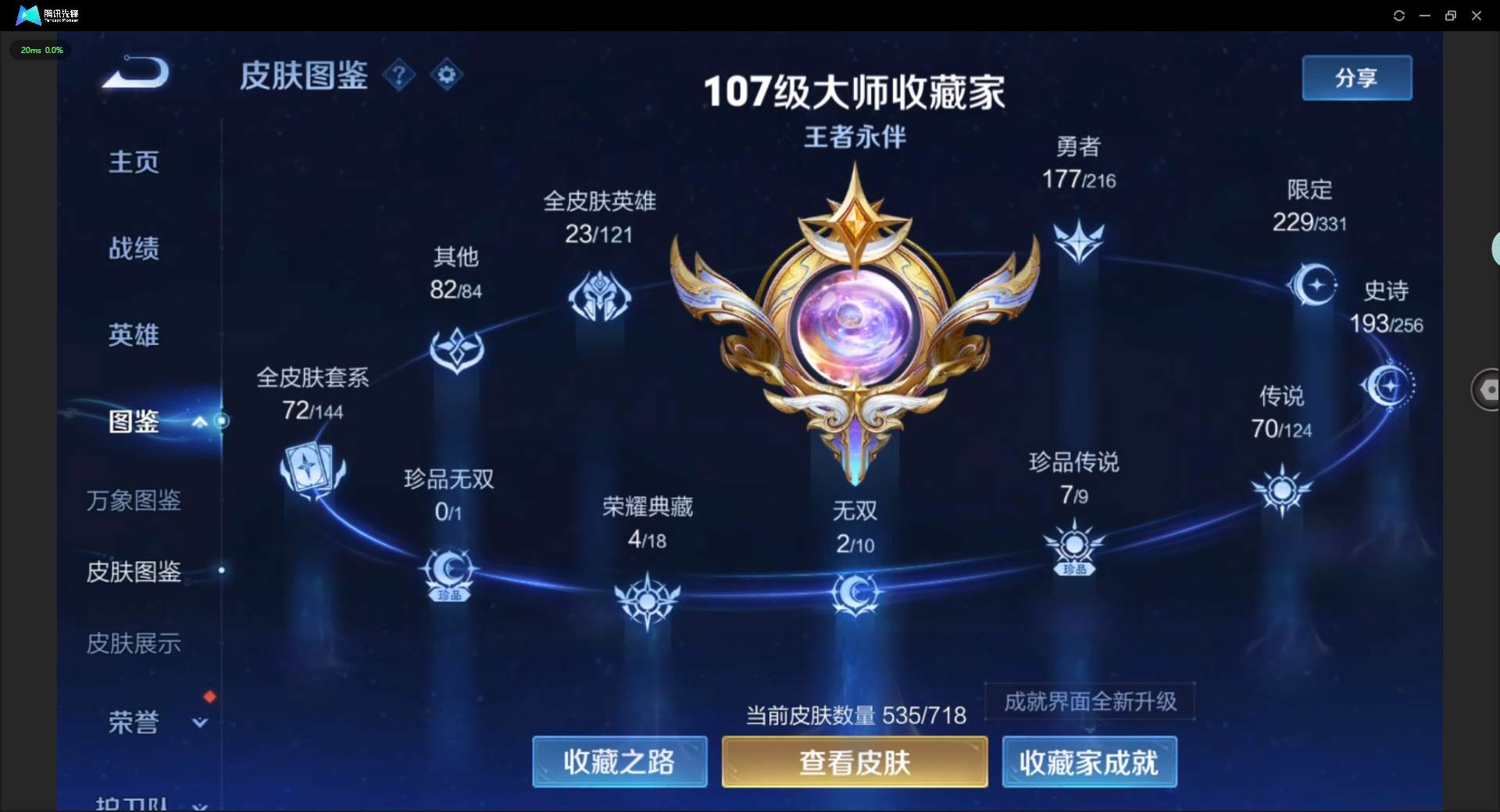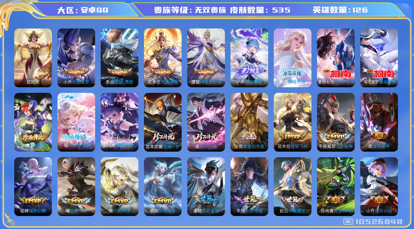 [10526848]贵族无双贵族 荣耀典藏5 无双2 珍品传说7 传说皮肤70 史诗皮肤192 皮肤数量535 皮肤价值:498794 英雄126 绝世王者