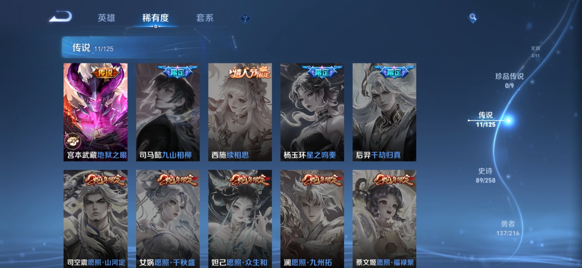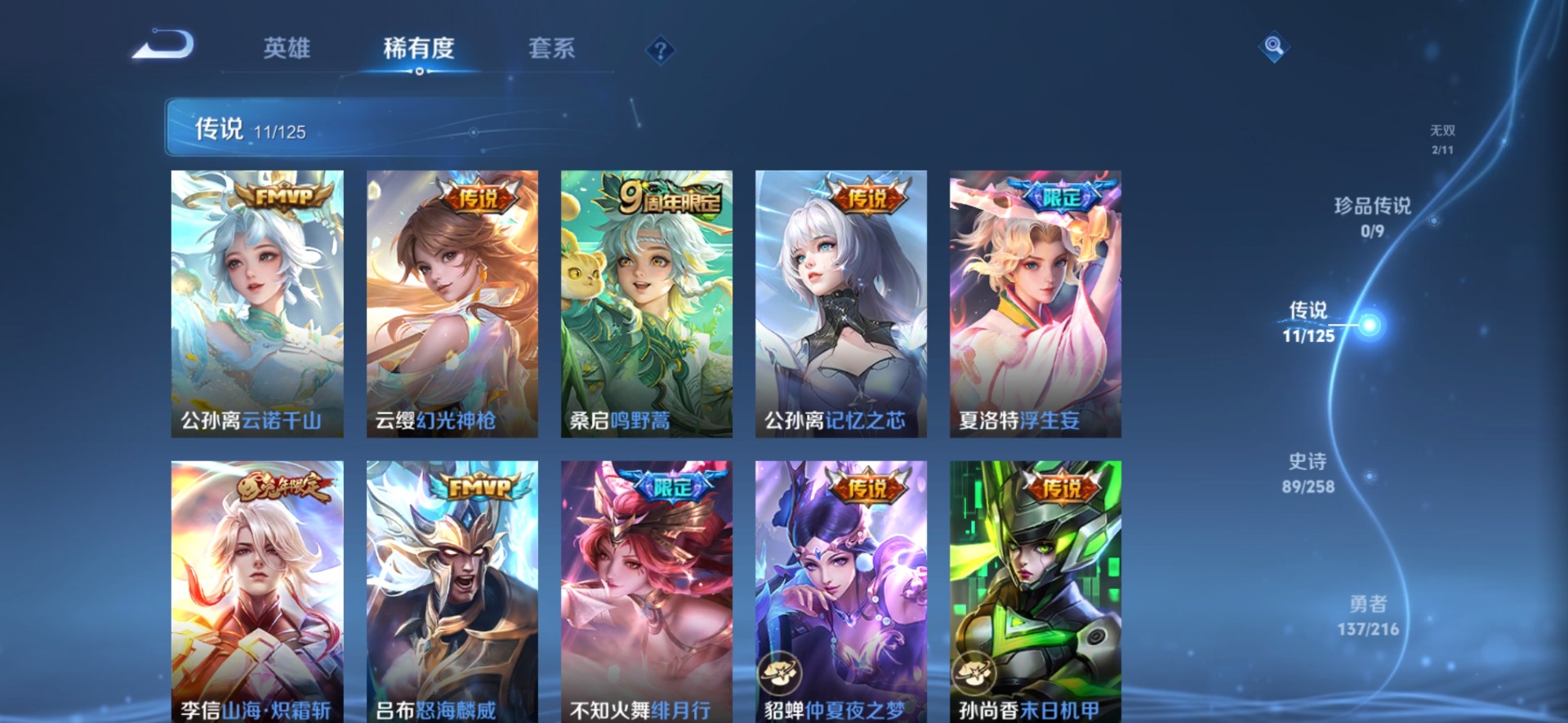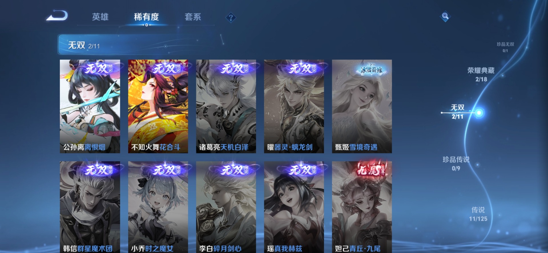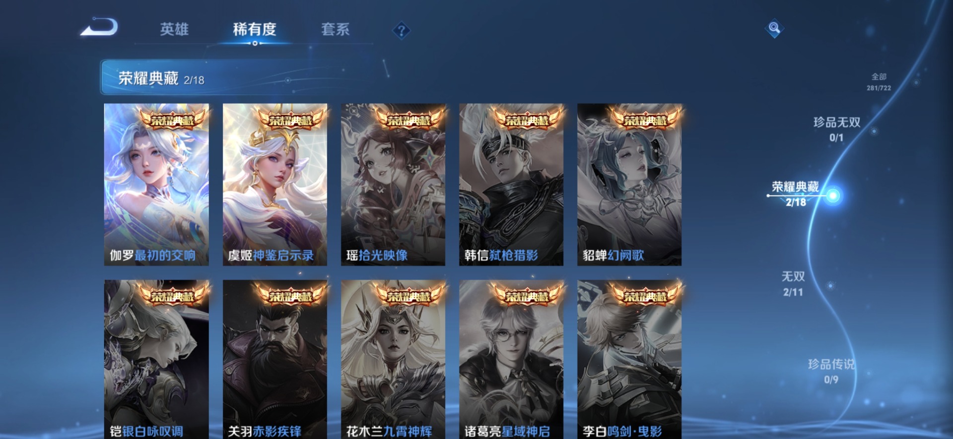 v7 2典藏 2无双 11传说 125英雄 281皮肤 可修改实名 荣耀水晶:最初的交响伽罗典藏神鉴启示录 无双皮:离恨烟公孙离无双花合斗 传说皮:云诺千山幻光神呛山海·炽霜斩李信年限仲夏夜之梦大飞蛾地狱之眼末日机甲-孙尚香绿蚂蚱浮生妄记忆之芯机甲兔 珍宝阁