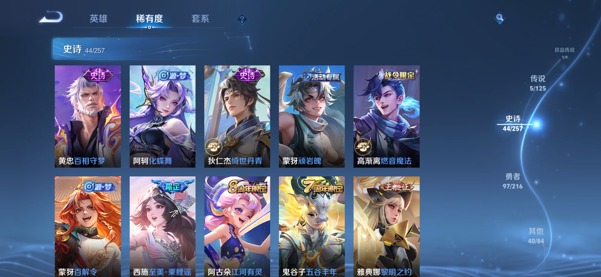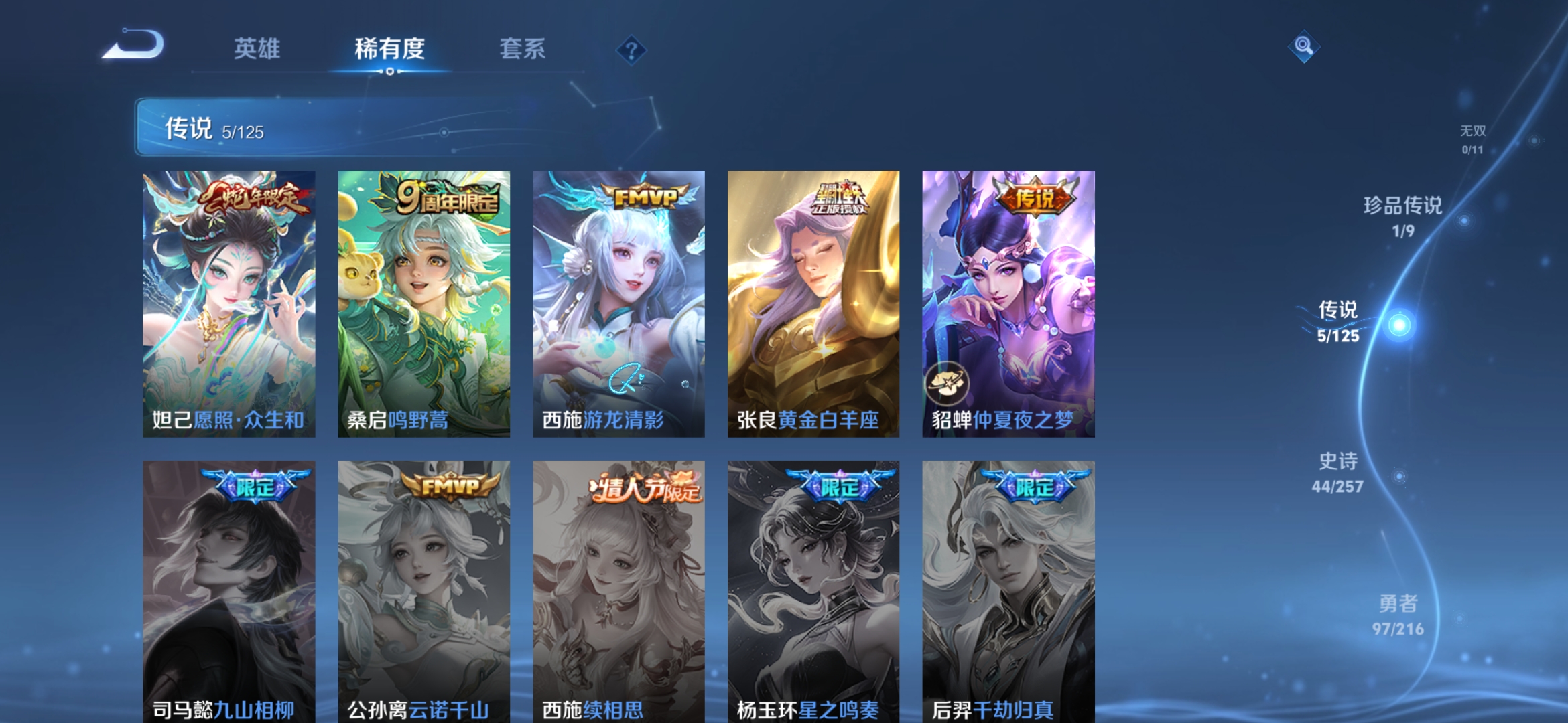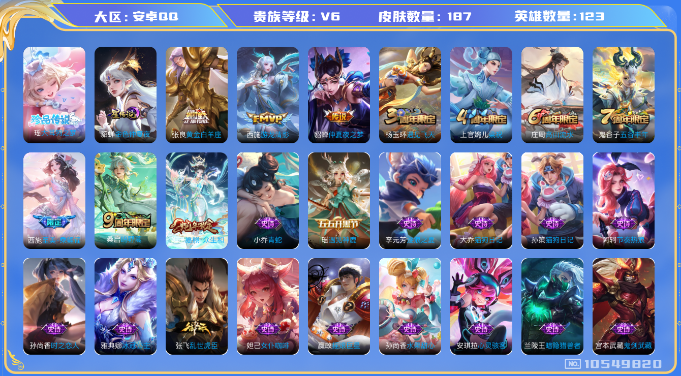 [10549820]实名: 可修改 贵族等级: v6 英雄数: 123 皮肤数: 187 珍品传说: 大耳狗之梦 星传说: 金色仲夏夜 传说皮: 黄金白羊座仲夏夜之梦游龙清影 限定皮: 遇见飞天梁祝高山流水五谷丰年至美·乘鲤谣鸣野蒿愿照·众生和 【由于赛季三个月更新一次,段位皆有上号为准,对段位有要求这谨慎下单!!!】