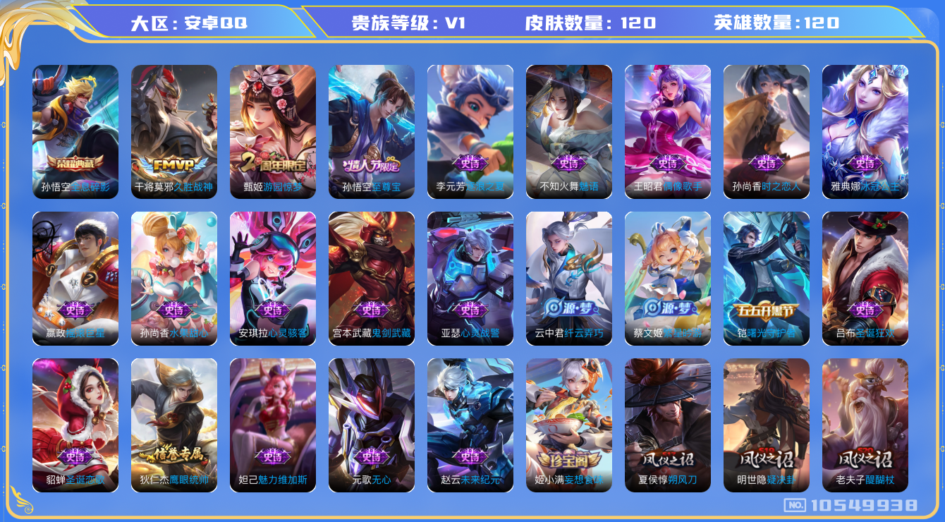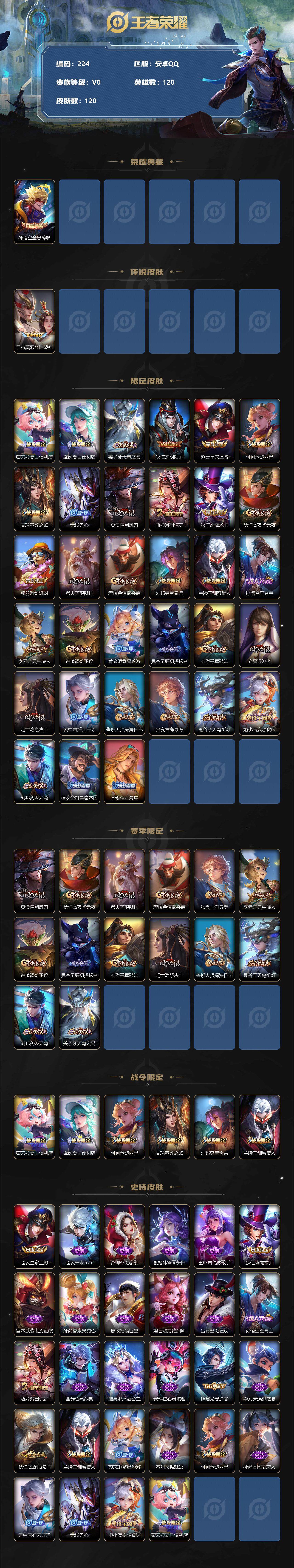 [10549938]【商品标题】:安卓q-v0-最强王者段位-120英雄1典-120皮肤-藏-0珍品无双-0无双-0珍品传说-1传说-28史诗 【荣耀典藏】:孙悟空全息碎影 【传说皮肤】:干将莫邪久胜战神 【限定皮肤】:蔡文姬夏日便利店,虞姬夏日便利店,姜子牙天穹之誓,狄仁杰阴阳师,赵云皇家上将,阿轲迷踪丽影,周瑜赤莲之焰,元歌无心,夏侯惇朔风刀,甄姬游园惊梦,狄仁杰魔术师,狄仁杰万华元夜,项羽海滩派对,老夫子醍醐杖,程咬金演武夺筹,刘邦夺宝奇兵,兰陵王驯魔猎人,孙悟空至尊宝,李元芳云中旅人,钟馗驱傩正仪,蔡文姬繁星吟游,鬼谷子原初探秘者,苏烈千军破阵,弈星混沌棋,明世隐疑决卦,云中君纤云弄巧,鲁班大师探海日志,张良古海寻踪,鬼谷子天穹祈灯,姬小满妄想食味,刘邦剑破天穹,程咬金群星魔术团,周瑜熔金海岸 【赛季限定】:夏侯惇朔风刀,狄仁杰万华元夜,老夫子醍醐杖,程咬金演武夺筹,张良古海寻踪,李元芳云中旅人,钟馗驱傩正仪,鬼谷子原初探秘者,苏烈千军破阵,弈星混沌棋,明世隐疑决卦,鲁班大师探海日志,鬼谷子天穹祈灯,刘邦剑破天穹,姜子牙天穹之誓 【战令限定】:蔡文姬夏日便利店,虞姬夏日便利店,阿轲迷踪丽影,周瑜赤莲之焰,刘邦夺宝奇兵,兰陵王驯魔猎人 【史诗皮肤】:赵云皇家上将,赵云未来纪元,貂蝉圣诞恋歌,甄姬冰雪圆舞曲,王昭君偶像歌手,狄仁杰魔术师,宫本武藏鬼剑武藏,孙尚香水果甜心,嬴政摇滚巨星,妲己魅力维加斯,吕布圣诞狂欢,孙悟空至尊宝,甄姬游园惊梦,亚瑟心灵战警,雅典娜冰冠公主,安琪拉心灵骇客,铠曙光守护者,李元芳逐浪之夏,狄仁杰鹰眼统帅,兰陵王驯魔猎人,蔡文姬繁星吟游,不知火舞魅语,阿轲迷踪丽影,孙尚香时之恋人,云中君纤云弄巧,元歌无心,姬小满妄想食味,蔡文姬夏日便利店 【其他皮肤】:项羽海滩派对,韩信教廷特使,韩信街头霸王,露娜哥特玫瑰,达摩大发明家,赵云忍炎影,程咬金爱与正义,宫本武藏未来纪元,安琪拉玩偶对对碰,妲己少女阿狸,典韦黄金武士,亚瑟死亡骑士,花木兰兔女郎,刘备万事如意,狄仁杰阴阳师,刘备汉昭烈帝,王昭君幻想奇妙夜,老夫子功夫老勺,诸葛亮掌控之力,鬼谷子幻乐之宴,吕布野性能量,夏侯惇朔风刀,周瑜赤莲之焰,弈星混沌棋,哪吒次元突破,鲁班七号黑桃队长,明世隐疑决卦,刘邦夺宝奇兵,盾山圆桌骑士,老夫子醍醐杖,鬼谷子原初探秘者,狄仁杰万华元夜,杨戬次元傲视,程咬金演武夺筹,钟馗驱