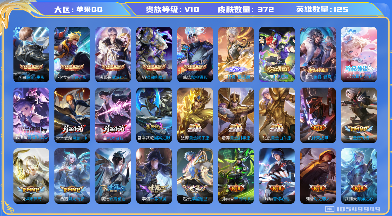 [10549949]0abeji可二次"372皮肤v10无双1水晶5珍品传说6传说33优质限定25 无设备脸 钱包已注销 信用分正常 水晶皮肤:鸣剑·曳影弑呛猎影全息碎影银白咏叹调星域神启 无双皮肤:器灵·螭龙剑 珍品传说皮肤:时之奇旅-孙策黑崎一护朽木白哉酷洛米之心兔狲·蓬尾大耳狗之梦 新传说限定:愿照·山河定愿照·九州拓愿照·众生和愿照·千秋盛愿照·岁时盈愿照·福禄聚 传说限定:乘龙·淬吴钩寅虎·赤拳艾琳觅芳踪启明星使 新传说皮肤:幻光神呛 传说皮肤:怒海麟威一念神魔乞巧织情游龙清影末日机甲-孙尚香黄金射手座飞鸢探春云霓雀翎碎云黄金狮子座胖达荣荣无双飞将淬星耀世地狱之眼时之恋人-刘备绛天战甲云鹰飞将炽阳神光音你心动-周瑜海洋之心黄金白羊座鸣野蒿 新史诗限定:器灵·浮梦炉千劫归真雪豹·霜爪 史诗限定:寅虎·御盾御风骁将引擎之心龙胆飞衡至尊宝孙行者冰霜神祇唐三藏朱雀志逐梦之影匿光破解者 新史诗皮肤:灵蛊蚀心石田雨龙狼魂孤将 优质史诗皮肤:天秀·启明天降福星晚萤修罗赏金猎手青蛇魅语诗语江南时之恋人-孙尚香白蛇遇见神鹿 周年皮肤:江河有灵高山流水五谷丰年 珍宝阁:玩趣恶龙胡桃夹子 史诗皮肤:地狱岩魂星夜王子圣诞狂欢末日机甲-吕布乘风破浪幽灵船长苍穹之光功夫厨神德古拉伯爵水晶猎龙者心灵战警猫狗日记-孙策未来纪元-赵云暗夜猫娘节奏热浪鬼剑武藏千年之狐紫霞仙子暗隐猎兽者冰冠公主曙光守护者热力回旋纤云弄巧顽趣-阿古朵缤纷独角兽金属风暴龙骑士魅力维加斯女仆咖啡摇滚巨星暗夜贵公子冰雪圆舞曲圣诞恋歌心灵骇客偶像歌手黄金分割率水果甜心电玩小子鹰眼统帅逐浪之夏特工魅影无限星赏官箭羽风息绅士熊喵天才门将乱世虎臣乐园奇幻夜舞动绿茵猫狗日记-大乔 "