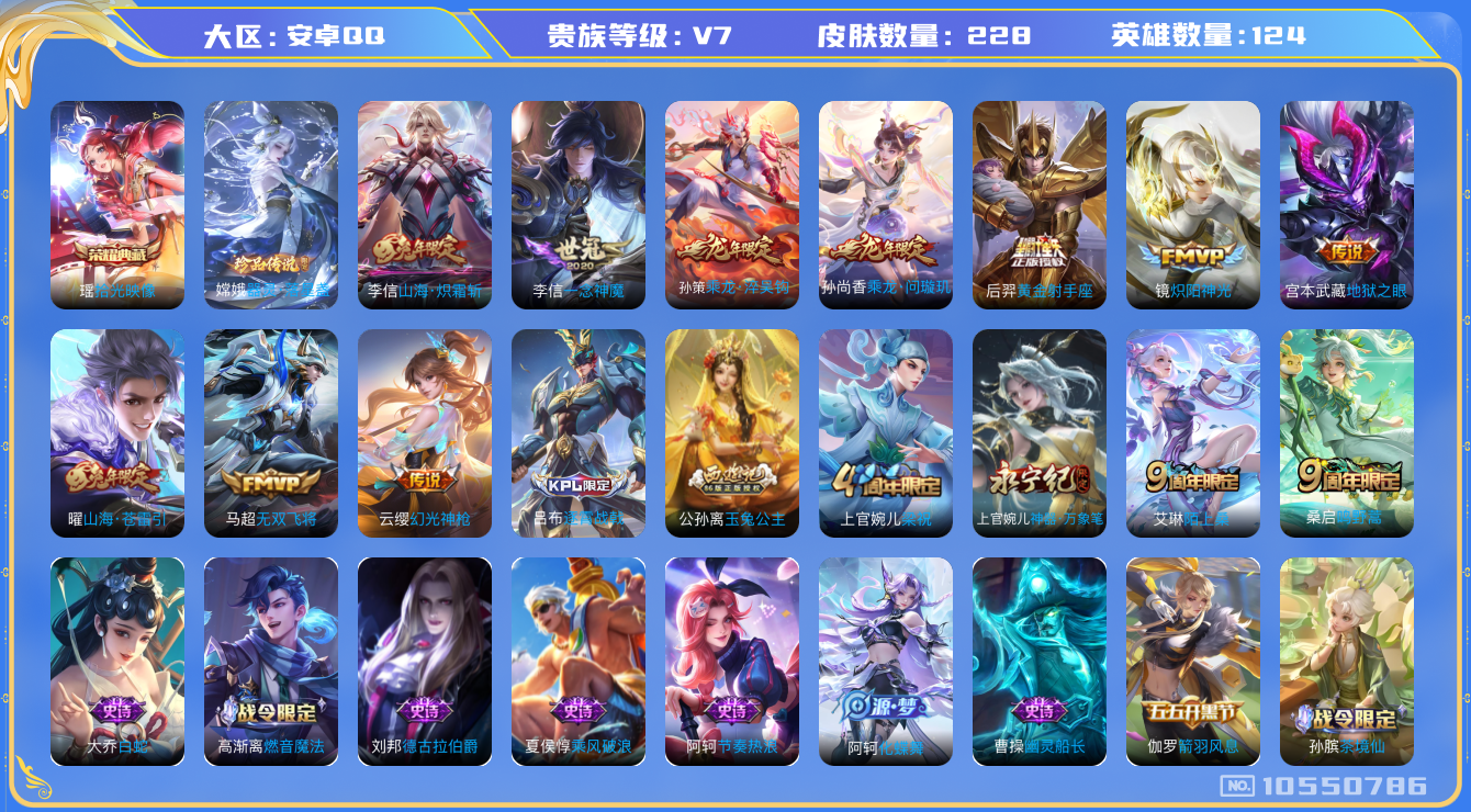 [10550786]v7 1典藏 1珍品传说 11传说 124英雄 228皮肤 可修改实名 女号 荣耀水晶:拾光映像瑶典藏 珍品传说:器灵·落星盏 传说皮:乘龙·问璇玑孙尚香年限乘龙·淬吴钩孙策年限幻光神呛山海·炽霜斩李信年限黄金射手座地狱之眼一念神魔炽阳神光无双飞将山海·苍雷引电光曜子 珍宝阁皮:妄想食味胡桃夹子 限定皮:逐霄战戟陌上桑鸣野蒿梁祝玉兔公主神器·万象笔 史诗皮:星界战将茶境仙鸭鸭历险记-刘禅龙之律动百相守梦-百里守约东方月初蒙犽顽岩魄星界特工化蝶舞破空之剑遇见神鹿紫霞仙子特工魅影千年之狐江河有灵高渐离燃音魔法百解令蒙犽蒙恬荣光圣徽冰冠公主偶像歌手魅语白蛇电玩·爆裂旋风末日机甲-吕布猫狗日记-孙策节奏热浪女仆咖啡水果甜心天才门将心灵骇客功夫厨神德古拉伯爵暗隐猎兽者幽灵船长鬼剑武藏心灵战警诗语江南纤云弄巧拒霜思缤纷独角兽乘风破浪逐浪之夏水晶猎龙者箭羽风息金属风暴原初追逐者圣诞狂欢圣诞恋歌鹰眼统帅暗夜贵公子黎明之约无心未来纪元-赵云
