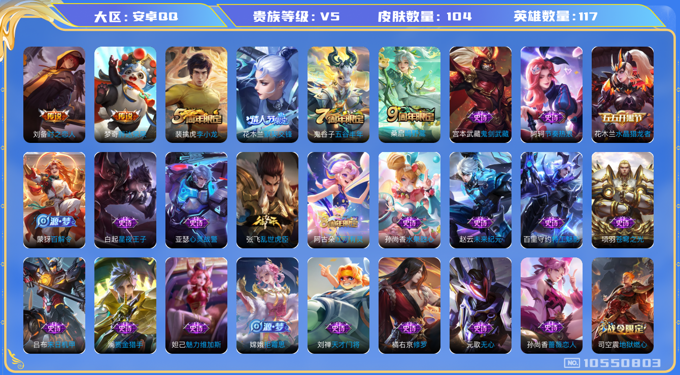 [10550803]v5 3传说 117英雄 104皮肤 可修改实名 传说皮:胖达荣荣时之恋人-刘备电焊工 珍宝阁皮:蔷薇恋人 限定皮:鸣野蒿五谷丰年李小龙默契交锋-花木兰 史诗皮:苍穹之光特工魅影江河有灵百解令蒙犽末日机甲-吕布乱世虎臣节奏热浪修罗水果甜心天才门将星夜王子鬼剑武藏心灵战警拒霜思水晶猎龙者魅力维加斯赏金猎手无心未来纪元-赵云
