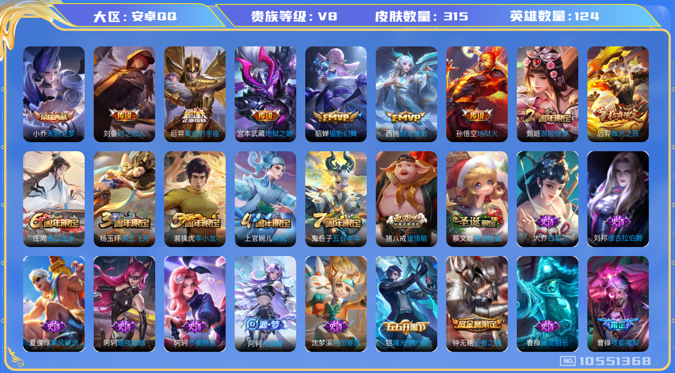 [10551368]v8 1典藏 7传说 124英雄 315皮肤 可修改实名 荣耀水晶:天鹅之梦小乔典藏 传说皮:游龙清影小青龙黄金射手座地狱火地狱之眼猫影幻舞时之恋人-刘备电焊工 珍宝阁皮:胡桃夹子蔷薇恋人玩趣恶龙 限定皮:遇见飞天高山流水五谷丰年游园惊梦梁祝李小龙辉光之辰奇迹圣诞猪悟能 史诗皮:化蝶舞鸭鸭历险记-刘禅龙之律动曹操夜都魔契紫霞仙子苍穹之光特工魅影千年之狐电玩·爆裂旋风冰冠公主蒙恬荣光圣徽偶像歌手青蛇晚萤白蛇暗夜猫娘龙骑士小龙虾末日机甲-吕布时之恋人-孙尚香乱世虎臣节奏热浪女仆咖啡摇滚巨星水果甜心绅士熊喵天才门将星夜王子心灵骇客功夫厨神德古拉伯爵暗隐猎兽者幽灵船长鬼剑武藏舞动绿茵地狱岩魂纤云弄巧繁星吟游呼啦呼啦缤纷独角兽乘风破浪逐浪之夏月团寄思水晶猎龙者曙光守护者箭羽风息金属风暴原初追逐者圣诞狂欢圣诞恋歌鹰眼统帅王者之锤暗夜贵公子魅力维加斯黎明之约无心未来纪元-赵云