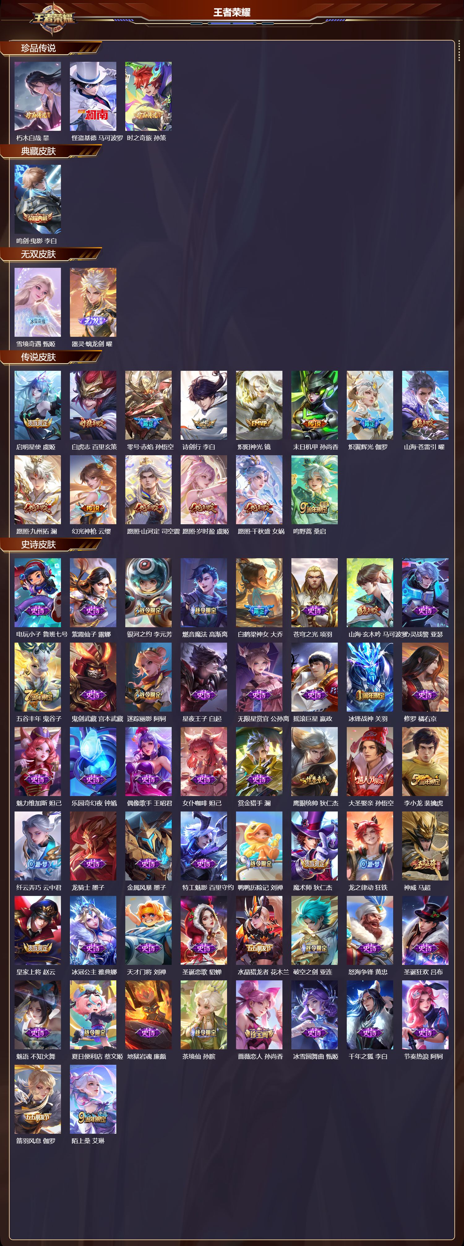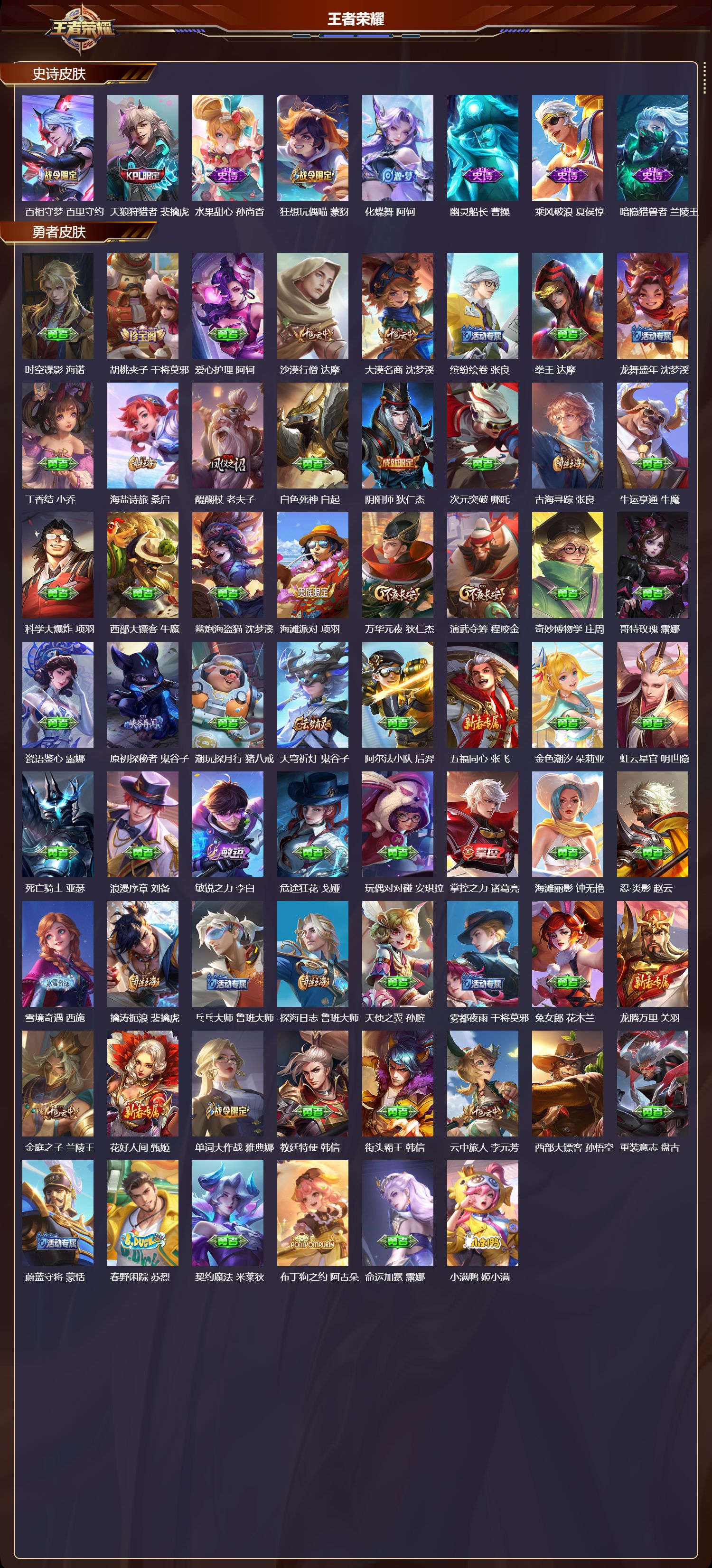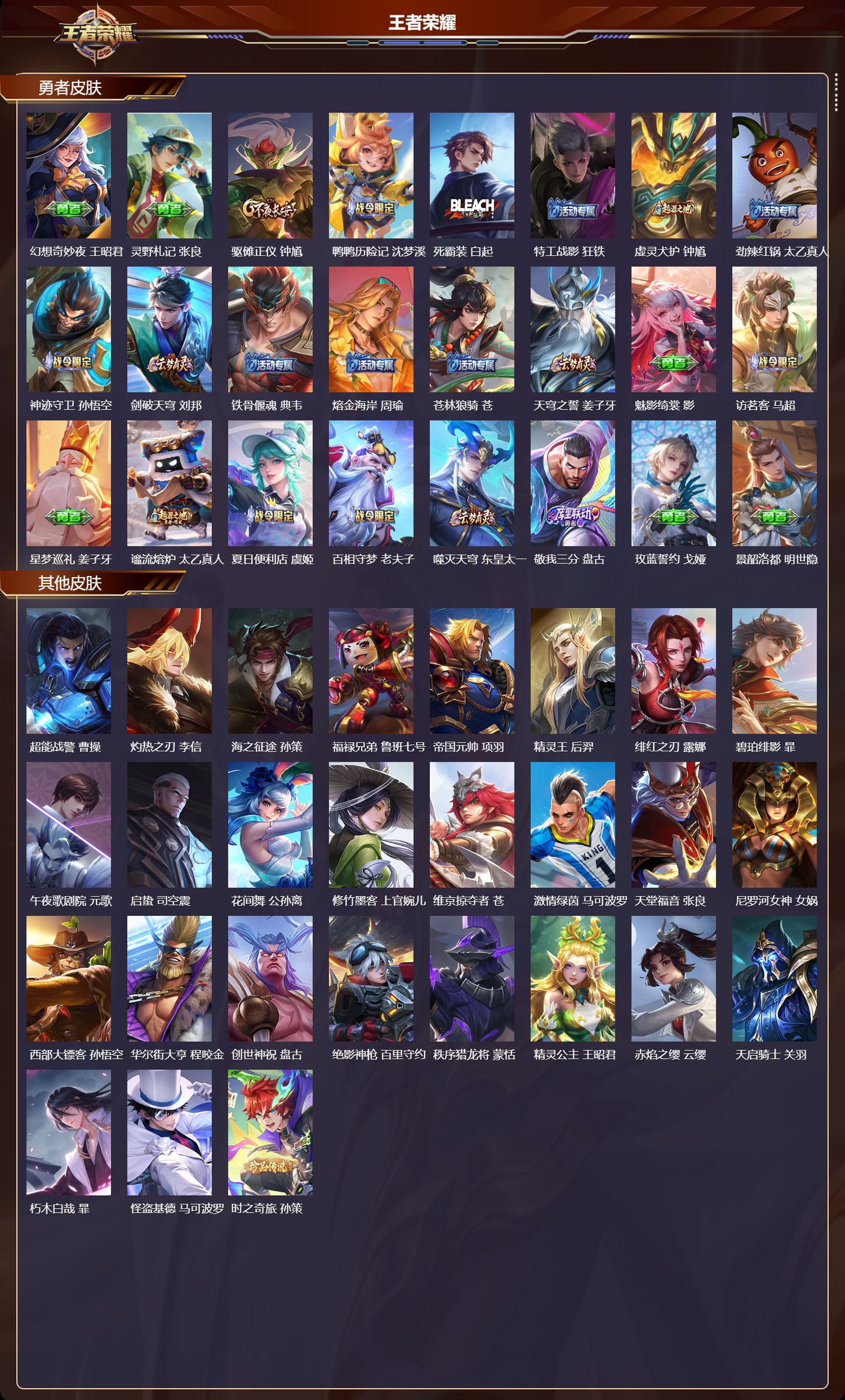 _2101892-q/永恒钻石/187皮肤/125英雄/1典藏/0珍品无双/2无双/3珍品传说/14传说/58史诗/9稀有英雄 【3珍品传说】朽木白哉暃怪盗基德马可波罗时之奇旅孙策 【1典藏皮肤】鸣剑·曳影李白 【2无双皮肤】雪境奇遇甄姬器灵·螭龙剑曜 【14传说皮肤】启明星使虞姬白虎志百里玄策零号·赤焰孙悟空诗剑行李白炽阳神光镜末日机甲孙尚香炽翼辉光伽罗山海·苍雷引曜愿照·九州拓澜幻光神呛云缨愿照·山河定司空震愿照·岁时盈虞姬愿照·千秋盛女娲鸣野蒿桑启 【58史诗皮肤】电玩小子鲁班七号紫霞仙子露娜银河之约李元芳燃音魔法高渐离白鹤梁神女大乔苍穹之光项羽山海·玄木吟马可波罗心灵战警亚瑟五谷丰年鬼谷子鬼剑武藏宫本武藏迷踪丽影阿轲星夜王子白起无限星赏官公孙离摇滚巨星嬴政冰锋战神关羽修罗橘右京魅力维加斯妲己乐园奇幻夜钟馗偶像歌手王昭君女仆咖啡妲己赏金猎手澜鹰眼统帅狄仁杰大圣娶亲孙悟空李小龙裴擒虎纤云弄巧云中君龙骑士墨子金属风暴墨子特工魅影百里守约鸭鸭历险记刘禅魔术师狄仁杰龙之律动狂铁神威马超皇家上将赵云冰冠公主雅典娜天才门将刘禅圣诞恋歌貂蝉水晶猎龙者花木兰破空之剑亚连怒海争锋黄忠圣诞狂欢吕布魅语不知火舞夏日便利店蔡文姬地狱岩魂廉颇茶境仙孙膑蔷薇恋人孙尚香冰雪圆舞曲甄姬千年之狐李白节奏热浪阿轲箭羽风息伽罗陌上桑艾琳百相守梦百里守约天狼狩猎者裴擒虎水果甜心孙尚香狂想玩偶喵蒙犽化蝶舞阿轲幽灵船长曹操乘风破浪夏侯惇暗隐猎兽者兰陵王 【86勇者皮肤】时空谍影海诺胡桃夹子干将莫邪爱心护理阿轲沙漠行僧达摩大漠名商沈梦溪缤纷绘卷张良拳王达摩龙舞盛年沈梦溪丁香结小乔海盐诗旅桑启醍醐杖老夫子白色死神白起阴阳师狄仁杰次元突破哪吒古海寻踪张良牛运亨通牛魔科学大爆炸项羽西部大镖客牛魔鲨炮海盗猫沈梦溪海滩派对项羽万华元夜狄仁杰演武夺筹程咬金奇妙博物学庄周哥特玫瑰露娜瓷语鉴心露娜原初探秘者鬼谷子潮玩探月行猪八戒天穹祈灯鬼谷子阿尔法小队后羿五福同心张飞金色潮汐朵莉亚虹云星官明世隐死亡骑士亚瑟浪漫序章刘备敏锐之力李白危途狂花戈娅玩偶对对碰安琪拉掌控之力诸葛亮海滩丽影钟无艳忍·炎影赵云雪境奇遇西施擒涛扼浪裴擒虎乓乓大师鲁班大师探海日志鲁班大师天使之翼孙膑雾都夜雨干将莫邪兔女郎花木兰龙腾万里关羽金庭之子兰陵王花好人间甄姬单词大作战雅典娜教廷特使韩信街头霸王韩信云中旅人李元芳西部大镖客孙悟空重装意志盘古蔚蓝守将蒙恬春野闲踪苏烈契约魔法米莱狄布丁狗之约阿古朵命运加冕露娜小满鸭姬小满幻想奇妙夜王昭君灵野札记张良驱傩正仪钟馗鸭鸭历险记沈梦溪死霸装白起特工战影狂铁虚灵犬护钟馗劲辣红锅太乙真人神迹守卫孙悟空剑破天穹刘邦铁骨偃魂典韦熔金海岸周瑜苍林狼骑苍天穹之誓姜子牙魅影绮裳影访茗客马超星梦巡礼姜子牙谧流熔炉太乙真人夏日便利店虞姬百相守梦老夫子噬灭天穹东皇太一敬我三分盘古玫蓝誓约戈娅景韶洛都明世隐 【27其他皮肤】超能战警曹操灼热之刃李信海之征途孙策福禄兄弟鲁班七号帝国元帅项羽精灵王后羿绯红之刃露娜碧珀绯影暃午夜歌剧院元歌启蛰司空震花间舞公孙离修竹墨客上官婉儿维京掠夺者苍激情绿茵马可波罗天堂福音张良尼罗河女神女娲西部大镖客孙悟空华尔街大亨程咬金创世神祝盘古绝影神呛百里守约秩序猎龙将蒙恬精灵公主王昭君赤焰之缨云缨天启骑士关羽朽木白哉暃怪盗基德马可波罗时之奇旅孙策 【9稀有英雄】敖隐嬴政不知火舞橘右京夏洛特娜可露露韩信艾琳赵云 营地id:1783406032