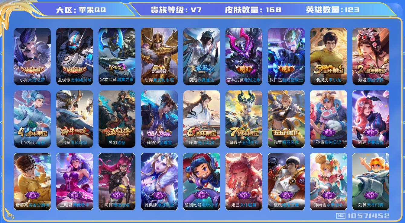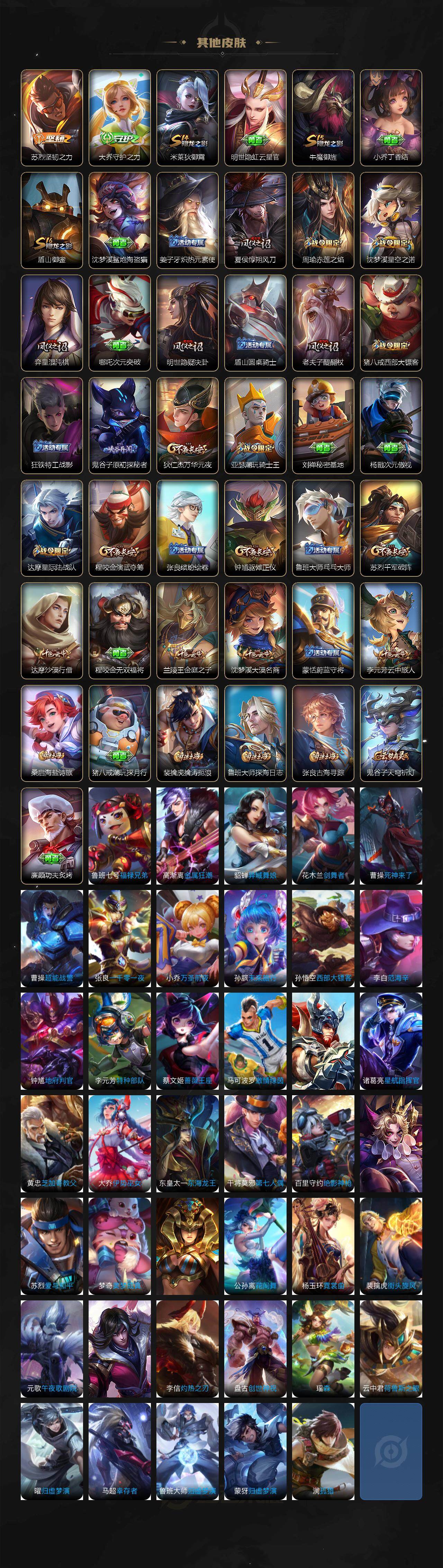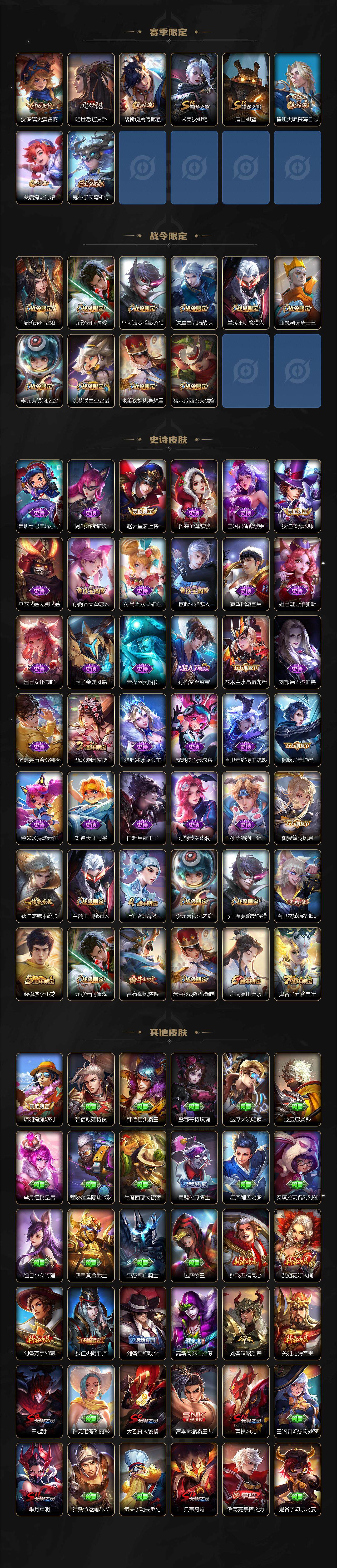 [10571452]v7-123英雄-168皮肤-2典藏-5传说-42史诗,cc8273 【荣耀典藏】:夏侯惇无限飓风号,小乔天鹅之梦 【内测皮肤】:孙尚香蔷薇恋人,嬴政优雅恋人,狂铁特工战影 【传说皮肤】:狄仁杰超时空战士,宫本武藏地狱之眼,后羿黄金射手座,虞姬云霓雀翎,关羽武圣 【限定皮肤】:白起狰,狄仁杰阴阳师,赵云皇家上将,嬴政优雅恋人,孙尚香蔷薇恋人,庄周高山流水,高渐离死亡摇滚,芈月重明,吕布御风骁将,周瑜赤莲之焰,元歌云间偶戏,夏侯惇朔风刀,甄姬游园惊梦,曹操烛龙,典韦穷奇,马可波罗暗影游猎,狄仁杰魔术师,狄仁杰万华元夜,达摩星际陆战队,达摩沙漠行僧,项羽海滩派对,老夫子醍醐杖,关羽武圣,程咬金演武夺筹,兰陵王驯魔猎人,兰陵王金庭之子,亚瑟潮玩骑士王,孙悟空至尊宝,牛魔御旌,李元芳银河之约,李元芳云中旅人,钟馗驱傩正仪,太乙真人饕餮,鬼谷子原初探秘者,鬼谷子五谷丰年,苏烈千军破阵,百里玄策原初追逐者,弈星混沌棋,沈梦溪星空之诺,沈梦溪大漠名商,明世隐疑决卦,裴擒虎李小龙,裴擒虎擒涛扼浪,米莱狄御霄,米莱狄胡桃异想国,盾山御銮,猪八戒西部大镖客,上官婉儿梁祝,鲁班大师探海日志,桑启海盐诗旅,张良古海寻踪,鬼谷子天穹祈灯 【年限皮肤】:吕布御风骁将,关羽武圣 【赛季限定】:白起狰,芈月重明,夏侯惇朔风刀,曹操烛龙,典韦穷奇,狄仁杰万华元夜,达摩沙漠行僧,老夫子醍醐杖,程咬金演武夺筹,兰陵王金庭之子,张良古海寻踪,牛魔御旌,李元芳云中旅人,钟馗驱傩正仪,太乙真人饕餮,鬼谷子原初探秘者,苏烈千军破阵,百里玄策原初追逐者,弈星混沌棋,沈梦溪大漠名商,明世隐疑决卦,裴擒虎擒涛扼浪,米莱狄御霄,盾山御銮,鲁班大师探海日志,桑启海盐诗旅,鬼谷子天穹祈灯 【战令限定】:周瑜赤莲之焰,元歌云间偶戏,马可波罗暗影游猎,达摩星际陆战队,兰陵王驯魔猎人,亚瑟潮玩骑士王,李元芳银河之约,沈梦溪星空之诺,米莱狄胡桃异想国,猪八戒西部大镖客 【史诗皮肤】:鲁班七号电玩小子,阿轲暗夜猫娘,赵云皇家上将,貂蝉圣诞恋歌,王昭君偶像歌手,狄仁杰魔术师,宫本武藏鬼剑武藏,孙尚香蔷薇恋人,孙尚香水果甜心,嬴政优雅恋人,嬴政摇滚巨星,妲己魅力维加斯,妲己女仆咖啡,墨子金属风暴,曹操幽灵船长,孙悟空至尊宝,花木兰水晶猎龙者,刘邦德古拉伯爵,诸葛亮黄金分割率,甄姬游园惊梦,雅典娜冰冠公主,安琪拉心灵骇客,百里守约特工魅