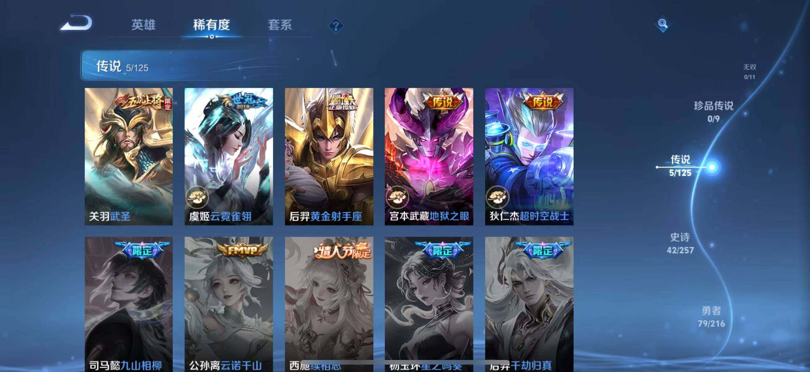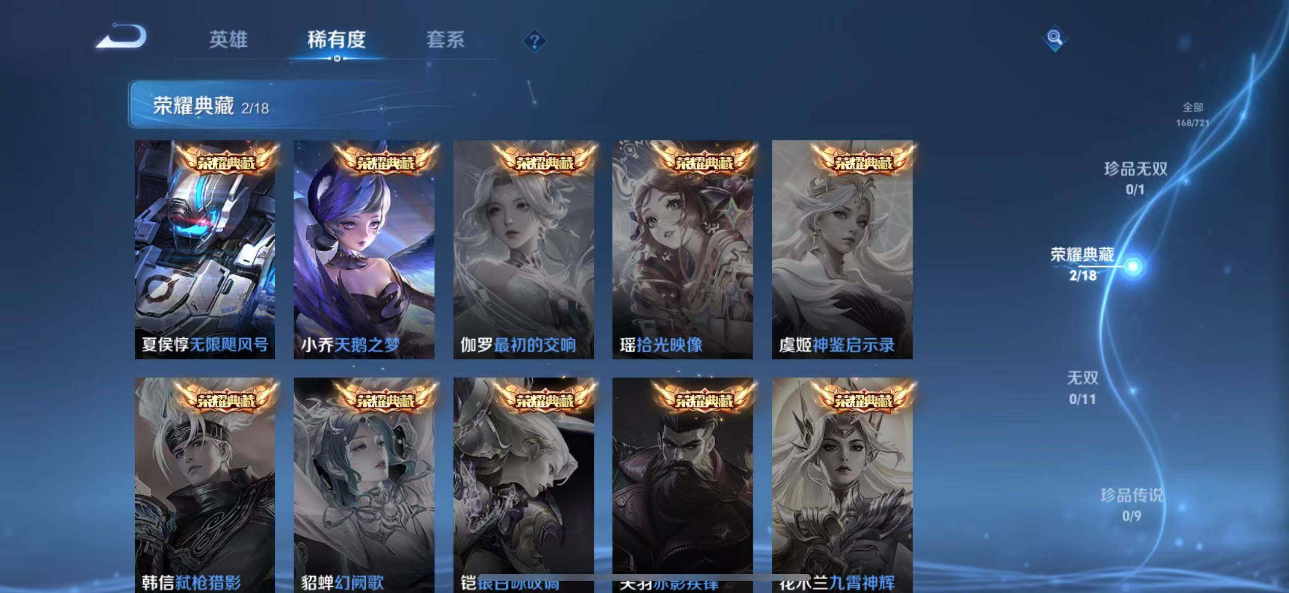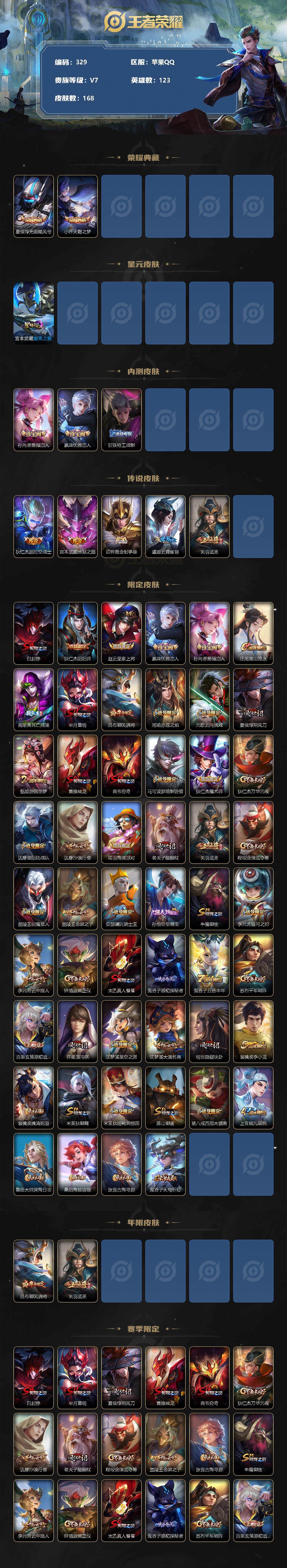 [10571452]v7-123英雄-168皮肤-2典藏-5传说-42史诗,cc8273 【荣耀典藏】:夏侯惇无限飓风号,小乔天鹅之梦 【内测皮肤】:孙尚香蔷薇恋人,嬴政优雅恋人,狂铁特工战影 【传说皮肤】:狄仁杰超时空战士,宫本武藏地狱之眼,后羿黄金射手座,虞姬云霓雀翎,关羽武圣 【限定皮肤】:白起狰,狄仁杰阴阳师,赵云皇家上将,嬴政优雅恋人,孙尚香蔷薇恋人,庄周高山流水,高渐离死亡摇滚,芈月重明,吕布御风骁将,周瑜赤莲之焰,元歌云间偶戏,夏侯惇朔风刀,甄姬游园惊梦,曹操烛龙,典韦穷奇,马可波罗暗影游猎,狄仁杰魔术师,狄仁杰万华元夜,达摩星际陆战队,达摩沙漠行僧,项羽海滩派对,老夫子醍醐杖,关羽武圣,程咬金演武夺筹,兰陵王驯魔猎人,兰陵王金庭之子,亚瑟潮玩骑士王,孙悟空至尊宝,牛魔御旌,李元芳银河之约,李元芳云中旅人,钟馗驱傩正仪,太乙真人饕餮,鬼谷子原初探秘者,鬼谷子五谷丰年,苏烈千军破阵,百里玄策原初追逐者,弈星混沌棋,沈梦溪星空之诺,沈梦溪大漠名商,明世隐疑决卦,裴擒虎李小龙,裴擒虎擒涛扼浪,米莱狄御霄,米莱狄胡桃异想国,盾山御銮,猪八戒西部大镖客,上官婉儿梁祝,鲁班大师探海日志,桑启海盐诗旅,张良古海寻踪,鬼谷子天穹祈灯 【年限皮肤】:吕布御风骁将,关羽武圣 【赛季限定】:白起狰,芈月重明,夏侯惇朔风刀,曹操烛龙,典韦穷奇,狄仁杰万华元夜,达摩沙漠行僧,老夫子醍醐杖,程咬金演武夺筹,兰陵王金庭之子,张良古海寻踪,牛魔御旌,李元芳云中旅人,钟馗驱傩正仪,太乙真人饕餮,鬼谷子原初探秘者,苏烈千军破阵,百里玄策原初追逐者,弈星混沌棋,沈梦溪大漠名商,明世隐疑决卦,裴擒虎擒涛扼浪,米莱狄御霄,盾山御銮,鲁班大师探海日志,桑启海盐诗旅,鬼谷子天穹祈灯 【战令限定】:周瑜赤莲之焰,元歌云间偶戏,马可波罗暗影游猎,达摩星际陆战队,兰陵王驯魔猎人,亚瑟潮玩骑士王,李元芳银河之约,沈梦溪星空之诺,米莱狄胡桃异想国,猪八戒西部大镖客 【史诗皮肤】:鲁班七号电玩小子,阿轲暗夜猫娘,赵云皇家上将,貂蝉圣诞恋歌,王昭君偶像歌手,狄仁杰魔术师,宫本武藏鬼剑武藏,孙尚香蔷薇恋人,孙尚香水果甜心,嬴政优雅恋人,嬴政摇滚巨星,妲己魅力维加斯,妲己女仆咖啡,墨子金属风暴,曹操幽灵船长,孙悟空至尊宝,花木兰水晶猎龙者,刘邦德古拉伯爵,诸葛亮黄金分割率,甄姬游园惊梦,雅典娜冰冠公主,安琪拉心灵骇客,百里守约特工魅