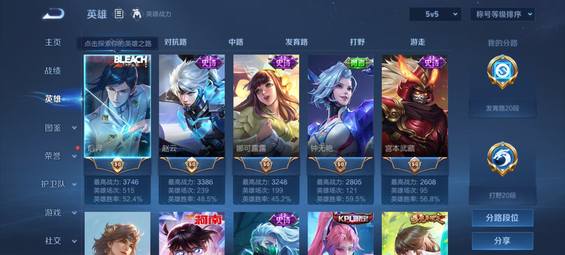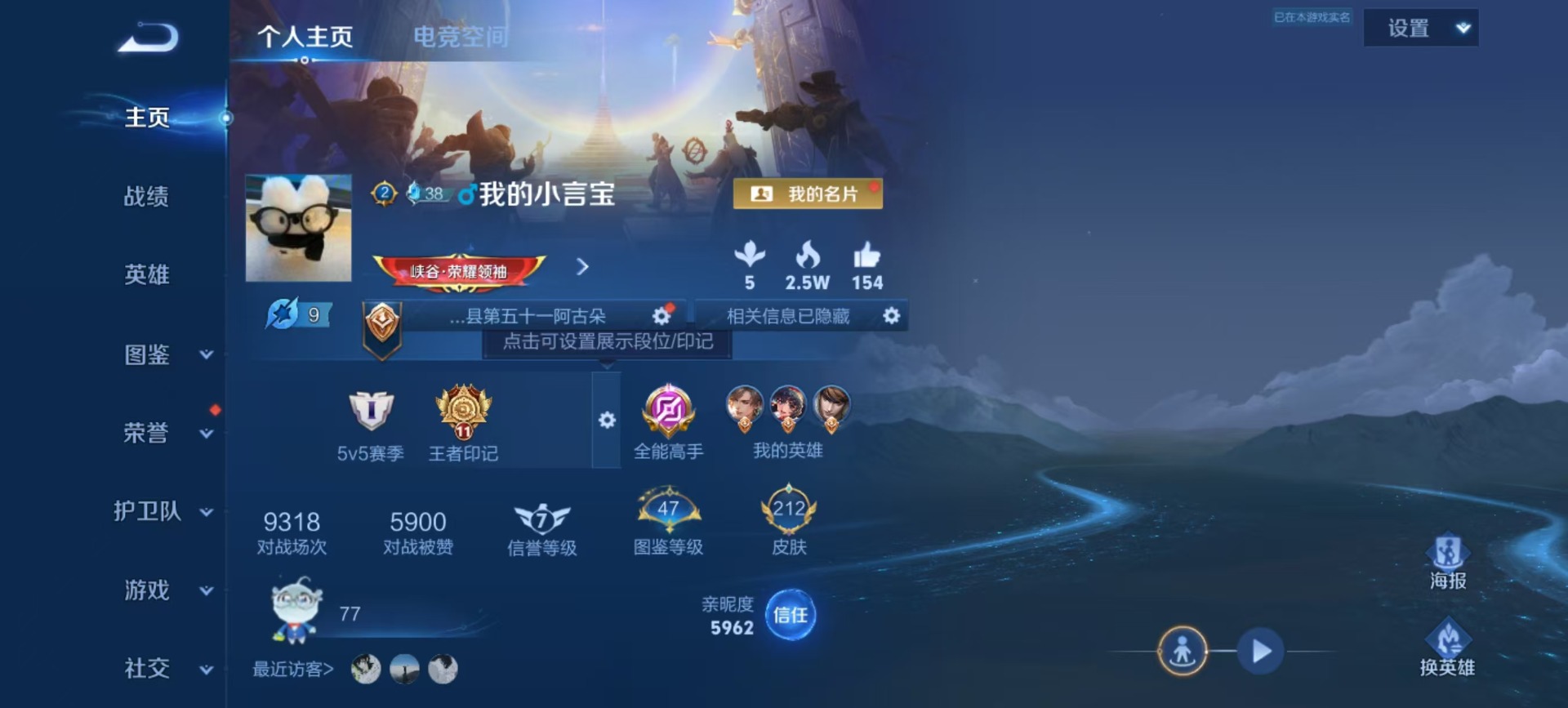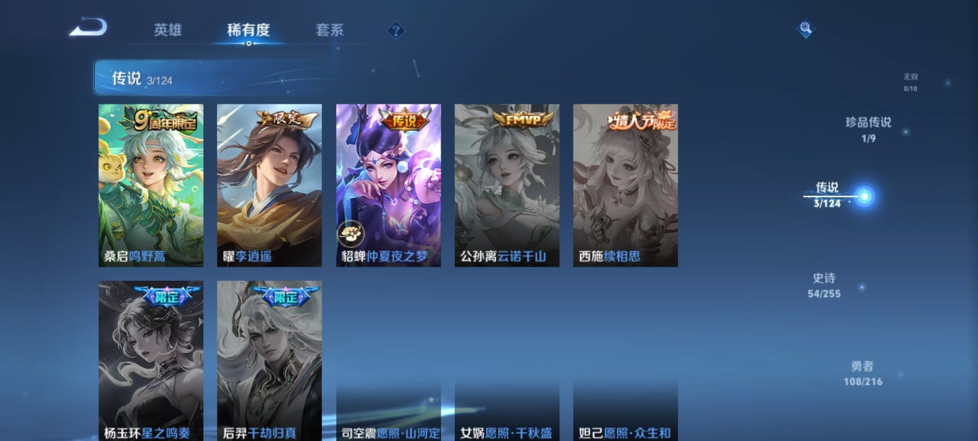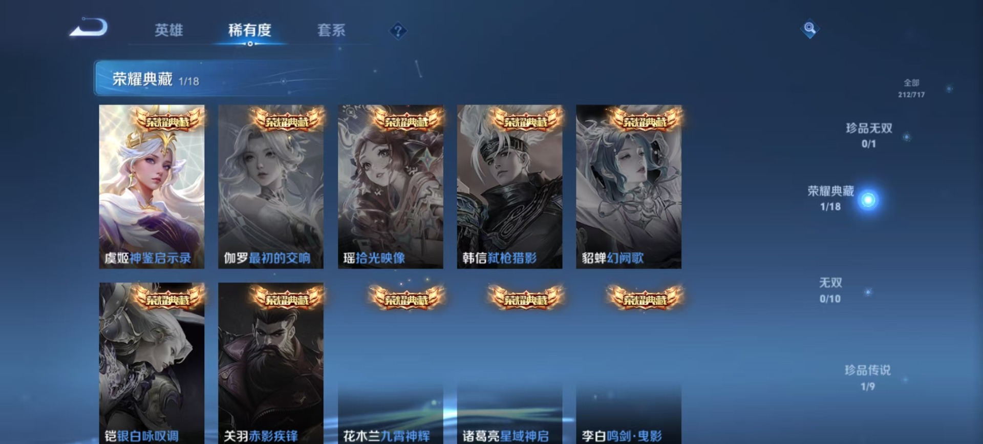 v5 1典藏 1珍品传说 3传说 124英雄 212皮肤 可修改实名 荣耀水晶:神鉴启示录 珍品传说:江户川柯南 传说皮:李仲夏夜之梦大飞蛾 珍宝阁皮:妄想食味胡桃夹子蔷薇恋人玩趣恶龙 限定皮:鸣野蒿遇见飞天高山流水五谷丰年梁祝天狼溯光者李小龙猪悟能山海·玄木吟马可