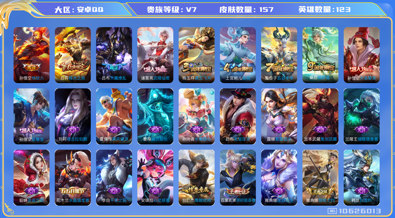 [10626013]v7 4传说 123英雄 157皮肤 可修改实名 传说皮:地狱火 珍宝阁皮:女武神 限定皮:鸣野蒿至尊宝武陵仙君小桃花遇见飞天五谷丰年梁祝辉光之辰大圣娶亲天魔缭乱 史诗皮:紫霞仙子白龙吟千年之狐冰冠公主偶像歌手龙骑士小龙虾水果甜心心灵骇客德古拉伯爵暗隐猎兽者幽灵船长鬼剑武藏繁星吟游呼啦呼啦乘风破浪水晶猎龙者金属风暴原初追逐者圣诞狂欢圣诞恋歌鹰眼统帅魅力维加斯黎明之约