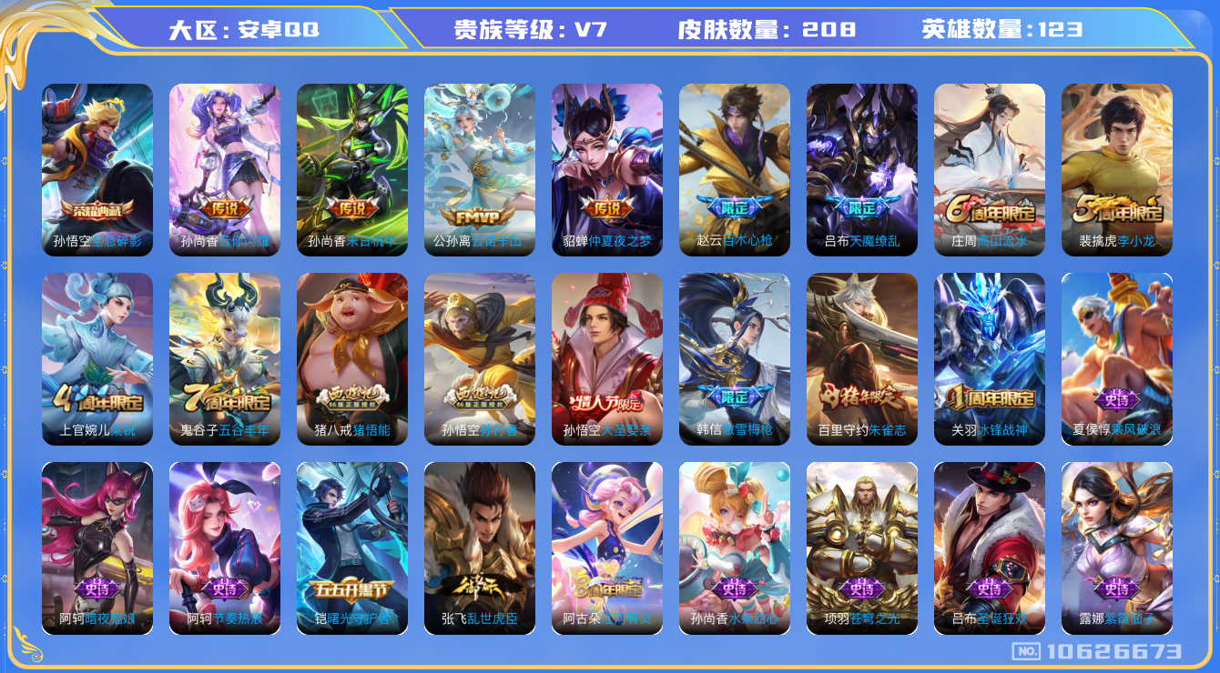 [10626673]v7 1典藏 5传说 123英雄 208皮肤 可修改实名 荣耀水晶:全息碎影猴子典藏 传说皮:云诺千山仲夏夜之梦大飞蛾末日机甲-孙尚香绿蚂蚱音你闪耀rap皮 珍宝阁皮:优雅恋人女武神 限定皮:傲雪梅呛高山流水五谷丰年冰锋战神梁祝李小龙朱雀志守约年限孙行者猪悟能大圣娶亲天魔缭乱百木心呛 史诗皮:龙之律动紫霞仙子苍穹之光黄金分割率千年之狐江河有灵百解令蒙犽冰冠公主电玩·爆裂旋风暗夜猫娘龙骑士小龙虾乱世虎臣节奏热浪女仆咖啡摇滚巨星水果甜心绅士熊喵星夜王子心灵骇客功夫厨神暗隐猎兽者鬼剑武藏心灵战警纤云弄巧繁星吟游呼啦呼啦拒霜思乘风破浪逐浪之夏水晶猎龙者曙光守护者金属风暴圣诞狂欢圣诞恋歌鹰眼统帅