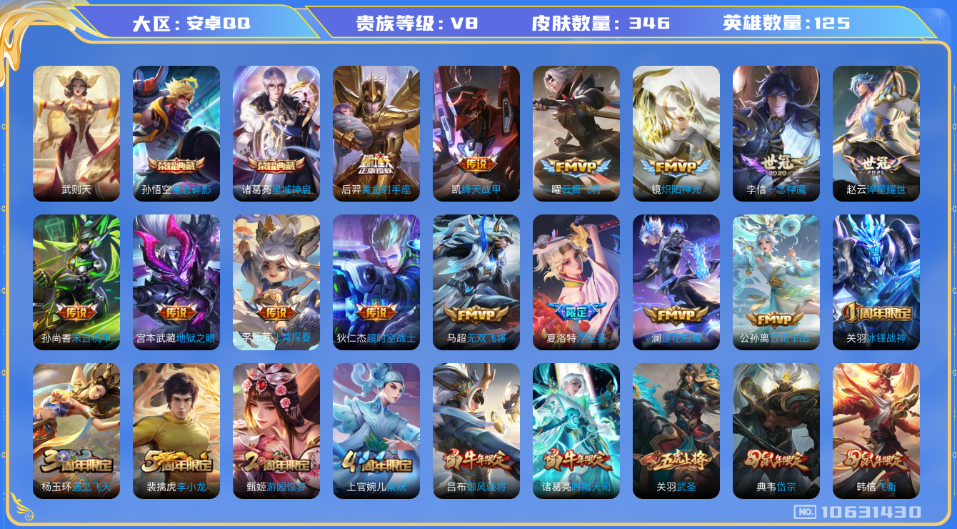 [10631430]贵族v8 荣耀典藏3 传说皮肤22 史诗皮肤102 皮肤数量346 皮肤价值:273136 英雄125 至尊星耀v