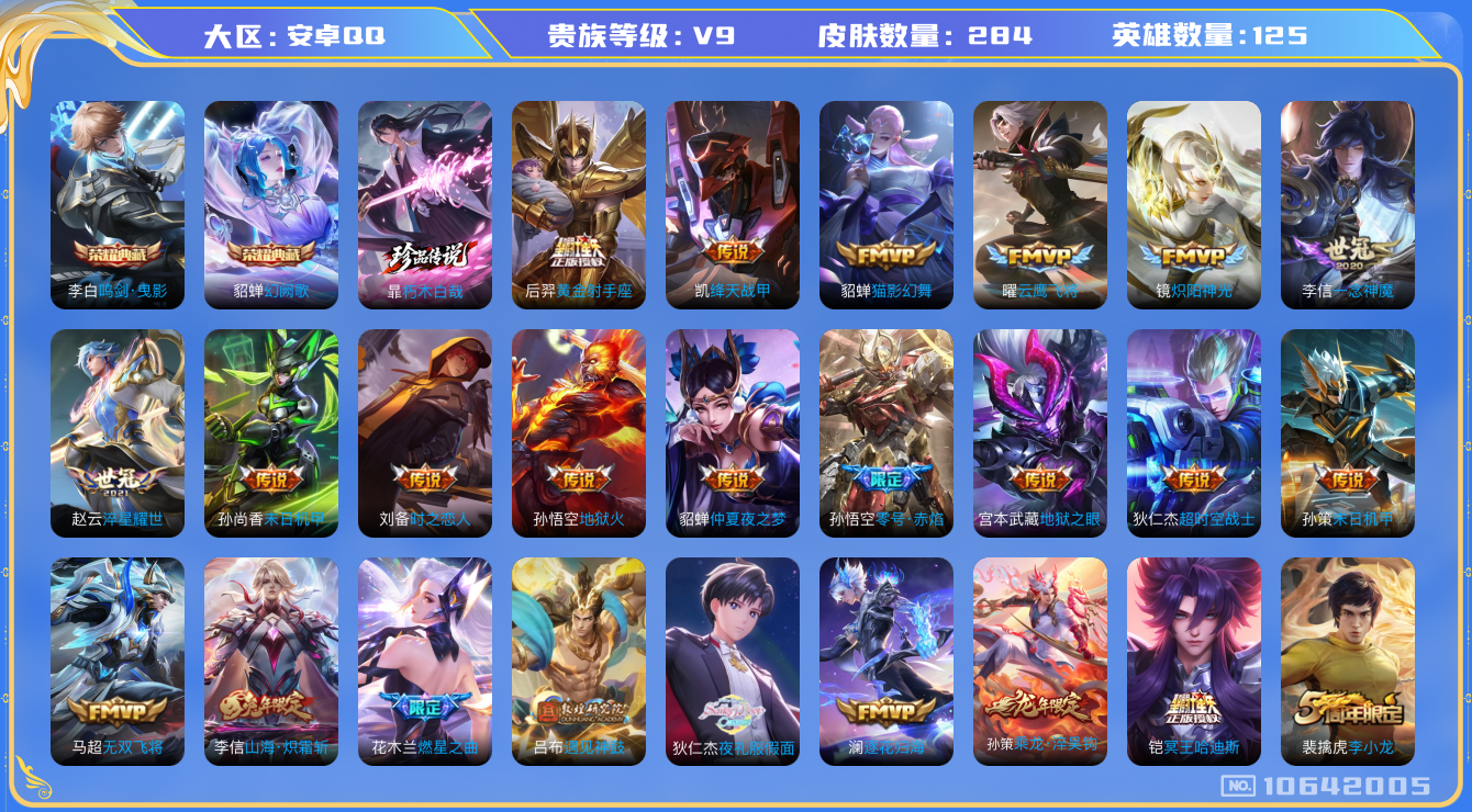 [10642005]【商品标题】:安卓q-v9-最强王者段位-125英雄-284皮肤-2典藏-0珍品无双-0无双-1珍品传说-30传说-88史诗 【荣耀典藏】:李白鸣剑曳影,貂蝉幻阙歌 【珍品传说】:暃朽木白哉 【内测皮肤】:孙尚香蔷薇恋人,狂铁特工战影 【传说皮肤】:狄仁杰超时空战士,孙悟空地狱火,宫本武藏地狱之眼,孙尚香末日机甲,貂蝉仲夏夜之梦,后羿黄金射手座,貂蝉猫影幻舞,刘备时之恋人,李信一念神魔,曜云鹰飞将,孙悟空零号赤焰,虞姬启明星使,镜炽阳神光,铠绛天战甲,赵云淬星耀世,孙策末日机甲,马超无双飞将,马可波罗深海之息,李白诗剑行,吕布怒海麟威,李信山海炽霜斩,孙悟空齐天大圣,花木兰燃星之曲,吕布遇见神鼓,兰陵王影龙天霄,狄仁杰夜礼服假面,澜逐花归海,孙策乘龙淬吴钩,铠冥王哈迪斯,桑启鸣野蒿 【限定皮肤】:铠冥王哈迪斯,姜子牙天穹之誓,狄仁杰阴阳师,赵云皇家上将,赵云龙胆,墨子降魔,妲己时之奇旅,孙尚香蔷薇恋人,钟无艳超时空战士,芈月幻夜卜梦,吕布遇见神鼓,元歌无心,甄姬落雪兰心,典韦岱宗,马可波罗深海之息,马可波罗山海玄木吟,狄仁杰魔术师,项羽海滩派对,貂蝉逐梦之音,韩信飞衡,韩信傲雪梅呛,兰陵王影龙天霄,花木兰燃星之曲,孙悟空零号赤焰,孙悟空孙行者,孙悟空齐天大圣,李元芳匿光侦查者,李元芳云中旅人,虞姬启明星使,蔡文姬繁星吟游,鬼谷子五谷丰年,裴擒虎李小龙,云中君纤云弄巧,李信山海炽霜斩,上官婉儿神器万象笔,嫦娥拒霜思,嫦娥暖冬兔眠,西施玲珑珍味,鲁班大师探海日志,桑启海盐诗旅,暃星界游侠,戈娅驭风魔法,艾琳流音漫舞,赵怀真鹤归松栖,司空震地狱燃心,阿古朵江河有灵,张良古海寻踪,狄仁杰夜礼服假面,蒙犽百解令,高渐离燃音魔法,妲己灵卜魔法,鬼谷子天穹祈灯,孙策乘龙淬吴钩,沈梦溪龙舞盛年,李元芳蔬乡物语,刘邦剑破天穹,程咬金群星魔术团,关羽决胜骁骑,镜青焰无极,项羽苍威无极,刘备异域游侠,周瑜熔金海岸 【年限皮肤】:韩信飞衡,典韦岱宗,赵云龙胆,马可波罗山海玄木吟,李信山海炽霜斩,孙策乘龙淬吴钩 【赛季限定】:张良古海寻踪,李元芳云中旅人,鲁班大师探海日志,桑启海盐诗旅,鬼谷子天穹祈灯,刘邦剑破天穹,姜子牙天穹之誓 【战令限定】:钟无艳超时空战士,芈月幻夜卜梦,甄姬落雪兰心,艾琳流音漫舞,嫦娥暖冬兔眠,西施玲珑珍味,司空震地狱燃心,暃星界游侠,戈娅驭风魔法,高渐离燃音魔法,