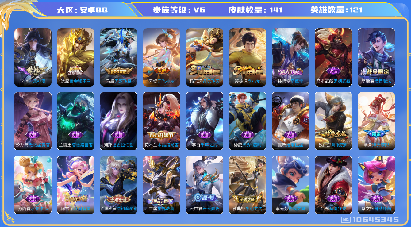 [10645345]v6 4传说 121英雄 141皮肤 可修改实名 传说皮:幻光神呛黄金狮子座一念神魔无双飞将 珍宝阁皮:蔷薇恋人 限定皮:至尊宝遇见飞天李小龙 史诗皮:星界战将芈月浮光幕影千年之狐江河有灵高渐离燃音魔法蒙恬荣光圣徽偶像歌手无限星赏官修罗摇滚巨星水果甜心德古拉伯爵暗隐猎兽者鬼剑武藏天秀·启明舞动绿茵纤云弄巧逐浪之夏水晶猎龙者原初追逐者圣诞狂欢鹰眼统帅魅力维加斯黎明之约