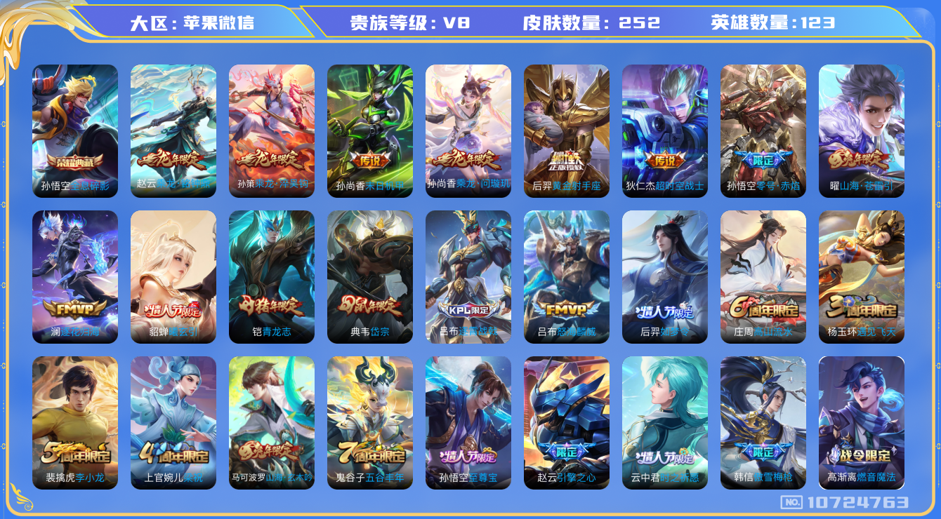 [10724763]v8 1典藏 12传说 123英雄 252皮肤 可修改实名 荣耀水晶:全息碎影猴子典藏 传说皮:乘龙·问璇玑孙尚香年限乘龙·铭钟鼎赵云年限乘龙·淬吴钩孙策年限貂蝉曦玄引黄金射手座零号·赤焰末日机甲-孙尚香绿蚂蚱超时空战士-狄仁杰山海·苍雷引电光曜子澜逐花归海 珍宝阁皮:蔷薇恋人玩趣恶龙 限定皮:逐霄战戟至尊宝傲雪梅呛遇见飞天高山流水怒海麟威五谷丰年青龙志铠年限梁祝岱宗典韦年限李小龙如梦令-后羿引擎之心时之祈愿-云中君山海·玄木吟马可年限 史诗皮:星界战将龙之律动藏狐·褐绒蔬乡物语鲁班七号乘龙·聚宝船安琪拉年限乘龙·忆丹青大乔年限化蝶舞紫霞仙子黄金分割率特工魅影真我赫兹百里守约真我赫兹镜江河有灵高渐离燃音魔法蒙恬荣光圣徽冰冠公主青蛇偶像歌手晚萤电玩·爆裂旋风时之恋人-孙尚香乱世虎臣节奏热浪修罗女仆咖啡水果甜心绅士熊喵天才门将星夜王子心灵骇客功夫厨神暗隐猎兽者鬼剑武藏心灵战警舞动绿茵地狱岩魂纤云弄巧繁星吟游呼啦呼啦拒霜思乘风破浪逐浪之夏水晶猎龙者金属风暴原初追逐者圣诞恋歌鹰眼统帅暗夜贵公子魅力维加斯黎明之约赏金猎手无心未来纪元-赵云