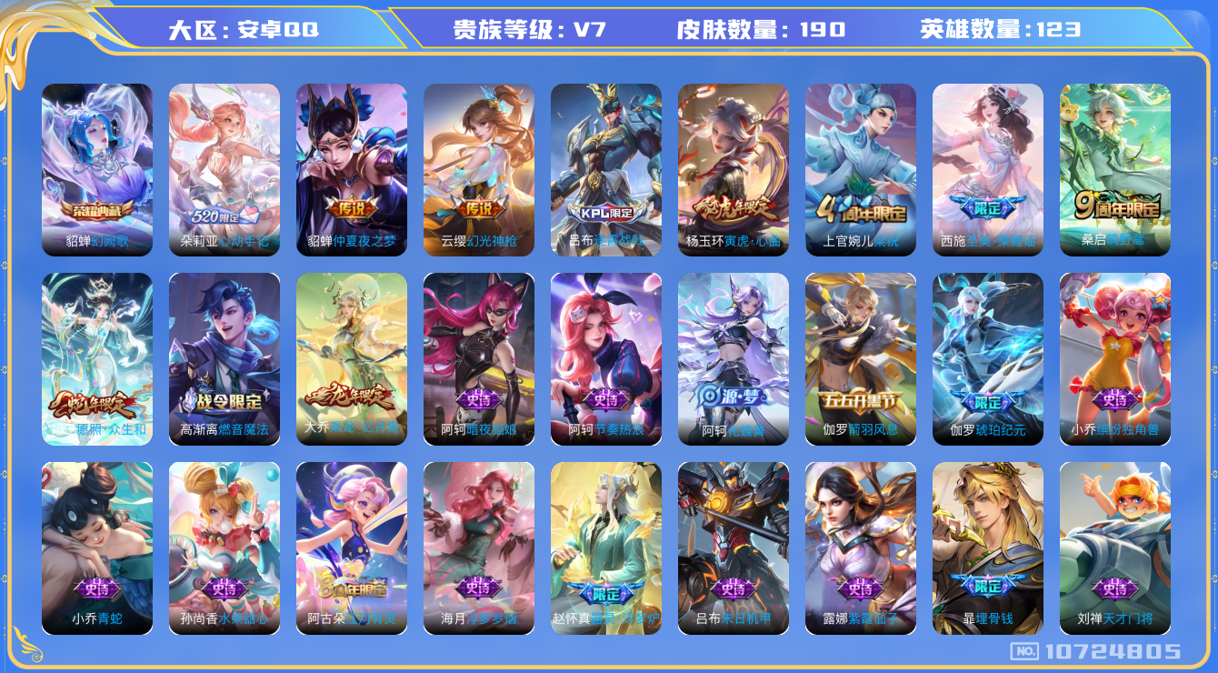 [10724805]v7 1典藏 5传说 123英雄 190皮肤 可修改实名 荣耀水晶:幻阙歌貂蝉典藏 传说皮:幻光神呛朵莉亚心动手记仲夏夜之梦大飞蛾 珍宝阁皮:蔷薇恋人 限定皮:愿照·众生和妲己年限逐霄战戟鸣野蒿至美·乘鲤谣梁祝寅虎·心曲虎婆 史诗皮:瑰影绮梦器灵·浮梦炉龙之律动蒙犽顽岩魄埋骨钱芈月浮光幕影乘龙·聚宝船安琪拉年限乘龙·忆丹青大乔年限琥珀纪元伽罗化蝶舞遇见神鹿紫霞仙子特工魅影浮梦罗烟江河有灵高渐离燃音魔法百解令蒙犽青蛇偶像歌手晚萤暗夜猫娘末日机甲-吕布节奏热浪女仆咖啡水果甜心天才门将心灵骇客鬼剑武藏舞动绿茵纤云弄巧拒霜思缤纷独角兽水晶猎龙者箭羽风息金属风暴圣诞恋歌鹰眼统帅魅力维加斯未来纪元-赵云