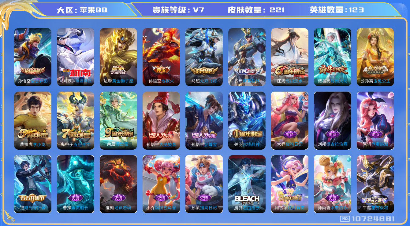[10724881]v7 1典藏 1珍品传说 5传说 123英雄 221皮肤 可修改实名 刘禅小国标 牛魔小国标 荣耀水晶:全息碎影猴子典藏 珍品传说:怪盗基德 传说皮:黄金狮子座地狱火无双飞将 珍宝阁皮:蔷薇恋人 限定皮:逐霄战戟鸣野蒿至尊宝时雨天司水龙头高山流水五谷丰年冰锋战神李小龙大圣娶亲玉兔公主 史诗皮:星界战将鸭鸭历险记-刘禅石田雨龙破空之剑紫霞仙子白龙吟黄金分割率特工魅影千年之狐永昼江河有灵蒙恬荣光圣徽冰冠公主电玩·爆裂旋风龙骑士小龙虾末日机甲-吕布猫狗日记-孙策猫狗日记-大乔节奏热浪女仆咖啡摇滚巨星水果甜心天才门将星夜王子功夫厨神德古拉伯爵暗隐猎兽者幽灵船长鬼剑武藏心灵战警地狱岩魂缤纷独角兽逐浪之夏水晶猎龙者曙光守护者原初追逐者圣诞狂欢圣诞恋歌鹰眼统帅魅力维加斯黎明之约无心未来纪元-赵云