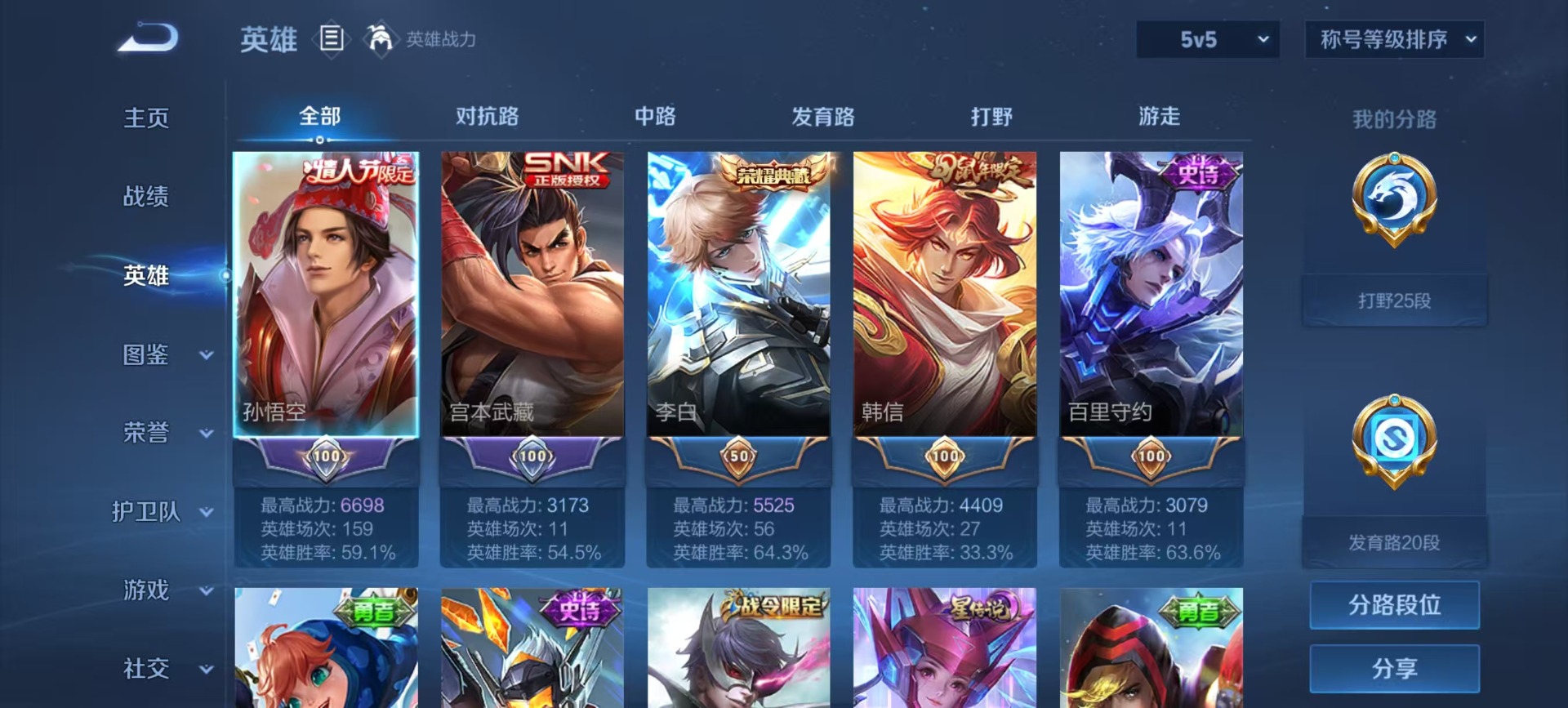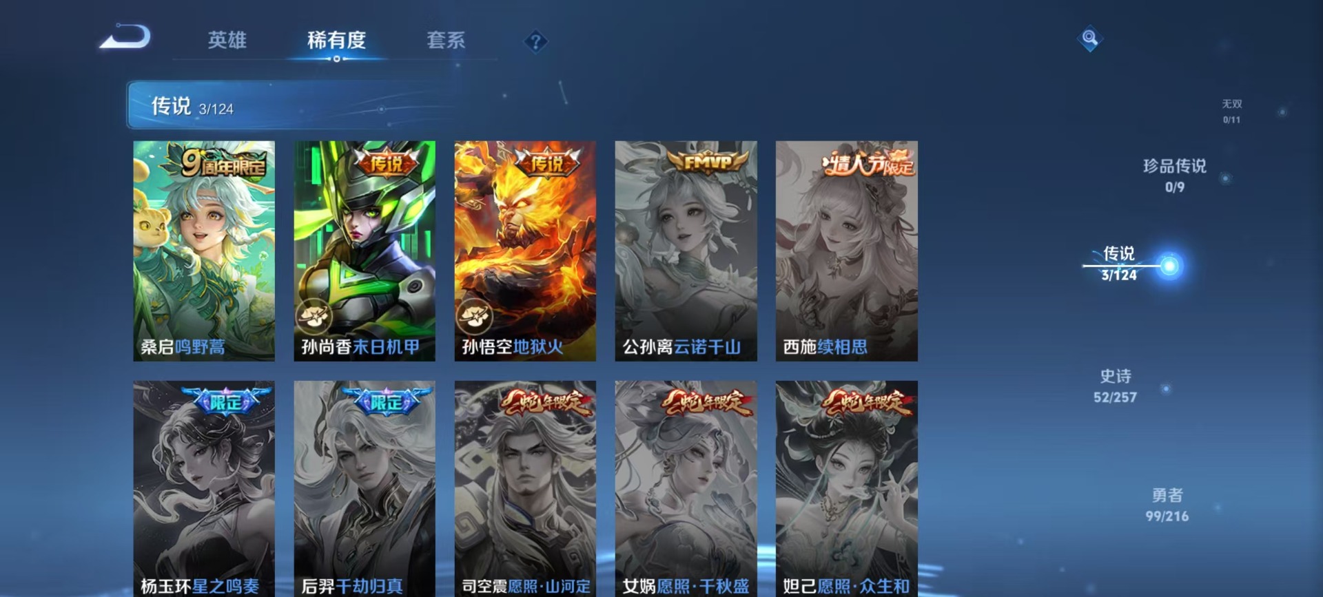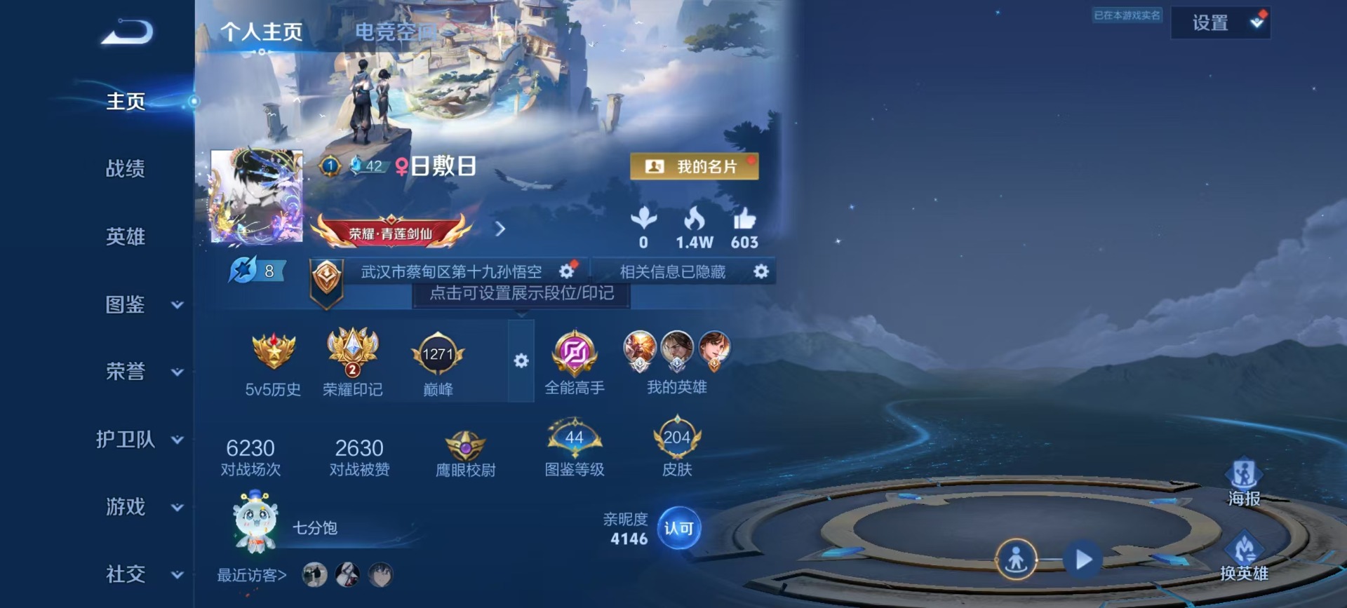 v6 1典藏 3传说 123英雄 204皮肤 可修改实名 荣耀水晶:鸣剑·曳影 传说皮:地狱火末日机甲-孙尚香绿蚂蚱 珍宝阁皮:妄想食味 限定皮:逐霄战戟陌上桑鸣野蒿至尊宝时之彼端飞衡韩信年限天狼运算者梁祝李小龙大圣娶亲 史诗皮:星界战将茶境仙器灵·浮梦炉谪仙醉月