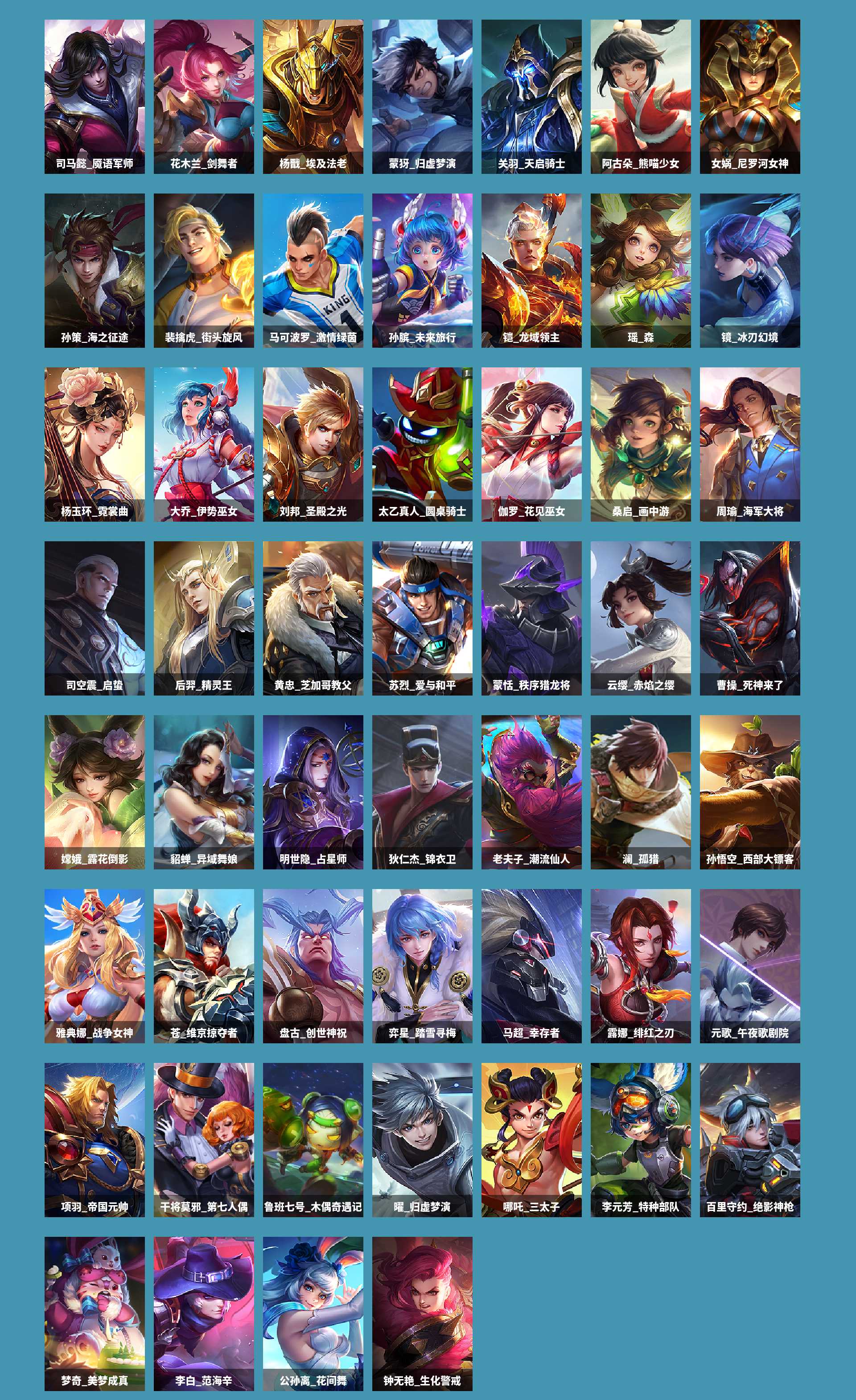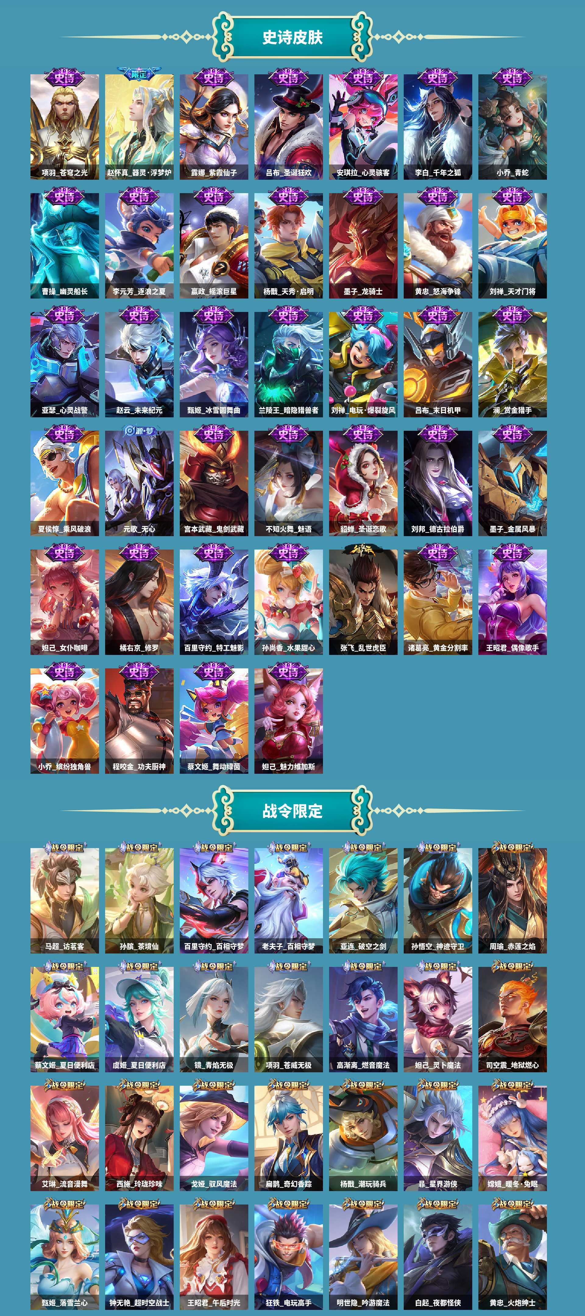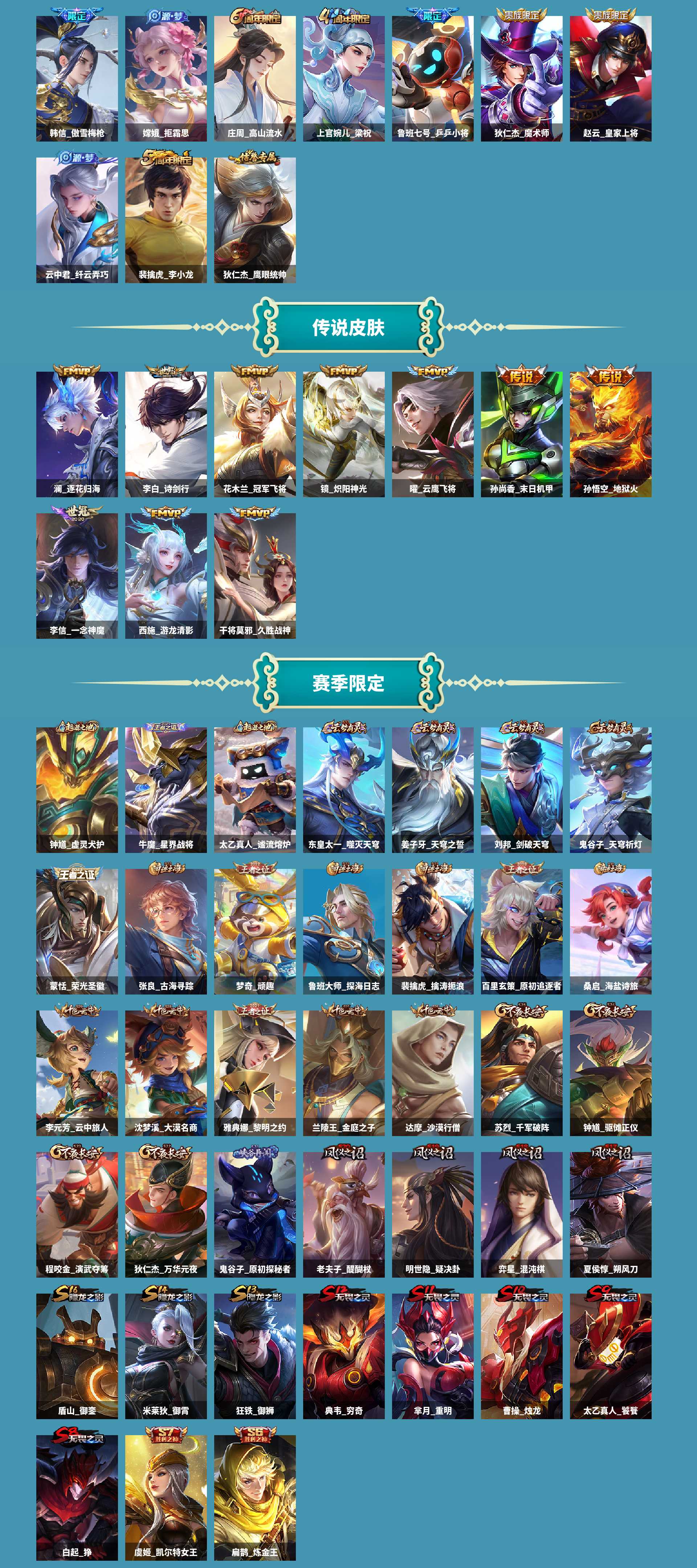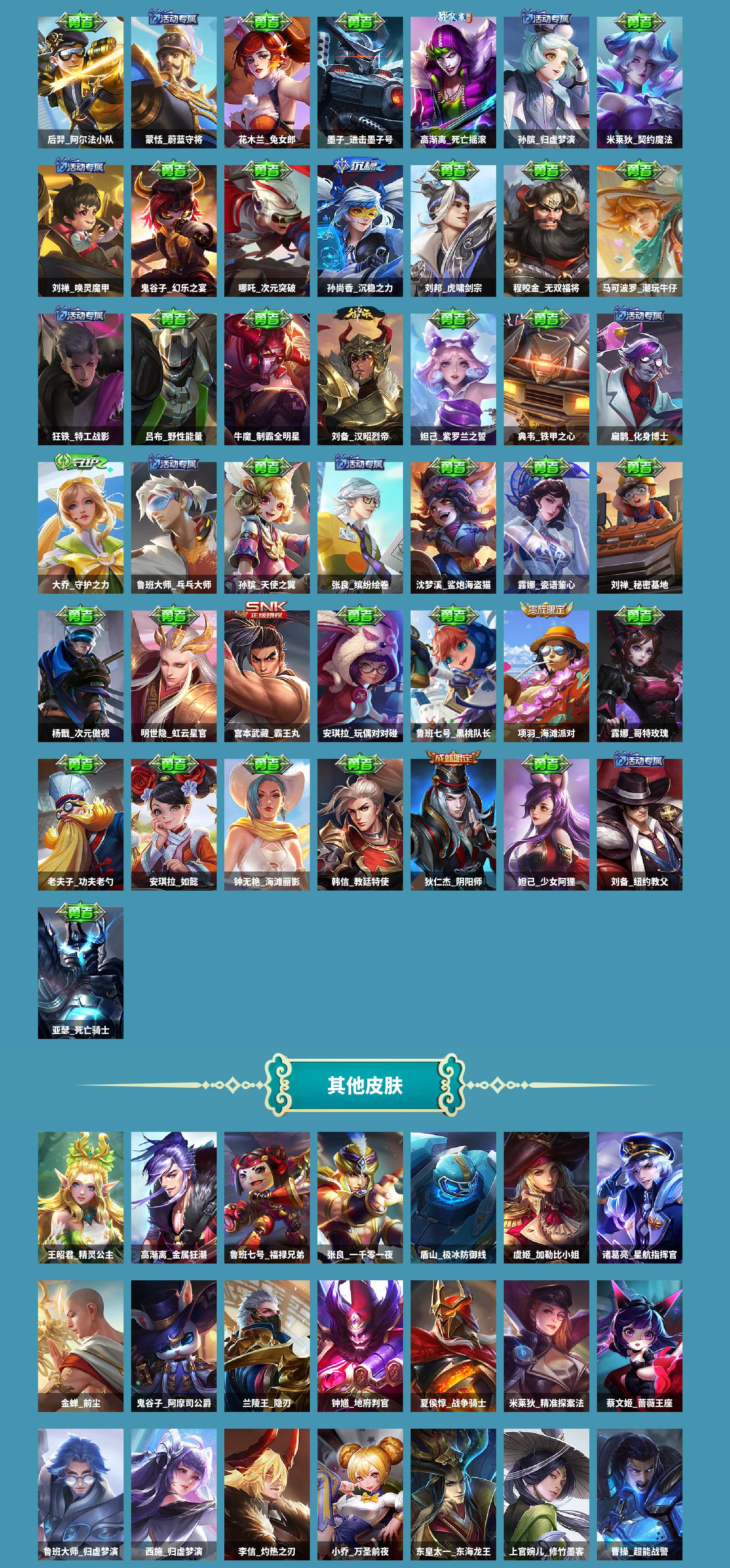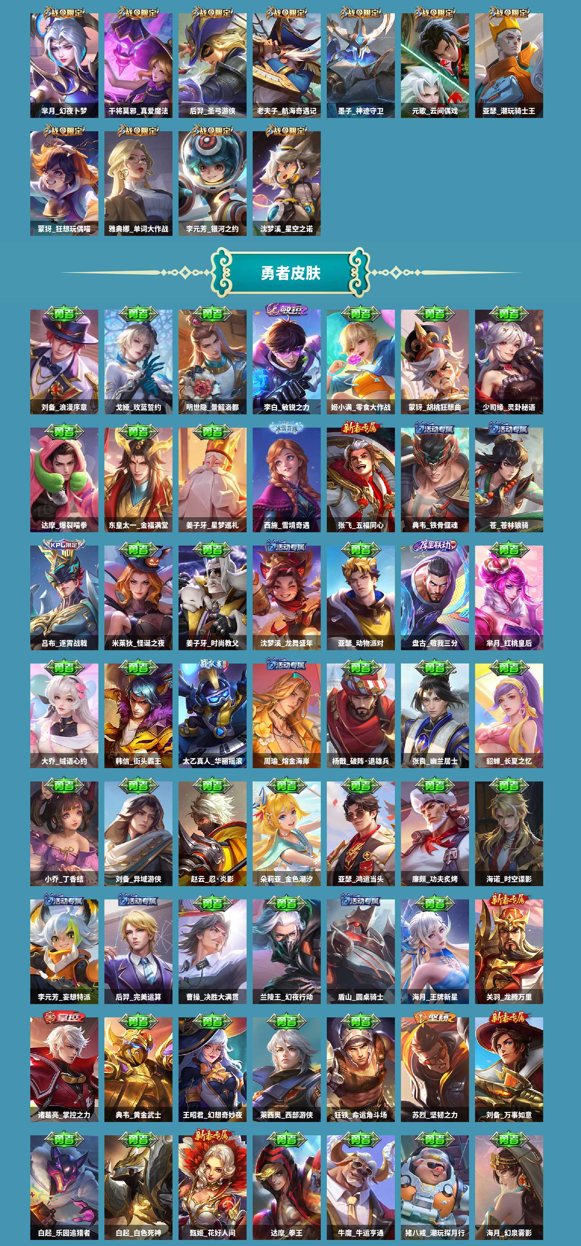 al604297 【特价338皮 12传说 】 皮肤数338 典藏皮肤数1 无双皮肤数0 传说皮肤数17 珍品传说皮数0 史诗皮肤数92 英雄数122 贵族等级【文本】贵族8级 【贵族8级】 荣耀典藏1 内测皮肤3 年限皮肤4 限定皮肤124 赛季限定38 史诗皮肤92 战令限定39 勇者皮肤152 其他皮肤74 荣耀典藏:孙悟空全息碎影; 内测皮肤:姬小满妄想食味,嬴政优雅恋人,艾琳女武神; 年限皮肤:司空震愿照山河定,澜愿照九州拓,马可波罗山海玄木吟,诸葛亮时雨天司; 限定皮肤:钟馗虚灵犬护,阿轲化蝶舞,马超访茗客,孙膑茶境仙,司空震愿照山河定,赵怀真器灵浮梦炉,澜愿照九州拓,牛魔星界战将,太乙真人谧流熔炉,百里守约百相守梦,吕布逐霄战戟,老夫子百相守梦,杨玉环遇见飞天,桑启鸣野蒿,姬小满妄想食味,艾琳陌上桑,沈梦溪龙舞盛年,李白谪仙醉月,东皇太一噬灭天穹,亚连破空之剑,盘古敬我三分,赵云百木心呛,孙悟空神迹守卫,上官婉儿神器万象笔,周瑜赤莲之焰,蒙犽顽岩魄,蔡文姬夏日便利店,姜子牙天穹之誓,虞姬夏日便利店,太乙真人华丽摇滚,安琪拉魔法小厨娘,虞姬启明星使,上官婉儿群星魔术团,镜青焰无极,项羽苍威无极,芈月浮光幕影,刘邦剑破天穹,关羽决胜骁骑,高渐离燃音魔法,伽罗琥珀纪元,妲己灵卜魔法,鬼谷子天穹祈灯,蒙恬荣光圣徽,蒙犽百解令,司空震地狱燃心,艾琳流音漫舞,阿古朵江河有灵,张良古海寻踪,貂蝉逐梦之音,梦奇顽趣,西施玲珑珍味,戈娅驭风魔法,鲁班大师探海日志,扁鹊奇幻香踪,杨戬潮玩骑兵,裴擒虎擒涛扼浪,百里玄策原初追逐者,暃星界游侠,嬴政优雅恋人,孙悟空齐天大圣,马可波罗山海玄木吟,嫦娥暖冬兔眠,桑启海盐诗旅,甄姬落雪兰心,钟无艳超时空战士,元歌无心,鬼谷子五谷丰年,李元芳云中旅人,王昭君午后时光,狂铁电玩高手,沈梦溪大漠名商,高渐离死亡摇滚,明世隐吟游魔法,白起夜都怪侠,雅典娜黎明之约,诸葛亮武陵仙君,兰陵王金庭之子,公孙离玉兔公主,黄忠火炮绅士,韩信傲雪梅呛,芈月幻夜卜梦,达摩沙漠行僧,嫦娥拒霜思,艾琳女武神,庄周高山流水,上官婉儿梁祝,干将莫邪真爱魔法,苏烈千军破阵,后羿圣弓游侠,鲁班七号乒乒小将,老夫子航海奇遇记,墨子神迹守卫,狄仁杰魔术师,钟馗驱傩正仪,程咬金演武夺筹,元歌云间偶戏,亚瑟潮玩骑士王,诸葛亮时雨天司,赵云皇家上将,狄仁杰万华元夜,云中君纤云弄巧,蒙犽狂想玩偶喵,雅典娜单词大作战,裴擒虎李小龙,鬼谷子原初探秘者,老夫子醍醐杖,狄仁杰鹰眼统帅,明世隐疑决卦,李元芳银河之约,项羽海滩派对,沈梦溪星空之诺,弈星混沌棋,夏侯惇朔风刀,盾山御銮,米莱狄御霄,狂铁御狮,典韦穷奇,芈月重明,曹操烛龙,太乙真人饕餮,狄仁杰阴阳师,白起狰,虞姬凯尔特女王,扁鹊炼金王; 赛季限定:钟馗虚灵犬护,牛魔星界战将,太乙真人谧流熔炉,东皇太一噬灭天穹,姜子牙天穹之誓,刘邦剑破天穹,鬼谷子天穹祈灯,蒙恬荣光圣徽,张良古海寻踪,梦奇顽趣,鲁班大师探海日志,裴擒虎擒涛扼浪,百里玄策原初追逐者,桑启海盐诗旅,李元芳云中旅人,沈梦溪大漠名商,雅典娜黎明之约,兰陵王金庭之子,达摩沙漠行僧,苏烈千军破阵,钟馗驱傩正仪,程咬金演武夺筹,狄仁杰万华元夜,鬼谷子原初探秘者,老夫子醍醐杖,明世隐疑决卦,弈星混沌棋,夏侯惇朔风刀,盾山御銮,米莱狄御霄,狂铁御狮,典韦穷奇,芈月重明,曹操烛龙,太乙真人饕餮,白起狰,虞姬凯尔特女王,扁鹊炼金王; 史诗皮肤:阿轲化蝶舞,项羽苍穹之光,孙膑茶境仙,赵怀真器灵浮梦炉,牛魔星界战将,露娜紫霞仙子,吕布圣诞狂欢,百里守约百相守梦,杨玉环遇见飞天