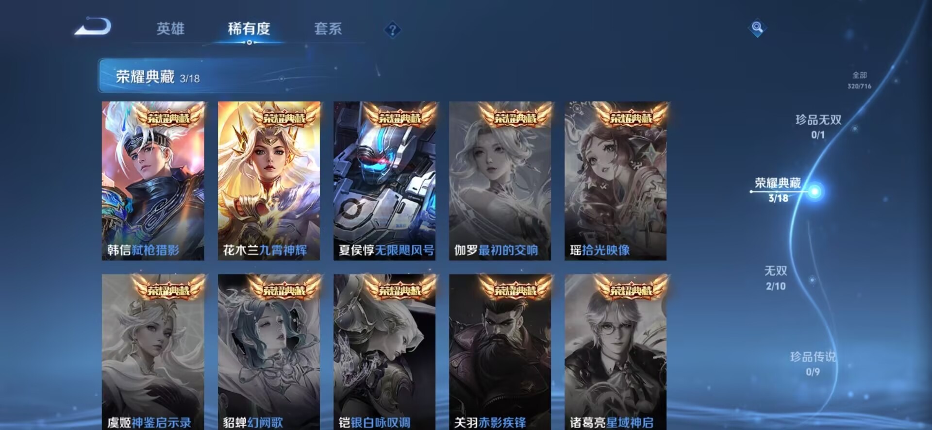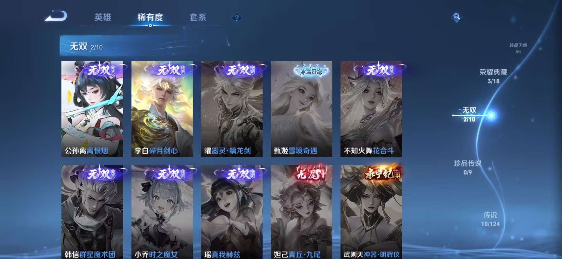 v8 3典藏 2无双 10传说 123英雄 320皮肤 可修改实名 女号 荣耀水晶:九霄神辉木兰典藏弑呛猎影韩信典藏无限飓风号高达 无双皮:离恨烟公孙离无双碎月剑心李白无双 传说皮:幻光神呛仲夏夜之梦大飞蛾地狱之眼一念神魔炽阳神光澜逐花归海 珍宝阁皮:妄想食味