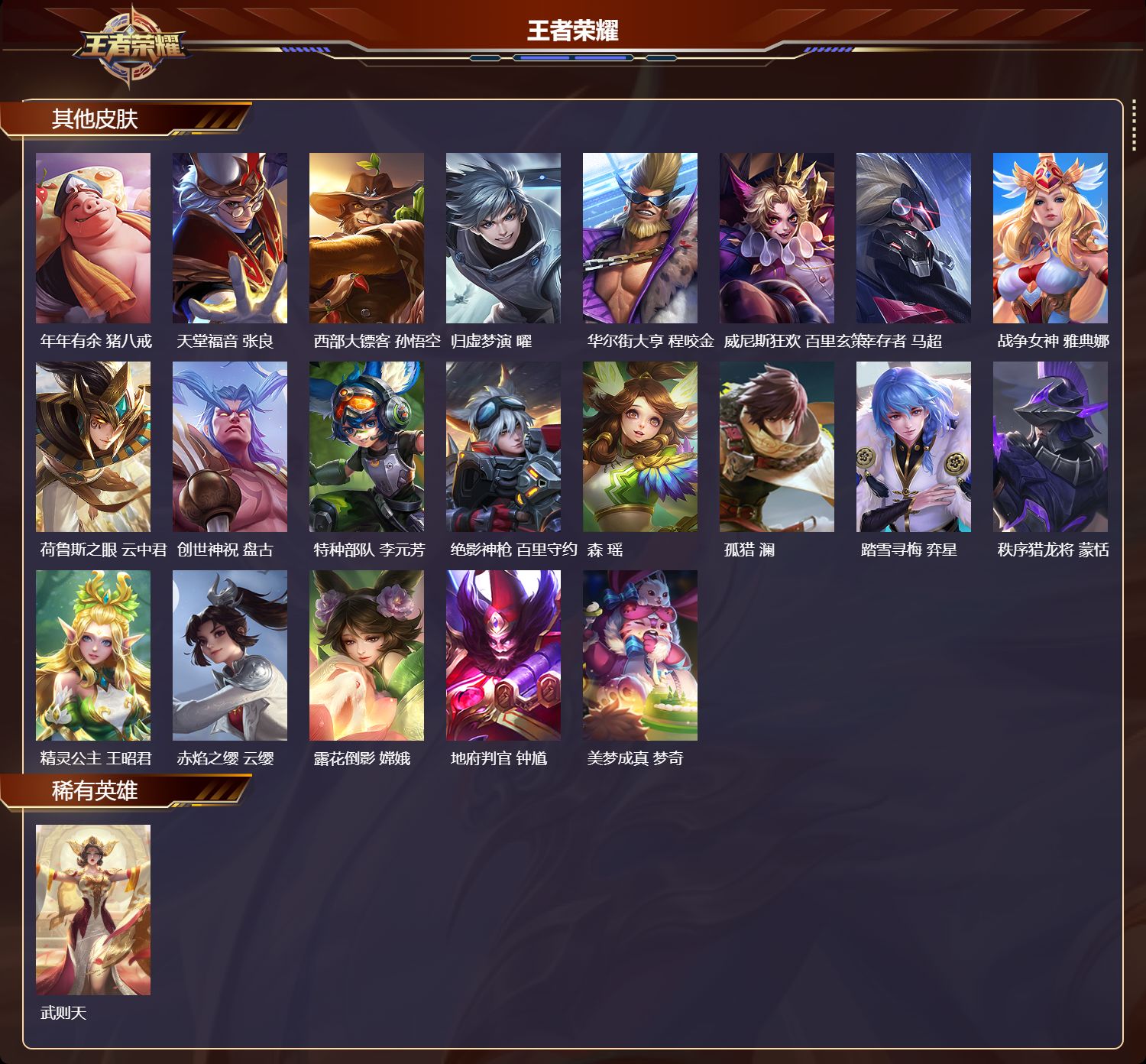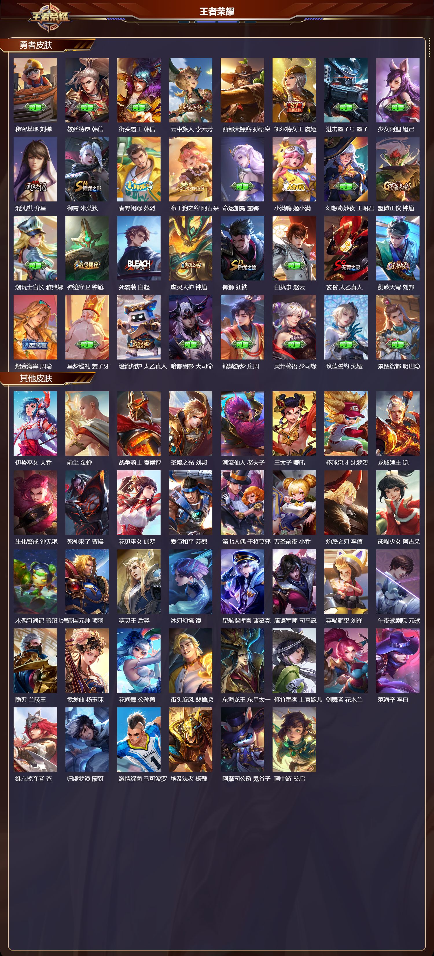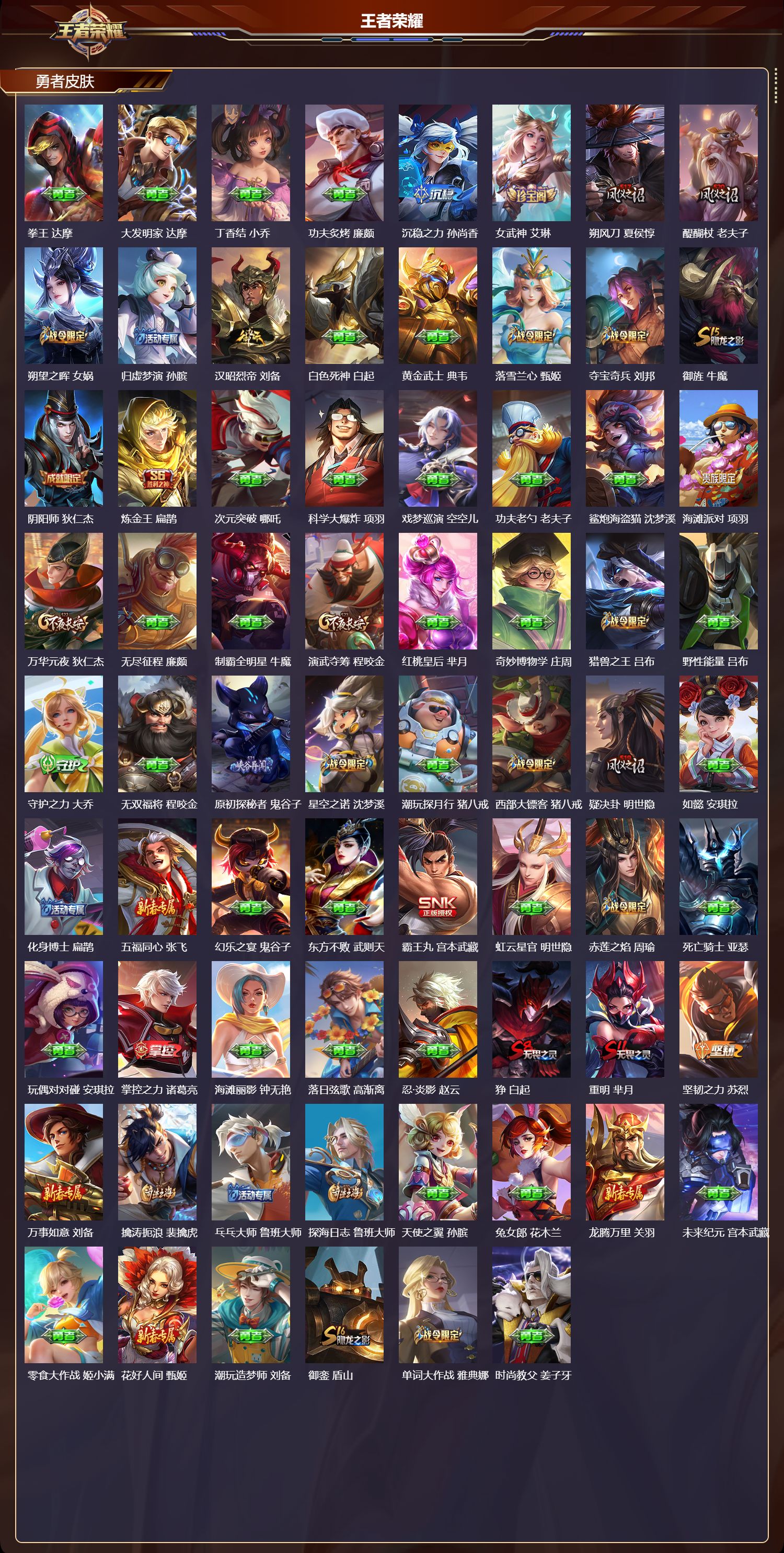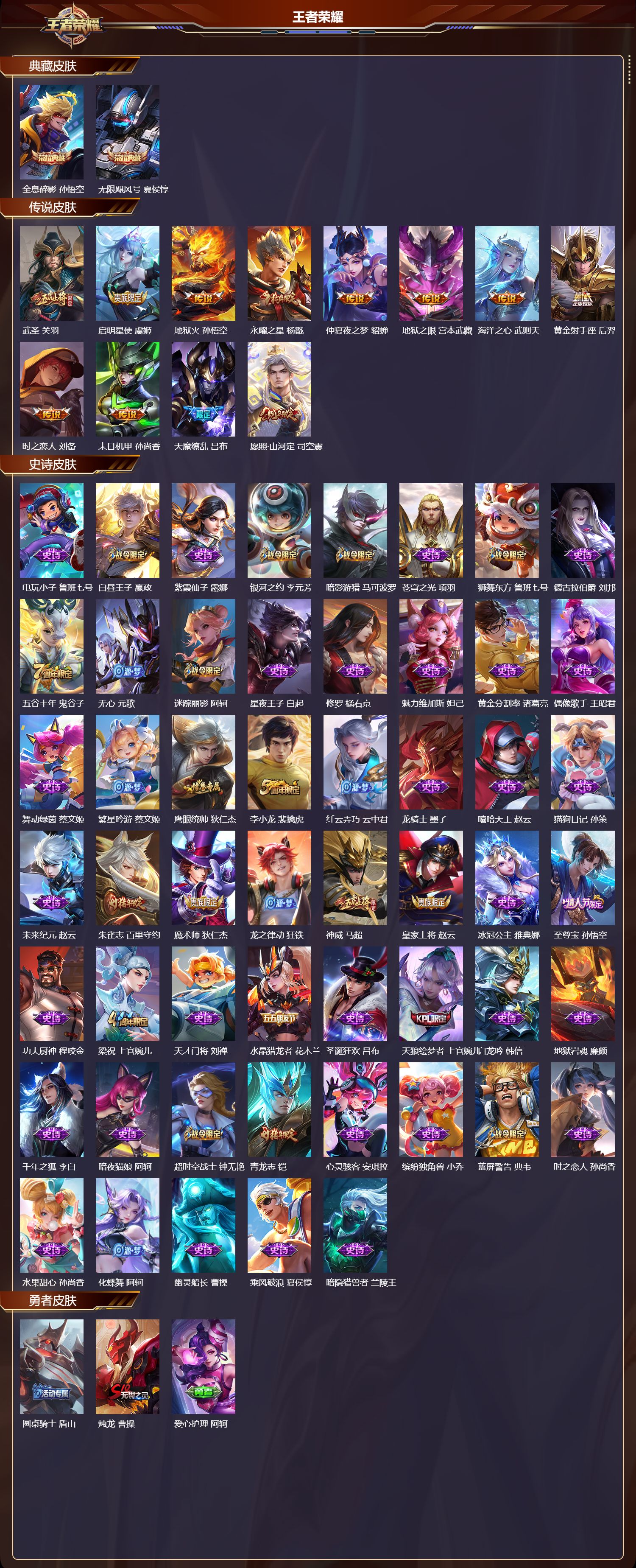 _2098625-q/永恒钻石/230皮肤/125英雄/2典藏/0珍品无双/0无双/0珍品传说/12传说/53史诗/9稀有英雄 【2典藏皮肤】全息碎影孙悟空无限飓风号夏侯惇 【12传说皮肤】武圣关羽启明星使虞姬地狱火孙悟空永曜之星杨戬仲夏夜之梦貂蝉地狱之眼宫本武藏海洋之心武则天黄金射手座后羿时之恋人刘备末日机甲孙尚香天魔缭乱吕布愿照·山河定司空震 【53史诗皮肤】电玩小子鲁班七号白昼王子嬴政紫霞仙子露娜银河之约李元芳暗影游猎马可波罗苍穹之光项羽狮舞东方鲁班七号德古拉伯爵刘邦五谷丰年鬼谷子无心元歌迷踪丽影阿轲星夜王子白起修罗橘右京魅力维加斯妲己黄金分割率诸葛亮偶像歌手王昭君舞动绿茵蔡文姬繁星吟游蔡文姬鹰眼统帅狄仁杰李小龙裴擒虎纤云弄巧云中君龙骑士墨子嘻哈天王赵云猫狗日记孙策未来纪元赵云朱雀志百里守约魔术师狄仁杰龙之律动狂铁神威马超皇家上将赵云冰冠公主雅典娜至尊宝孙悟空功夫厨神程咬金梁祝上官婉儿天才门将刘禅水晶猎龙者花木兰圣诞狂欢吕布天狼绘梦者上官婉儿白龙吟韩信地狱岩魂廉颇千年之狐李白暗夜猫娘阿轲超时空战士钟无艳青龙志铠心灵骇客安琪拉缤纷独角兽小乔蓝屏警告典韦时之恋人孙尚香水果甜心孙尚香化蝶舞阿轲幽灵船长曹操乘风破浪夏侯惇暗隐猎兽者兰陵王 【105勇者皮肤】圆桌骑士盾山烛龙曹操爱心护理阿轲拳王达摩大发明家达摩丁香结小乔功夫炙烤廉颇沉稳之力孙尚香女武神艾琳朔风刀夏侯惇醍醐杖老夫子朔望之晖女娲归虚梦演孙膑汉昭烈帝刘备白色死神白起黄金武士典韦落雪兰心甄姬夺宝奇兵刘邦御旌牛魔阴阳师狄仁杰炼金王扁鹊次元突破哪吒科学大爆炸项羽戏梦巡演空空儿功夫老勺老夫子鲨炮海盗猫沈梦溪海滩派对项羽万华元夜狄仁杰无尽征程廉颇制霸全明星牛魔演武夺筹程咬金红桃皇后芈月奇妙博物学庄周猎兽之王吕布野性能量吕布守护之力大乔无双福将程咬金原初探秘者鬼谷子星空之诺沈梦溪潮玩探月行猪八戒西部大镖客猪八戒疑决卦明世隐如懿安琪拉化身博士扁鹊五福同心张飞幻乐之宴鬼谷子东方不败武则天霸王丸宫本武藏虹云星官明世隐赤莲之焰周瑜死亡骑士亚瑟玩偶对对碰安琪拉掌控之力诸葛亮海滩丽影钟无艳落日弦歌高渐离忍·炎影赵云狰白起重明芈月坚韧之力苏烈万事如意刘备擒涛扼浪裴擒虎乓乓大师鲁班大师探海日志鲁班大师天使之翼孙膑兔女郎花木兰龙腾万里关羽未来纪元宫本武藏零食大作战姬小满花好人间甄姬潮玩造梦师刘备御銮盾山单词大作战雅典娜时尚教父姜子牙秘密基地刘禅教廷特使韩信街头霸王韩信云中旅人李元芳西部大镖客孙悟空凯尔特女王虞姬进击墨子号墨子少女阿狸妲己混沌棋弈星御霄米莱狄春野闲踪苏烈布丁狗之约阿古朵命运加冕露娜小满鸭姬小满幻想奇妙夜王昭君驱傩正仪钟馗潮玩士官长雅典娜神迹守卫钟馗死霸装白起虚灵犬护钟馗御狮狂铁白执事赵云饕餮太乙真人剑破天穹刘邦熔金海岸周瑜星梦巡礼姜子牙谧流熔炉太乙真人暗都幽影大司命锦麟游梦庄周灵卦秘语少司缘玫蓝誓约戈娅景韶洛都明世隐 【59其他皮肤】伊势巫女大乔前尘金蝉战争骑士夏侯惇圣殿之光刘邦潮流仙人老夫子三太子哪吒棒球奇才沈梦溪龙域领主铠生化警戒钟无艳死神来了曹操花见巫女伽罗爱与和平苏烈第七人偶干将莫邪万圣前夜小乔灼热之刃李信熊喵少女阿古朵木偶奇遇记鲁班七号帝国元帅项羽精灵王后羿冰刃幻境镜星航指挥官诸葛亮魇语军师司马懿英喵野望刘禅午夜歌剧院元歌隐刃兰陵王霓裳曲杨玉环花间舞公孙离街头旋风裴擒虎东海龙王东皇太一修竹墨客上官婉儿剑舞者花木兰范海辛李白维京掠夺者苍归虚梦演蒙犽激情绿茵马可波罗埃及法老杨戬阿摩司公爵鬼谷子画中游桑启年年有余猪八戒天堂福音张良西部大镖客孙悟空归虚梦演曜华尔街大亨程咬金威尼斯狂欢百里玄策幸存者马超战争女神雅典娜荷鲁斯之眼云中君创世神祝盘古特种部队李元芳绝影神呛百里守约森瑶孤猎澜踏雪寻梅弈星秩序猎龙将蒙恬精灵公主王昭君赤焰之缨云缨露花倒影嫦娥地府判官钟馗美梦成真梦奇 【9稀有英雄】武则天嬴政不知火舞橘右京夏洛特娜可露露韩信艾琳赵云 营地id:335169404