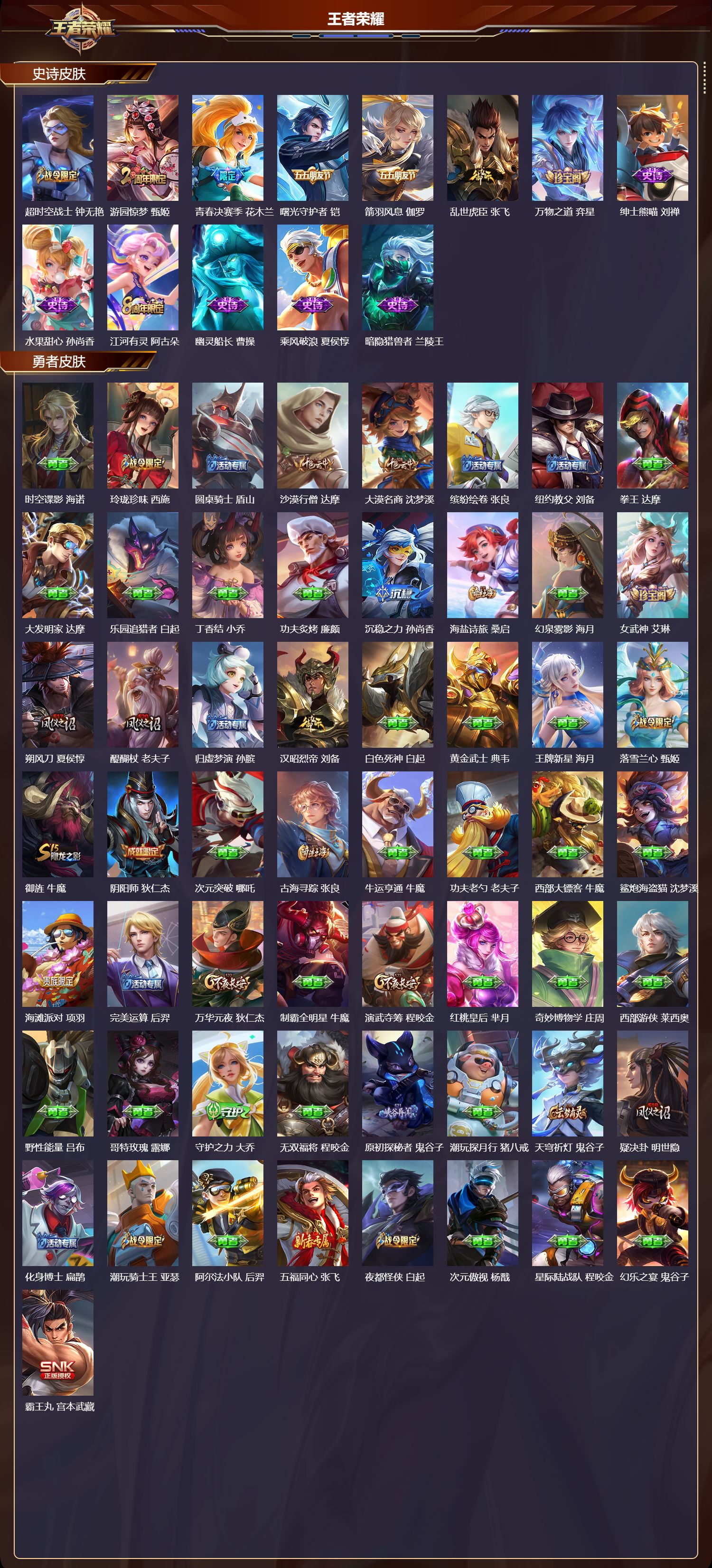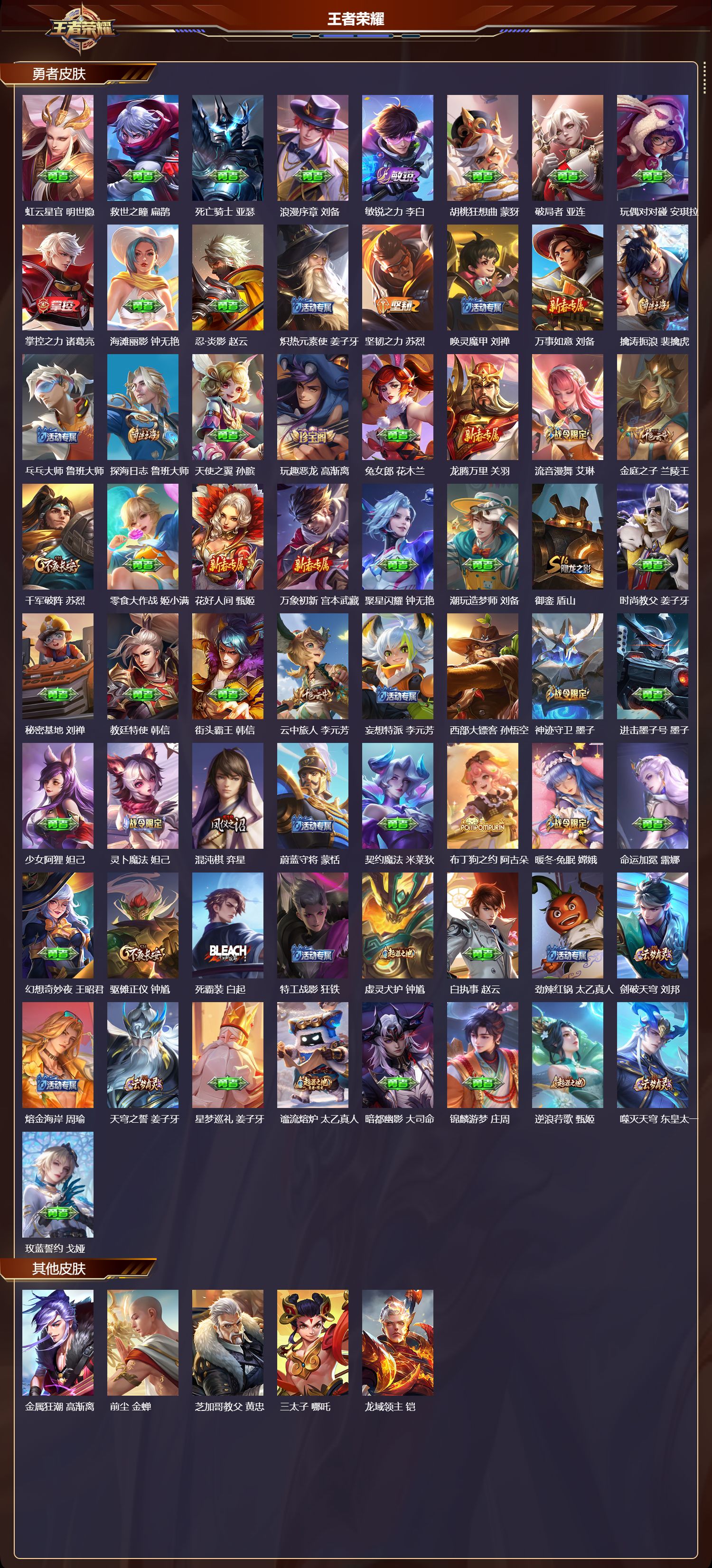 _2113381-q/至尊星耀/267皮肤/125英雄/1典藏/0珍品无双/0无双/0珍品传说/14传说/68史诗/9稀有英雄 【1典藏皮肤】鸣剑·曳影李白 【14传说皮肤】启明星使虞姬无双飞将马超白虎志百里玄策诗剑行李白猫影幻舞貂蝉武陵仙君诸葛亮炽阳神光镜绯月行不知火舞末日机甲孙尚香山海·炽霜斩李信绛天战甲铠寅虎·赤拳裴擒虎山海·苍雷引曜鸣野蒿桑启 【68史诗皮肤】电玩小子鲁班七号百解令蒙犽高山流水庄周匿光追影者镜燃音魔法高渐离冰霜恋舞曲干将莫邪苍穹之光项羽德古拉伯爵刘邦山海·玄木吟马可波罗五谷丰年鬼谷子无心元歌鬼剑武藏宫本武藏无限星赏官公孙离地狱燃心司空震摇滚巨星嬴政冰锋战神关羽修罗橘右京拒霜思嫦娥黄金分割率诸葛亮偶像歌手王昭君荣光圣徽蒙恬女仆咖啡妲己星界游侠暃晚萤娜可露露猪悟能猪八戒鹰眼统帅狄仁杰大圣娶亲孙悟空李小龙裴擒虎纤云弄巧云中君金属风暴墨子傲雪梅呛韩信特工魅影百里守约原初追逐者百里玄策逐浪之夏李元芳朱雀志百里守约黎明之约雅典娜驭风魔法戈娅魔术师狄仁杰神威马超皇家上将赵云冰冠公主雅典娜功夫厨神程咬金东方月初大司命梁祝上官婉儿电玩·爆裂旋风刘禅天才门将刘禅圣诞恋歌貂蝉云间偶戏元歌水晶猎龙者花木兰一生所爱露娜圣诞狂欢吕布冰雪圆舞曲甄姬航海奇遇记老夫子千年之狐李白节奏热浪阿轲超时空战士钟无艳游园惊梦甄姬青春决赛季花木兰曙光守护者铠箭羽风息伽罗乱世虎臣张飞万物之道弈星绅士熊喵刘禅水果甜心孙尚香江河有灵阿古朵幽灵船长曹操乘风破浪夏侯惇暗隐猎兽者兰陵王 【122勇者皮肤】时空谍影海诺玲珑珍味西施圆桌骑士盾山沙漠行僧达摩大漠名商沈梦溪缤纷绘卷张良纽约教父刘备拳王达摩大发明家达摩乐园追猎者白起丁香结小乔功夫炙烤廉颇沉稳之力孙尚香海盐诗旅桑启幻泉雾影海月女武神艾琳朔风刀夏侯惇醍醐杖老夫子归虚梦演孙膑汉昭烈帝刘备白色死神白起黄金武士典韦王牌新星海月落雪兰心甄姬御旌牛魔阴阳师狄仁杰次元突破哪吒古海寻踪张良牛运亨通牛魔功夫老勺老夫子西部大镖客牛魔鲨炮海盗猫沈梦溪海滩派对项羽完美运算后羿万华元夜狄仁杰制霸全明星牛魔演武夺筹程咬金红桃皇后芈月奇妙博物学庄周西部游侠莱西奥野性能量吕布哥特玫瑰露娜守护之力大乔无双福将程咬金原初探秘者鬼谷子潮玩探月行猪八戒天穹祈灯鬼谷子疑决卦明世隐化身博士扁鹊潮玩骑士王亚瑟阿尔法小队后羿五福同心张飞夜都怪侠白起次元傲视杨戬星际陆战队程咬金幻乐之宴鬼谷子霸王丸宫本武藏虹云星官明世隐救世之瞳扁鹊死亡骑士亚瑟浪漫序章刘备敏锐之力李白胡桃狂想曲蒙犽破局者亚连玩偶对对碰安琪拉掌控之力诸葛亮海滩丽影钟无艳忍·炎影赵云炽热元素使姜子牙坚韧之力苏烈唤灵魔甲刘禅万事如意刘备擒涛扼浪裴擒虎乓乓大师鲁班大师探海日志鲁班大师天使之翼孙膑玩趣恶龙高渐离兔女郎花木兰龙腾万里关羽流音漫舞艾琳金庭之子兰陵王千军破阵苏烈零食大作战姬小满花好人间甄姬万象初新宫本武藏聚星闪耀钟无艳潮玩造梦师刘备御銮盾山时尚教父姜子牙秘密基地刘禅教廷特使韩信街头霸王韩信云中旅人李元芳妄想特派李元芳西部大镖客孙悟空神迹守卫墨子进击墨子号墨子少女阿狸妲己灵卜魔法妲己混沌棋弈星蔚蓝守将蒙恬契约魔法米莱狄布丁狗之约阿古朵暖冬·兔眠嫦娥命运加冕露娜幻想奇妙夜王昭君驱傩正仪钟馗死霸装白起特工战影狂铁虚灵犬护钟馗白执事赵云劲辣红锅太乙真人剑破天穹刘邦熔金海岸周瑜天穹之誓姜子牙星梦巡礼姜子牙谧流熔炉太乙真人暗都幽影大司命锦麟游梦庄周逆浪荇歌甄姬噬灭天穹东皇太一玫蓝誓约戈娅 【62其他皮肤】金属狂潮高渐离前尘金蝉芝加哥教父黄忠三太子哪吒龙域领主铠生化警戒钟无艳死神来了曹操超能战警曹操花见巫女伽罗爱与和平苏烈第七人偶干将莫邪灼热之刃李信熊喵少女阿古朵海之征途孙策木偶奇遇记鲁班七号福禄兄弟鲁班七号帝国元帅项羽精灵王后羿绯红之刃露娜冰刃幻境镜碧珀绯影暃海军大将周瑜魇语军师司马懿英喵野望刘禅午夜歌剧院元歌启蛰司空震花间舞公孙离异域舞娘貂蝉街头旋风裴擒虎剑舞者花木兰范海辛李白维京掠夺者苍占星师明世隐归虚梦演蒙犽激情绿茵马可波罗埃及法老杨戬归虚梦演西施阿摩司公爵鬼谷子年年有余猪八戒尼罗河女神女娲西部大镖客孙悟空锦衣卫狄仁杰一千零一夜张良归虚梦演曜威尼斯狂欢百里玄策幸存者马超战争女神雅典娜荷鲁斯之眼云中君创世神祝盘古特种部队李元芳绝影神呛百里守约森瑶孤猎澜加勒比小姐虞姬踏雪寻梅弈星秩序猎龙将蒙恬精准探案法米莱狄赤焰之缨云缨露花倒影嫦娥地府判官钟馗美梦成真梦奇圆桌骑士太乙真人 【9稀有英雄】敖隐嬴政不知火舞橘右京夏洛特娜可露露韩信艾琳赵云 营地id:349856090