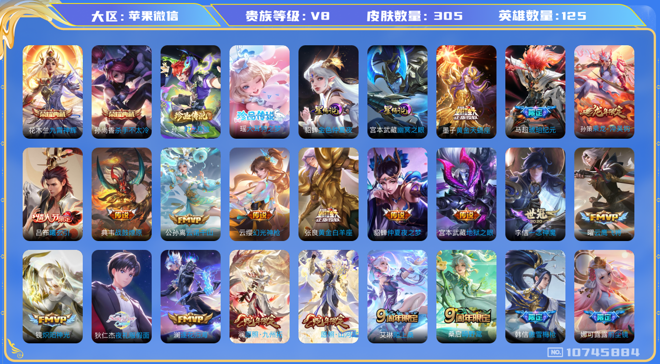 [10745884]实名: 可修改 贵族等级: v8 英雄数: 125 皮肤数: 305 荣耀水晶: 杀手不太冷九霄神辉 珍品传说: 时之奇旅-孙策大耳狗之梦 星传说: 幽冥之眼金色仲夏夜 传说皮: 云鹰飞将黄金白羊座炽阳神光一念神魔仲夏夜之梦地狱之眼夜礼服假面澜逐花归海琥珀纪元马超乘龙·淬吴钩吕布曦玄引典韦战鼓燎原黄金天蝎座幻光神呛云诺千山 限定皮: 天魔缭乱冰霜恋舞曲如梦令-后羿孙行者傲雪梅呛寅虎·赤拳时之祈愿-云中君玉兔公主前尘镜枫霜尽五谷丰年山海·玄木吟鸣野蒿陌上桑愿照·山河定愿照·九州拓 【由于赛季三个月更新一次,段位皆有上号为准,对段位有要求这谨慎下单!!!】