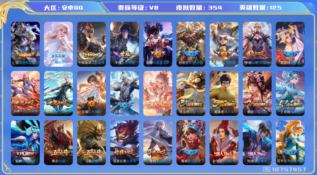 [10757457]【商品标题】:安卓q-v8-最强王者段位-125英雄-354皮肤-1典藏-0珍品无双-1无双-0珍品传说-25传说-97史诗 【荣耀典藏】:铠银白咏叹调 【无双皮肤】:甄姬雪境奇遇 【内测皮肤】:孙尚香蔷薇恋人,嬴政优雅恋人,狂铁特工战影 【传说皮肤】:吕布天魔缭乱,李白凤求凰,貂蝉仲夏夜之梦,百里玄策白虎志,干将莫邪久胜战神,李信一念神魔,孙悟空零号赤焰,虞姬启明星使,李元芳飞鸢探春,孙尚香异界灵契,王昭君星穹之声,李白诗剑行,李信山海炽霜斩,夏洛特浮生妄,赵云乘龙铭钟鼎,孙策乘龙淬吴钩,云缨幻光神呛,虞姬愿照岁时盈,蔡文姬愿照福禄聚,澜愿照九州拓,妲己愿照众生和,女娲愿照千秋盛,司空震愿照山河定,后羿千劫归真,西施续相思 【限定皮肤】:白起狰,狄仁杰阴阳师,虞姬凯尔特女王,赵云皇家上将,墨子降魔,嬴政优雅恋人,嬴政白昼王子,孙尚香蔷薇恋人,孙尚香异界灵契,庄周蜃楼王,庄周高山流水,高渐离死亡摇滚,阿轲迷踪丽影,钟无艳王者之锤,钟无艳超时空战士,孙膑妖精王,扁鹊炼金王,扁鹊奇幻香踪,芈月重明,吕布天魔缭乱,吕布猎兽之王,周瑜赤莲之焰,元歌无心,夏侯惇朔风刀,甄姬游园惊梦,甄姬落雪兰心,曹操烛龙,典韦穷奇,典韦蓝屏警告,马可波罗暗影游猎,马可波罗山海玄木吟,狄仁杰魔术师,狄仁杰万华元夜,达摩沙漠行僧,项羽海滩派对,老夫子醍醐杖,貂蝉逐梦之音,程咬金演武夺筹,刘邦夺宝奇兵,王昭君星穹之声,兰陵王驯魔猎人,兰陵王金庭之子,花木兰青春决赛季,亚瑟狮心王,孙悟空至尊宝,孙悟空大圣娶亲,孙悟空零号赤焰,牛魔御旌,李元芳银河之约,李元芳云中旅人,虞姬霸王别姬,虞姬启明星使,钟馗驱傩正仪,杨玉环遇见飞天,杨戬潮玩骑兵,女娲朔望之晖,雅典娜单词大作战,雅典娜黎明之约,蔡文姬繁星吟游,太乙真人饕餮,太乙真人华丽摇滚,鬼谷子原初探秘者,鬼谷子五谷丰年,黄忠烈魂,苏烈千军破阵,百里玄策白虎志,百里玄策原初追逐者,弈星混沌棋,梦奇顽趣,沈梦溪星空之诺,沈梦溪大漠名商,明世隐疑决卦,裴擒虎李小龙,裴擒虎擒涛扼浪,狂铁御狮,米莱狄御霄,云中君纤云弄巧,李信山海炽霜斩,盾山御銮,猪八戒西部大镖客,猪八戒猪悟能,上官婉儿梁祝,嫦娥拒霜思,嫦娥暖冬兔眠,西施玲珑珍味,蒙犽狂想玩偶喵,鲁班大师探海日志,盘古冰霜神祇,桑启海盐诗旅,夏洛特浮生妄,暃星界游侠,戈娅驭风魔法,阿古朵江河有灵,张良古海寻踪,